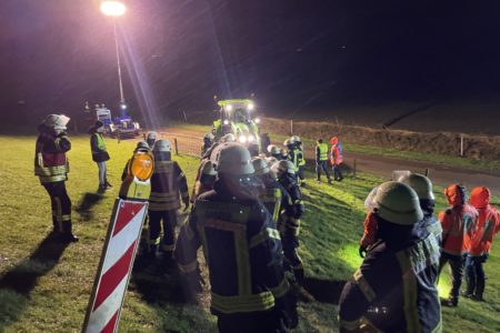 Nach der Überflutung des Großen Meers in Südbrookmerland vergangenen Jahres kam die Deichverteidigungshalle der Deichacht Norden erstmalig zum Einsatz. Gemeinsam mit Vertragspartnern der Norder Deichacht haben die Norder Feuerwehr, das Technische Hilfswerk und die Mitarbeiter der Deichacht damals tausende Sandsäcke gefüllt und zum Großen Meer transportiert. Seitdem tauschen sich die Norder Einsatzkräfte regelmäßig mit der Deichacht aus und entwickeln ein gemeinsames Einsatzkonzept. In kleinen Einheiten wurden seitdem verschiedene Aufgaben beübt und Abläufe verbessert. Nachdem die Abläufe in der Deichverteidigungshalle nun rund laufen, ging es am Dienstag um die Logistik an der Schadensstelle sowie das Ausleuchten der Arbeitsbereiche. Die Deichacht hat entsprechend ihrer Deichkilometer einen Einsatzplan erstellt, der unter anderem Straßensperren und Einbahnstraßenregelungen entlang der Straßen am und zum Deich vorsehen. Durch die genaue Planung wird sichergestellt, dass schwere Fahrzeuge das erforderliche Material und zahlreiche Helfer ungehindert zur Einsatzstelle bringen können. Würden sich zwei Fahrzeuge auf der schmalen einspurigen Straße begegnen, dann wäre die Straße blockiert und die Arbeiten geraten ins Stocken. Oberdeichrichter Carl Noosten hatte die Pläne und den Ablauf vor Übungsbeginn am Hilfeleistungszentrum vorgestellt. Er hatte die Übung mit seinen Mitarbeitern um Holger Fisser sowie Frank Stigler und Reinhold Gleissner von der Norder Feuerwehr sowie Bernd Frerichs vom Ortsverband Norden des THW ausgearbeitet.