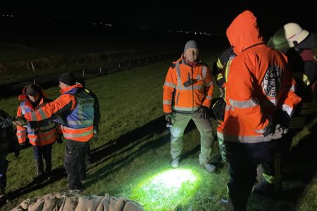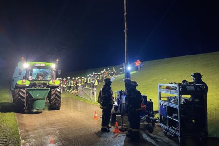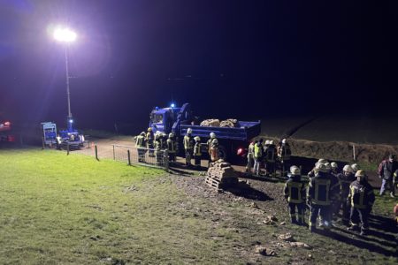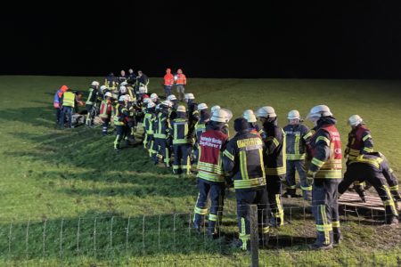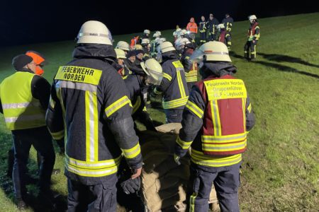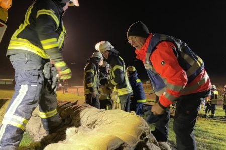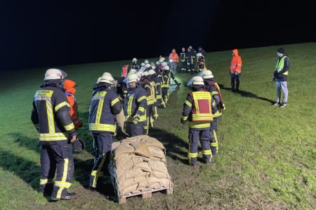 „Das war eine hammerharte Übung“, resümierte Deichrichter Dirk Ackermann am Dienstabend beim Abschluss einer gemeinsamen Übung von Feuerwehr, THW und Deichacht in Norden. Das Wetter war an dem Abend mit kräftigen Windböen und Regenschauern alles andere als schön, aber im Falle einer echten Deichverteidigung wäre es sicher noch viel schlechter. Für die Einsatzkräfte ging es an dem Abend um den Aufbau einer sogenannten Quellkade an einer Schadstelle auf dem Deich in Ostermarsch. Punktuell sollte dort bei einer angenommenen Sturmflut mit drei Metern über dem mittleren Tidehochwasser Seewasser mittig durch den Deich drücken und das Küstenschutzbauwerk allmählich ausspülen. Ohne die Sicherungsmaßnahme würde ein Deichbruch drohen.