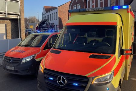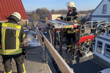 In der Brückstraße in Norden wird derzeit ein großes Mehrparteienhaus errichtet. Dort auf der Baustelle kam es Donnerstagnachmittag zu einem schweren Arbeitsunfall, als ein Maler mit einer Leiter stürzte. Der Handwerker wollte auf der Leiter vom zweiten Obergeschoss ins Dachgeschoss steigen, als diese unter ihm wegrutschte. Rettungsdienst samt Notarzt versorgten den Mann am Unfallort. Da der Verletzte schonend transportiert werden musste, forderte der Rettungsdienst die Freiwillige Feuerwehr Norden an. Nachdem der Verletzte in eine Spezialtrage gebettet wurde, erfolgte der Transport aus dem Gebäude auf dem Korb der Drehleiter. Am Boden angekommen, übernahm der Rettungsdienst den weiteren Transport in ein Krankenhaus. Die Polizei nahm den Arbeitsunfall auf. Für die ehrenamtlichen Mitglieder der Norder Feuerwehr, war dies der 400. Einsatz in diesem Jahr.
