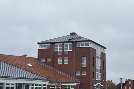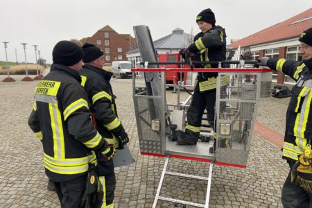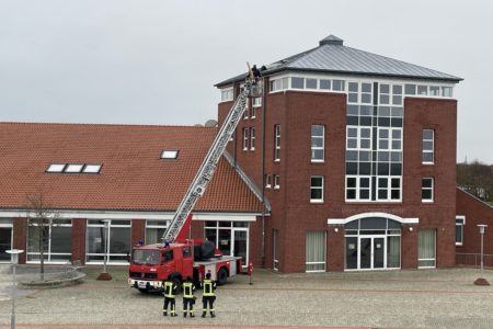 Haustechniker der Klinik Norddeich haben am ersten Arbeitstag nach den Weihnachtsfeiertagen am Mittwochmorgen einen größeren Schaden am Dach der Klinik festgestellt. Der Sturm der letzten Tage hatten ein großes Loch in die Dachhaut gerissen. Die herausgerissenen Blechteile lagen umgeknickt auf dem hohen Gebäude. Da diese bei dem angekündigten Wind in den nächsten Tagen zur Gefahr für die Umgebung werden könnten, bat das Klinikpersonal die Freiwillige Feuerwehr Norden um Hilfe. Diese rückte mit einer Drehleiter an. Gemeinsam mit einem Dachdecker bargen sie die losen Teile und sicherten die Schadstelle mit Latten.