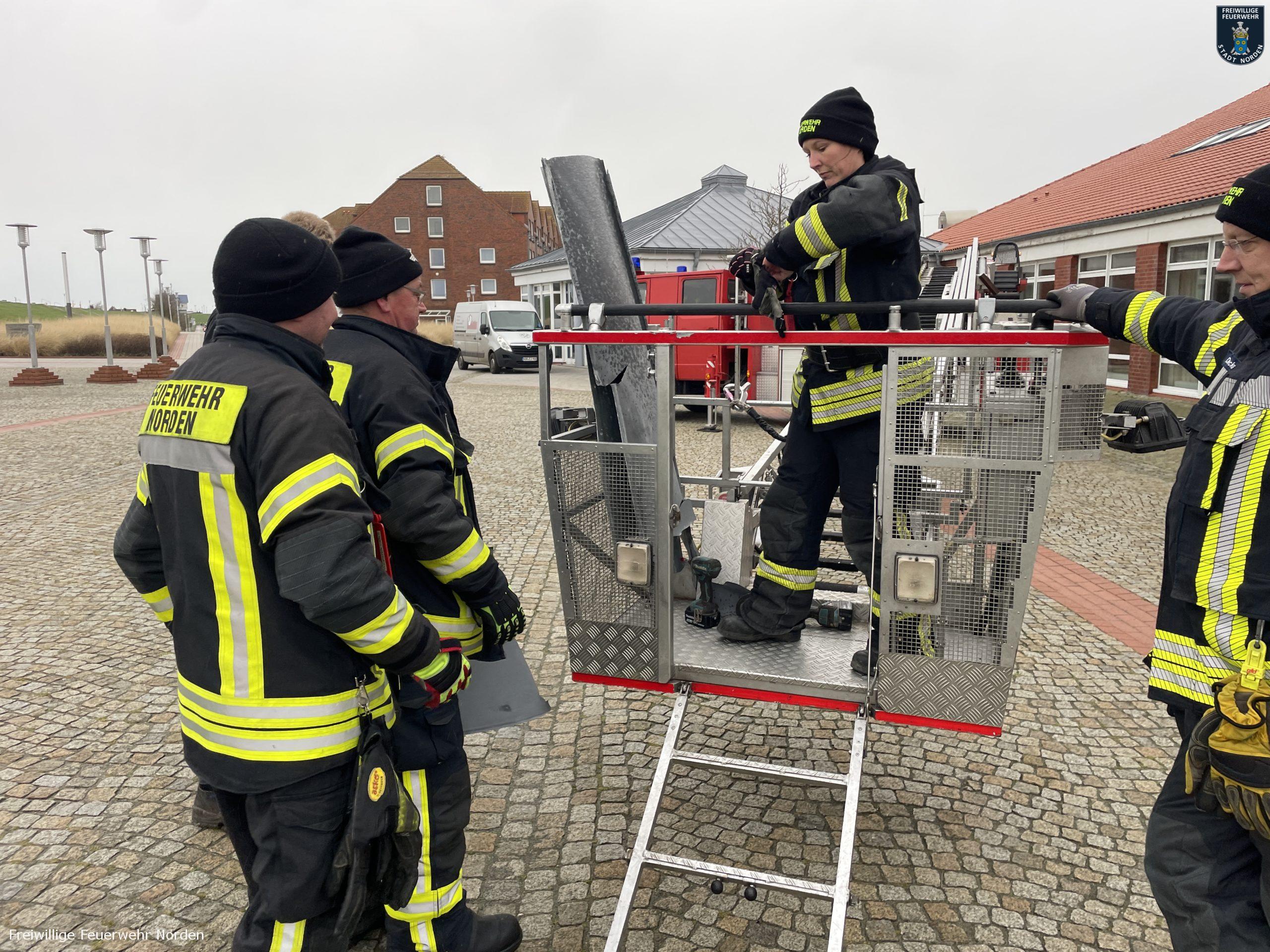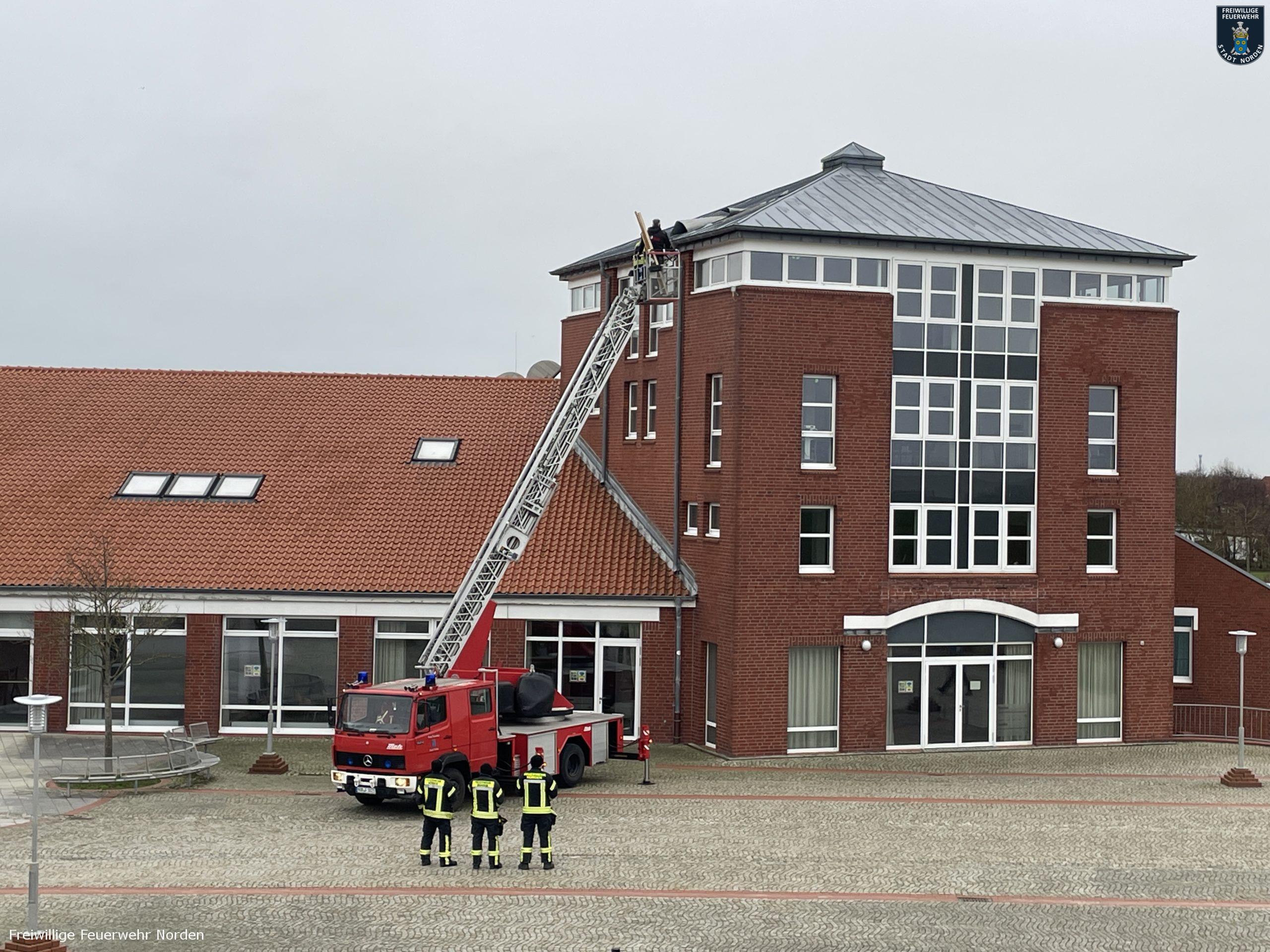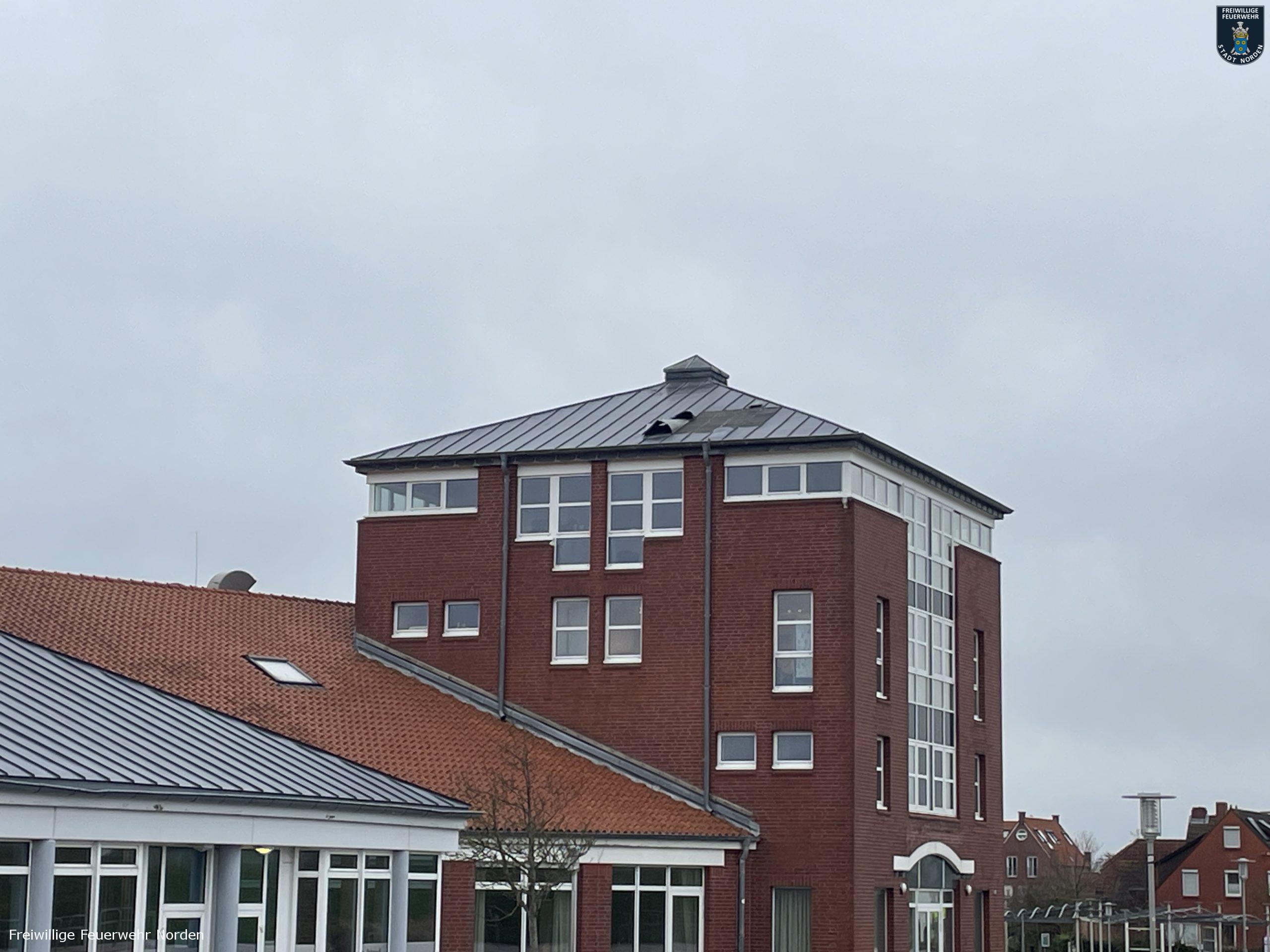 Haustechniker der Klinik Norddeich haben am ersten Arbeitstag nach den Weihnachtsfeiertagen am Mittwochmorgen einen größeren Schaden am Dach der Klinik festgestellt. Der Sturm der letzten Tage hatten ein großes Loch in die Dachhaut gerissen. Die herausgerissenen Blechteile lagen umgeknickt auf dem hohen Gebäude. Da diese bei dem angekündigten Wind in den nächsten Tagen zur Gefahr für die Umgebung werden könnten, bat das Klinikpersonal die Freiwillige Feuerwehr Norden um Hilfe. Diese rückte mit einer Drehleiter an. Gemeinsam mit einem Dachdecker bargen sie die losen Teile und sicherten die Schadstelle mit Latten.