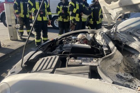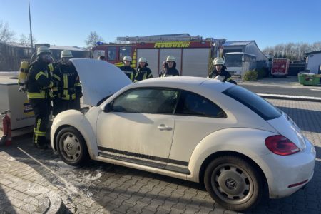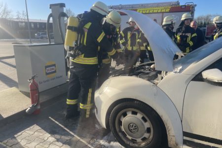 Ein VW Beetle hat am Dienstag während der Fahrt in Norden auf der Bundesstraße Feuer gefangen. Die beiden weiblichen Insassen bemerkten zunächst ungewöhnlichen Geruch und fuhren im Glauben einer gewöhnlichen Panne auf das Gelände einer Tankstelle am Südring. Die Rauchentwicklung nahm dort dann zu und erste Flammen bildeten sich unter der Motorhaube. Während die beiden überraschten Frauen sich und ihren mitreisenden Hund in Sicherheit brachten, eilten gleich mehrere Tankstellenkunden zur Hilfe und brachten zwei Handfeuerlöscher der Tankstelle zum Einsatz. Währenddessen rief eine Mitarbeiterin die Feuerwehr. Die Helfer waren mit ihrem Handeln erfolgreich und löschten den Brand erfolgreich. Die Freiwillige Feuerwehr Norden brauchte so nur noch eine Nachkontrolle durchführen. Neben der Feuerwehr rückte auch die Polizei aus.