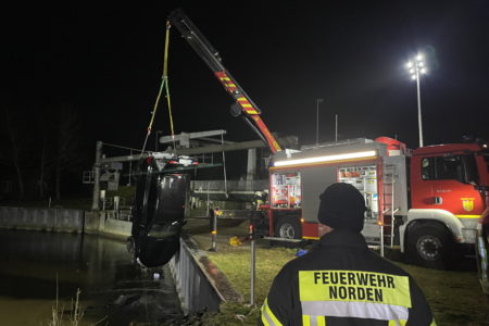 Eine kurze Pause ist einem Autofahrer aus der Krummhörn am Mittwoch teuer zu stehen gekommen. Der Mann legte gegen 22 Uhr in Norden am Lorenzweg eine Rast ein. Hierzu fuhr er auf den Parkplatz am Sammelbecken der Schleuse und des Schöpfwerks Leybuchtsiel. Als er wieder wegfahren wollte, verwechselte er den Rückwärtsgang mit dem Vorwärtsgang und fuhr in das Gewässer. Der Fahrer konnte sich durch ein Seitenfenster rechtzeitig selbst in Sicherheit bringen. Der Audi A3 trieb zunächst weiter an der Wasseroberfläche. Starker Wind trieb den Wagen jedoch schnell raus auf den See, wobei der Autofahrer nur zusehen konnte.