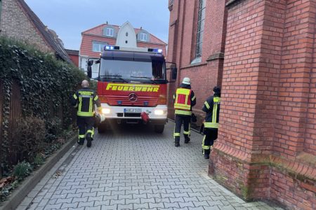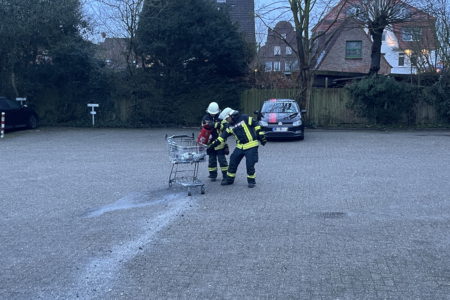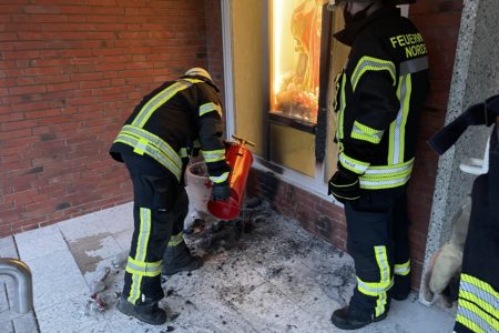 Am Montagmorgen hat das Gemeindehaus der St. Ludgerus Kirchengemeinde in Norden einen leichten Brandschaden erlitten. Gegen 7.10 Uhr brannte unter einem Vordach am Haupteingang ein Einkaufswagen. Eine Passantin hatte den Brand entdeckt und den Notruf gewählt. Eine ersteintreffende Streifenwagenbesatzung zog den Einkaufswagen vom Gebäude weg und setzte einen Handfeuerlöscher ein. Die wenig später anrückende Freiwillige Feuerwehr Norden brauchte so nur noch nachlöschen und das Gebäude im Inneren kontrollieren. Eine Fensterscheibe samt Rahmen wurde durch das Feuer beschädigt.