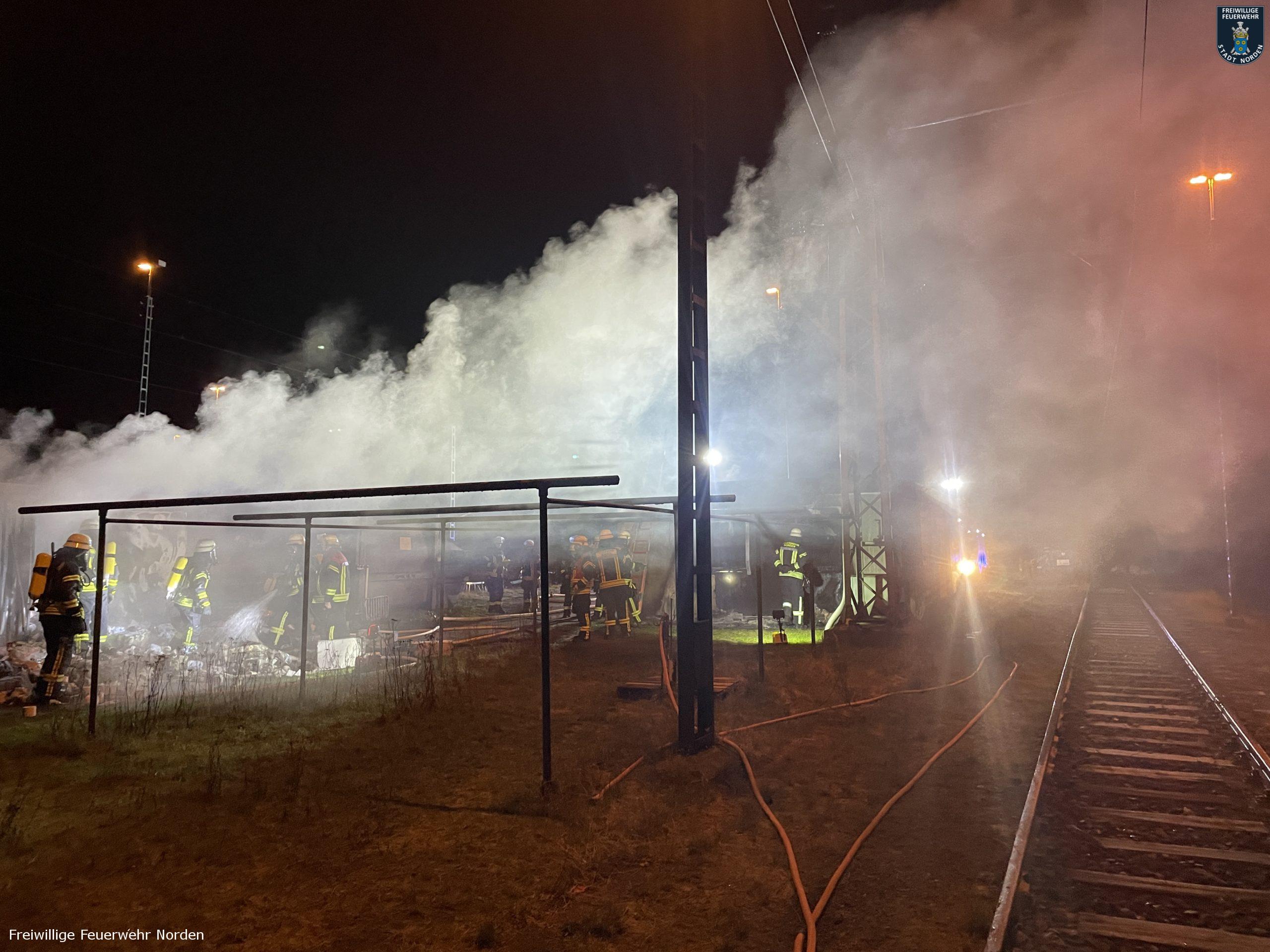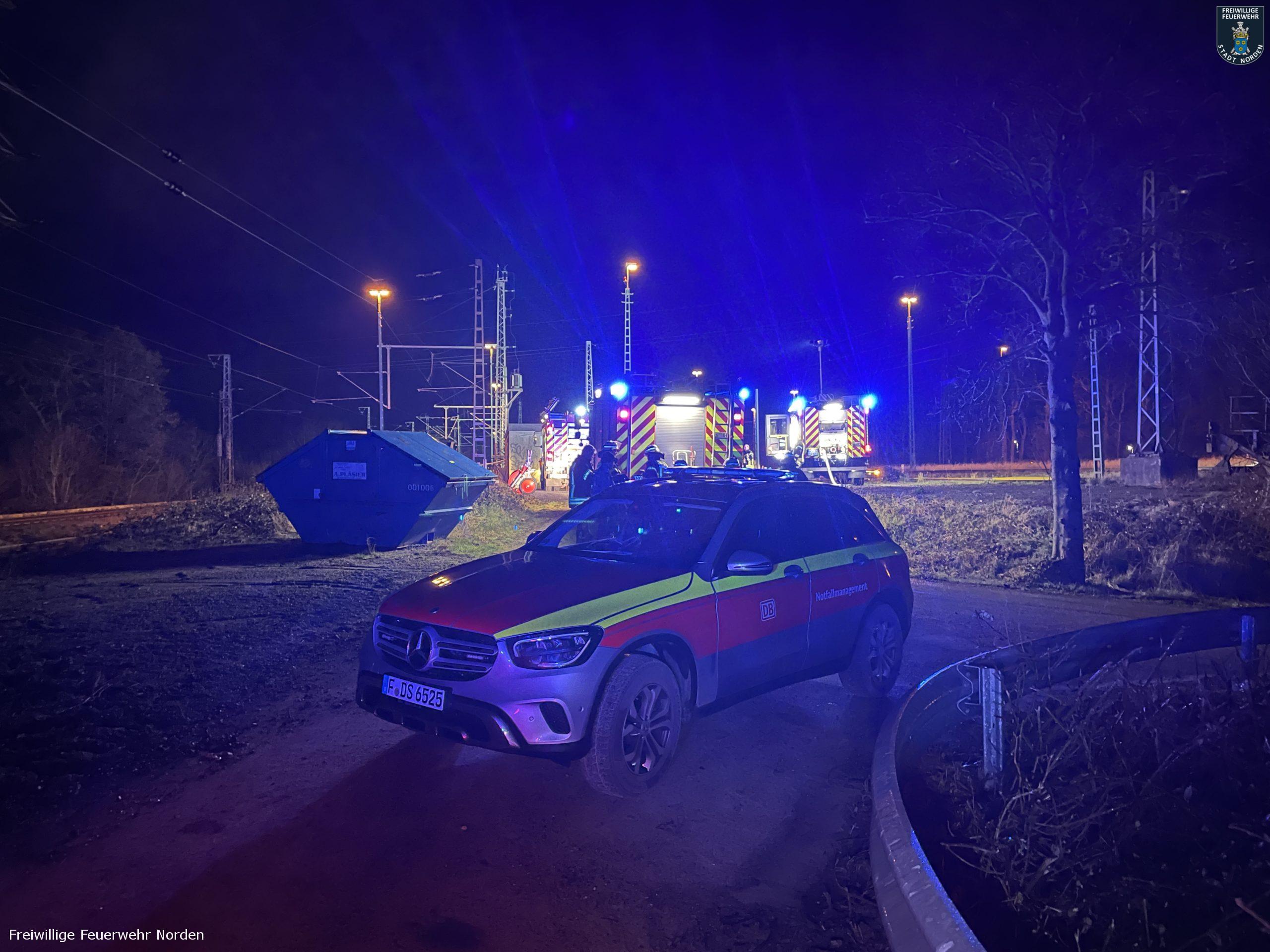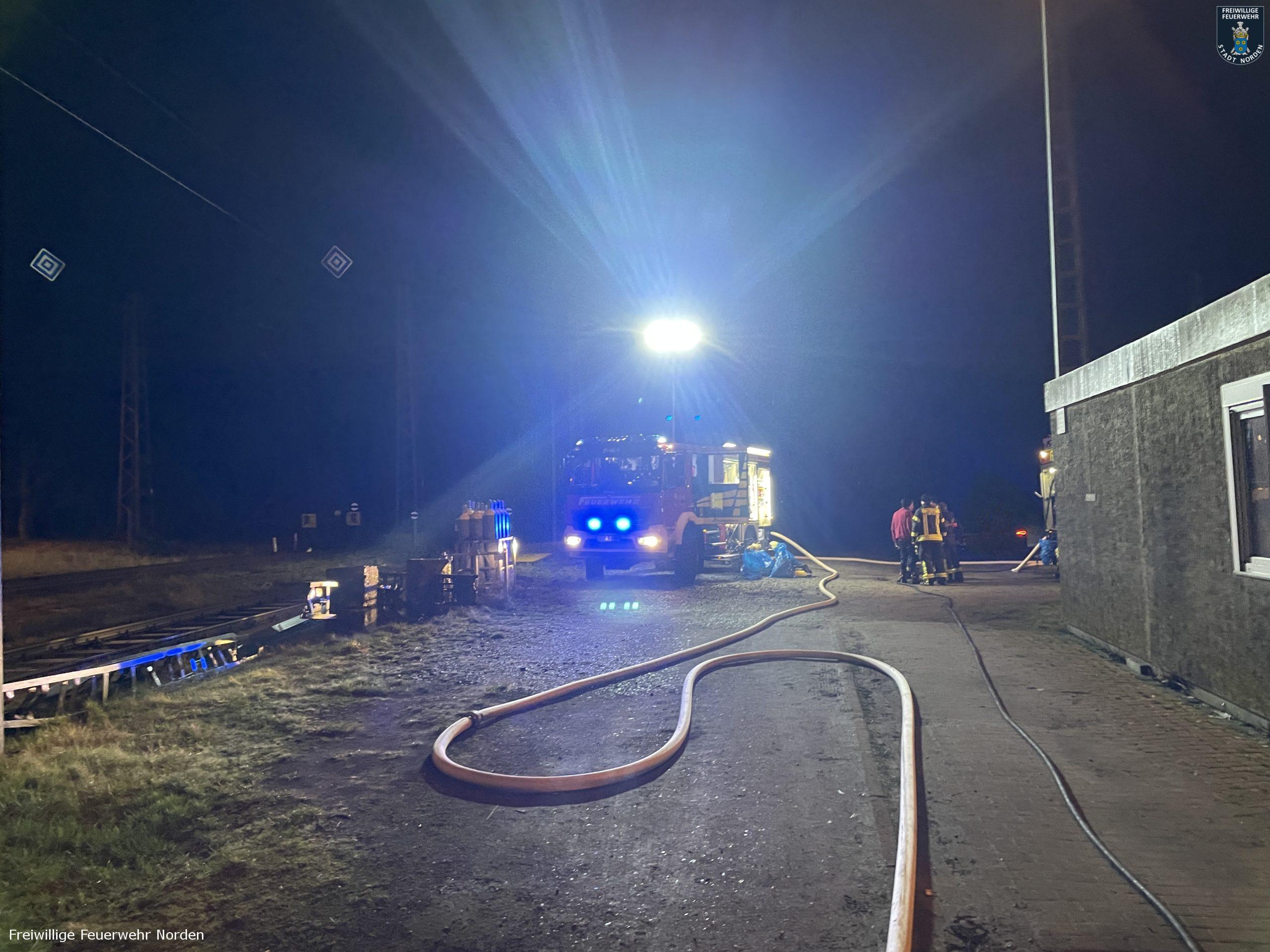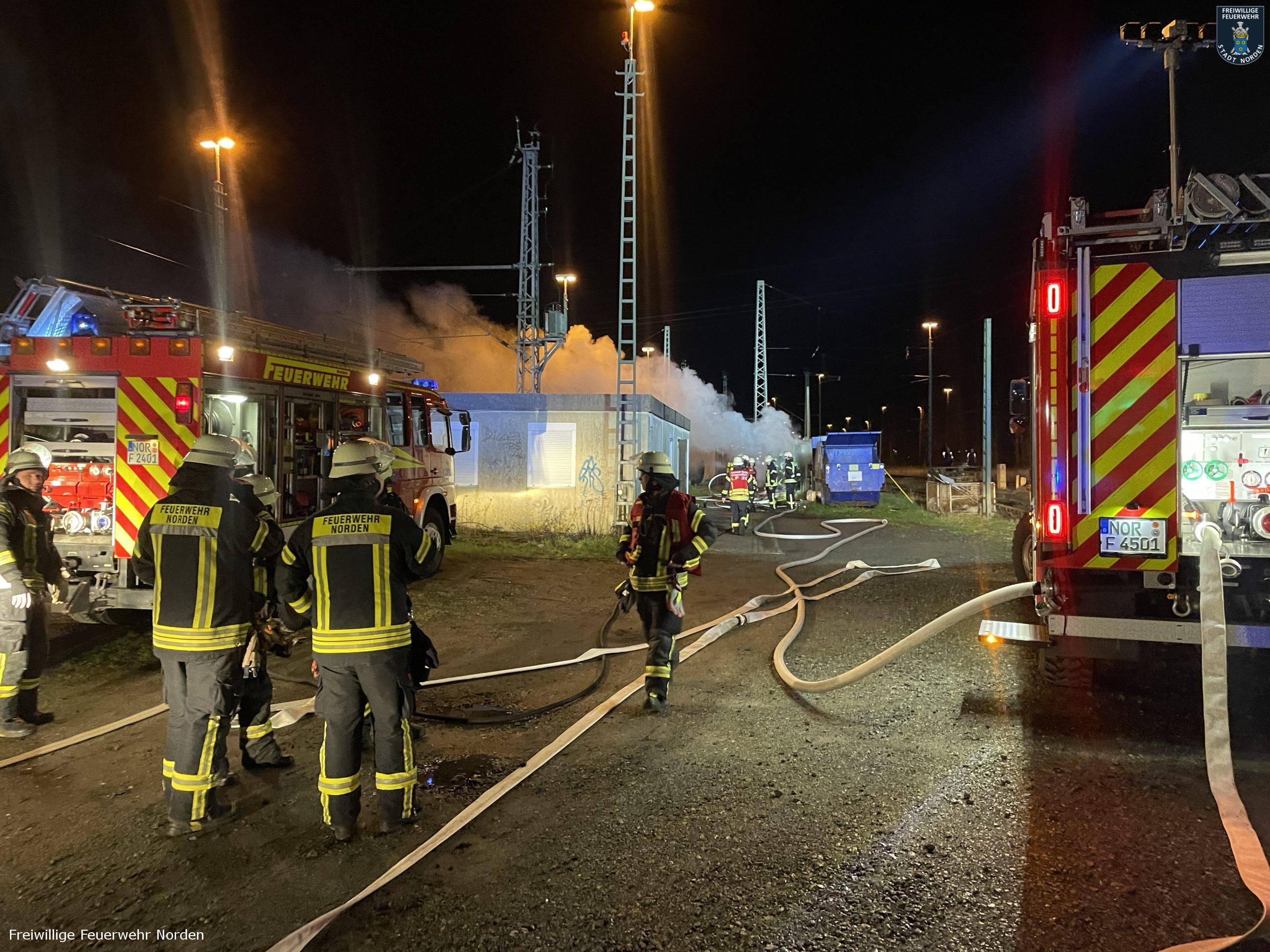 In der Nacht zu Dienstag haben Mitarbeiter der Deutschen Bahn gegen 4 Uhr ein Feuer auf dem Bahnhofsgelände in Norddeich entdeckt. Nach einem ersten Notruf, in dem sie unklaren Feuerschein meldeten, rückte die Freiwillige Feuerwehr Norden aus. Wenig später konkretisierten die Meldenden ihre Beobachtung in einem weiteren Notruf und berichteten, dass ein Sozialgebäude sowie ein Lagercontainer brennen würde. Daraufhin wurde für die Feuerwehr die Alarmstufe erhöht und weitere Kräfte nachalarmiert.