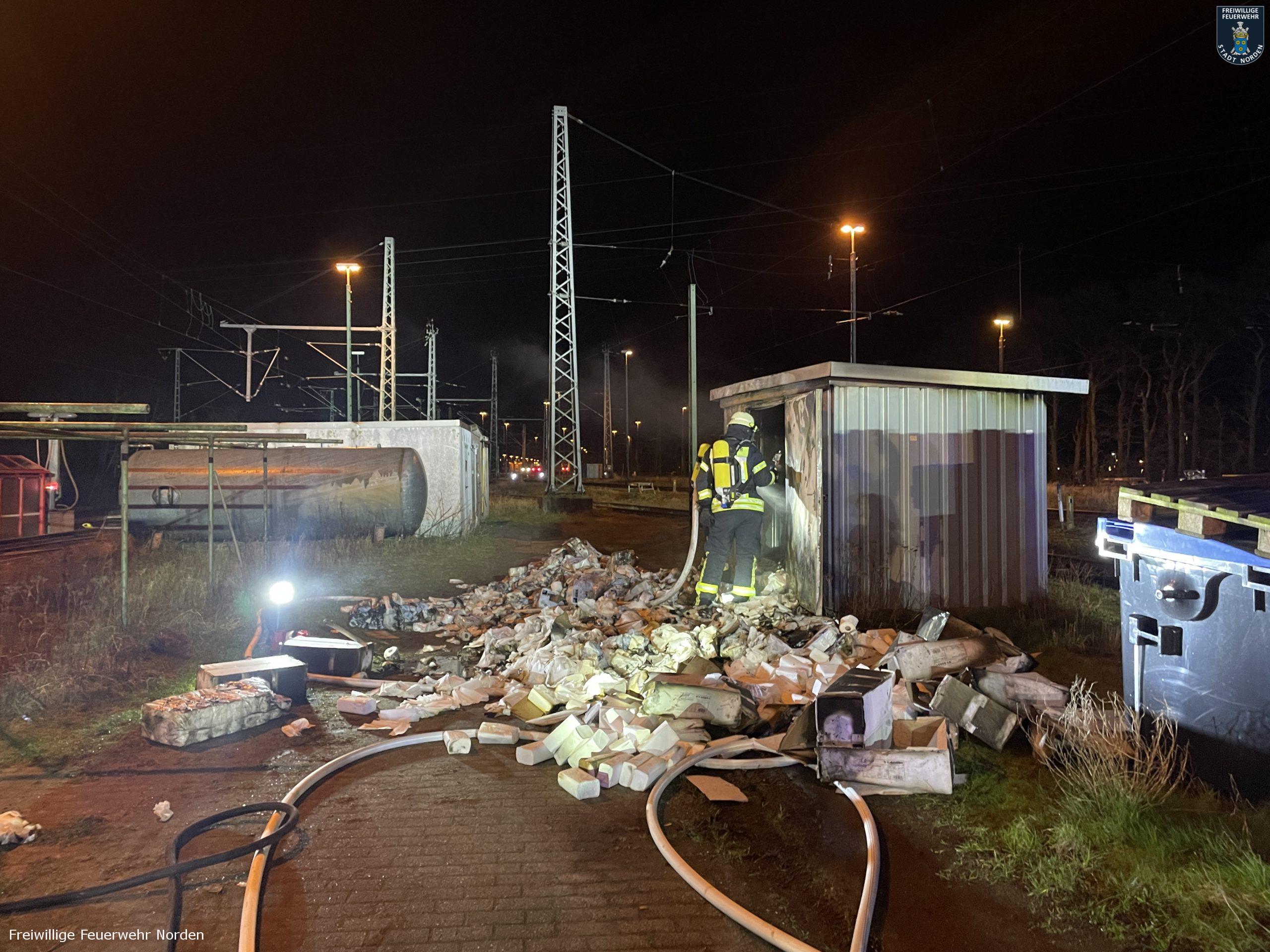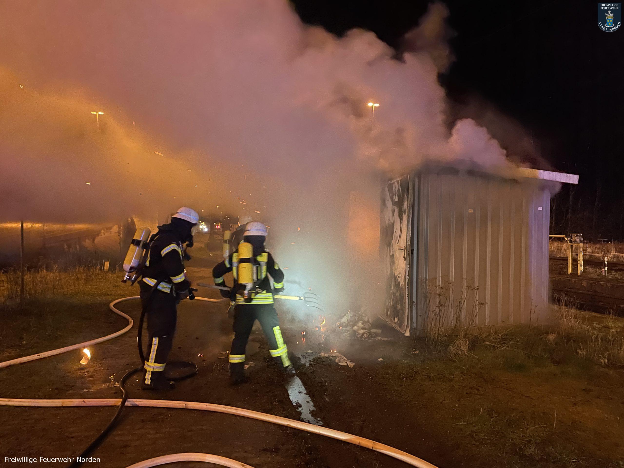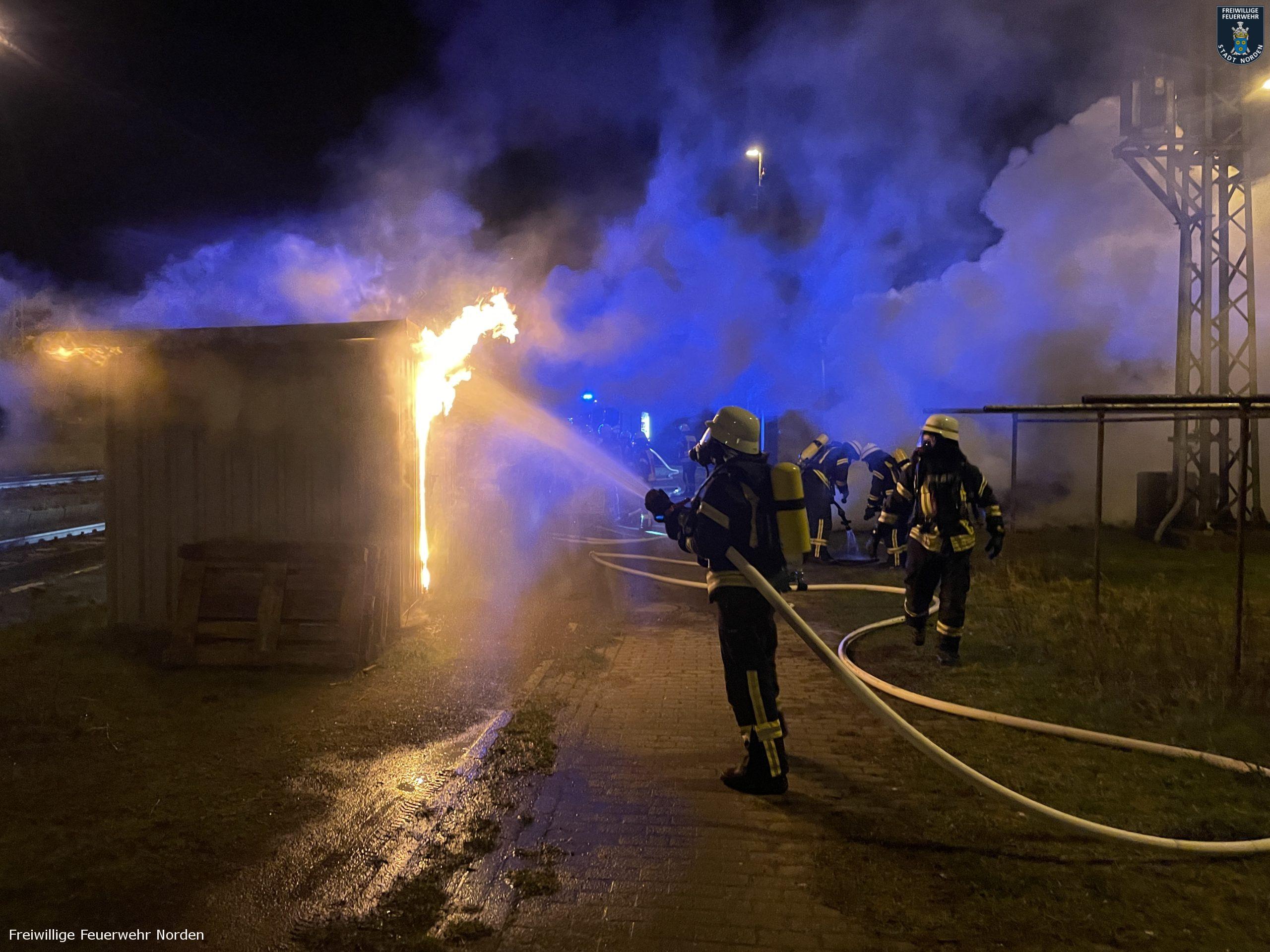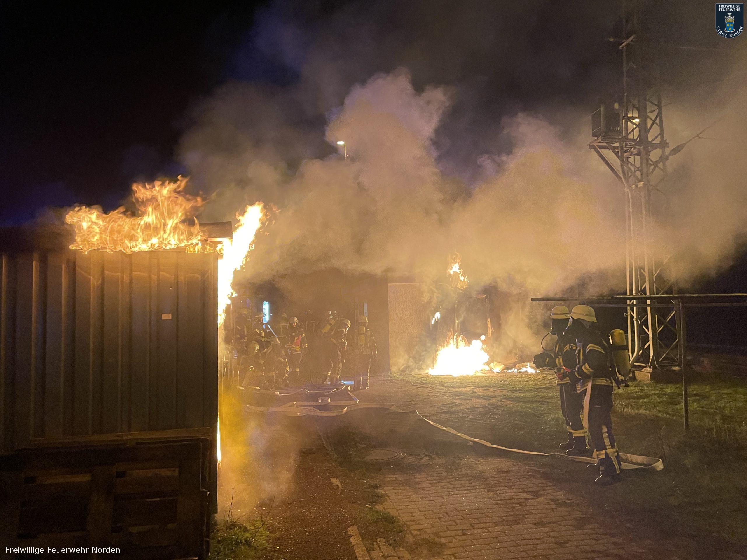 In der Nacht zu Dienstag haben Mitarbeiter der Deutschen Bahn gegen 4 Uhr ein Feuer auf dem Bahnhofsgelände in Norddeich entdeckt. Nach einem ersten Notruf, in dem sie unklaren Feuerschein meldeten, rückte die Freiwillige Feuerwehr Norden aus. Wenig später konkretisierten die Meldenden ihre Beobachtung in einem weiteren Notruf und berichteten, dass ein Sozialgebäude sowie ein Lagercontainer brennen würde. Daraufhin wurde für die Feuerwehr die Alarmstufe erhöht und weitere Kräfte nachalarmiert.