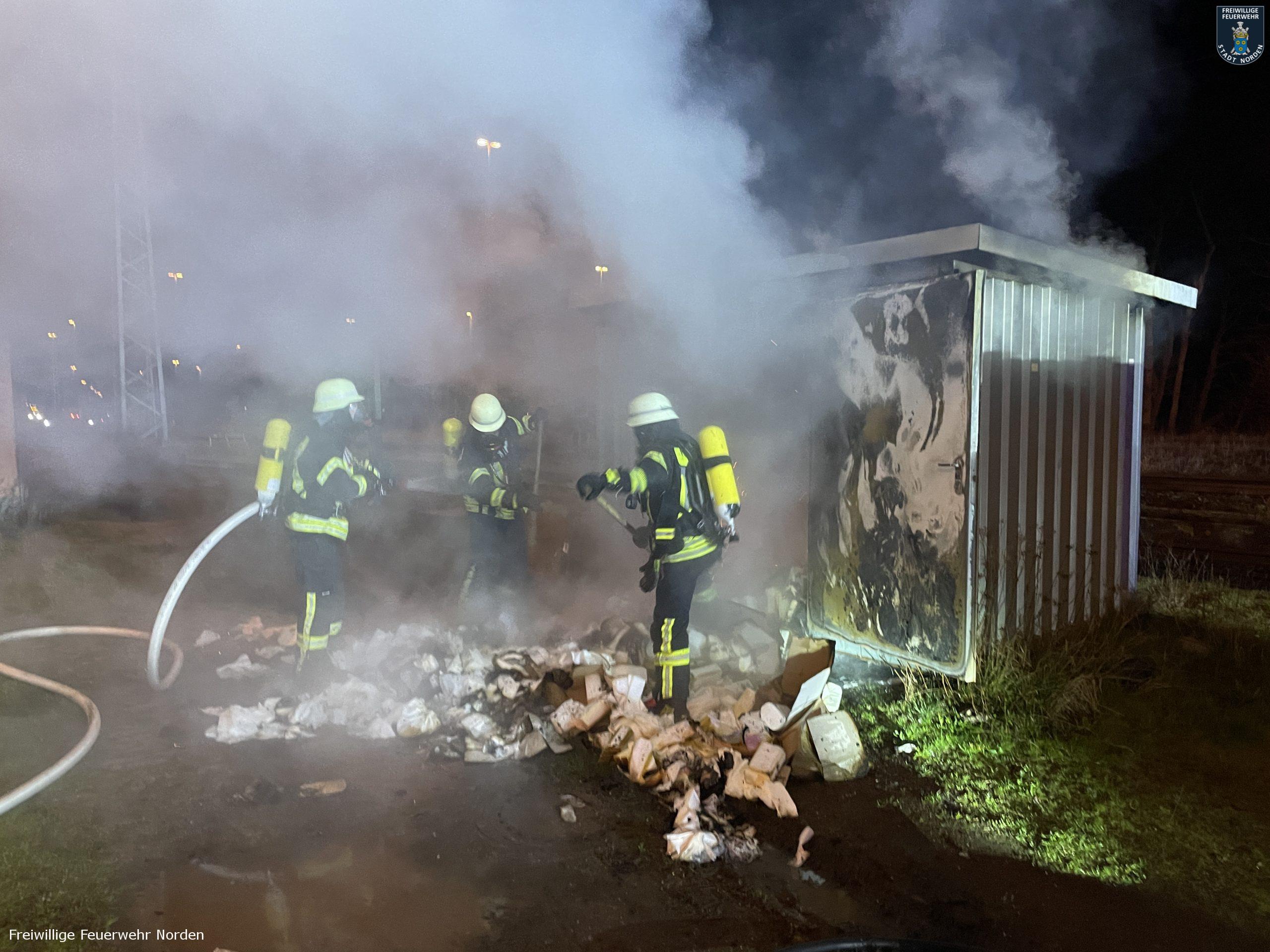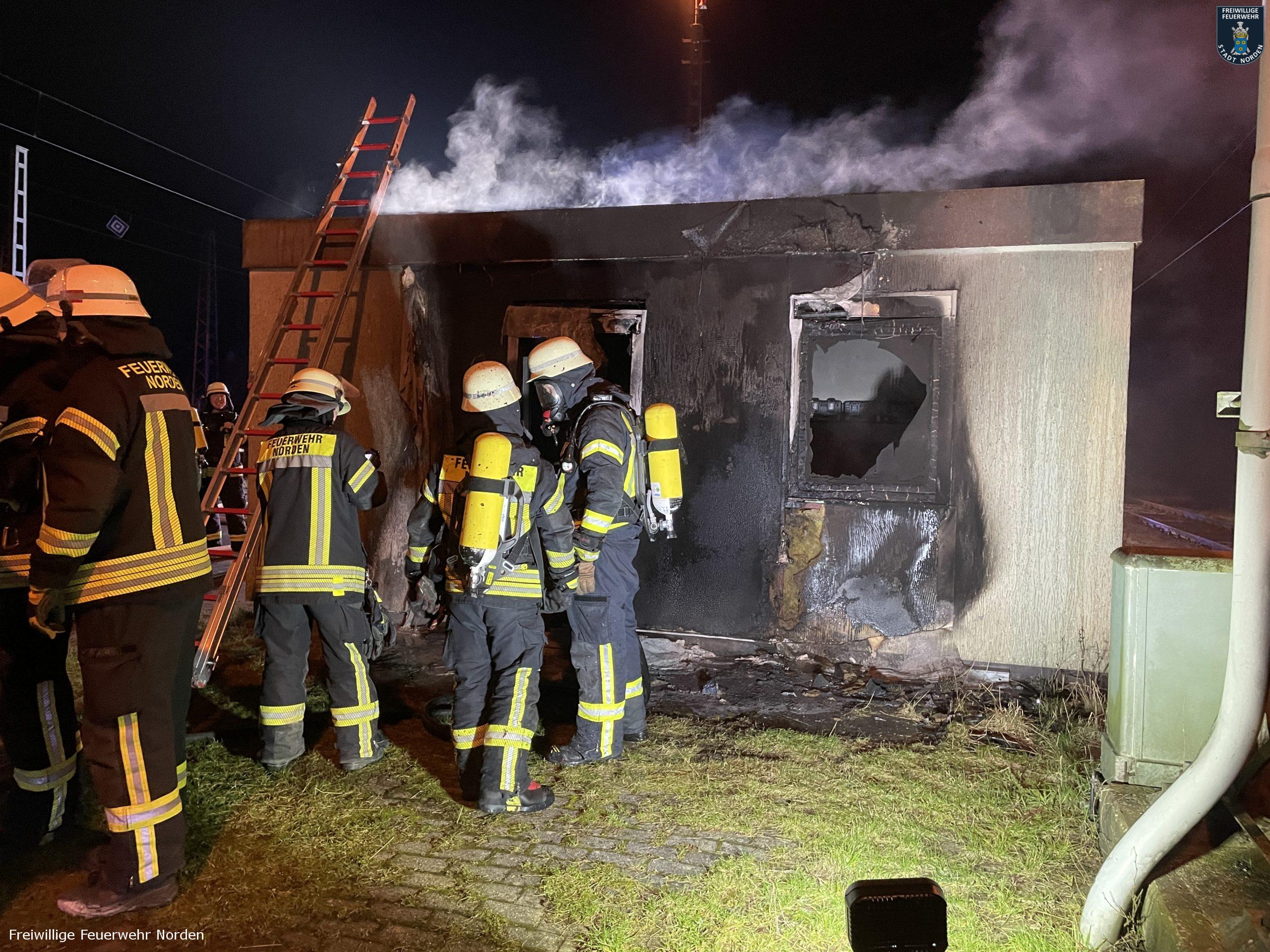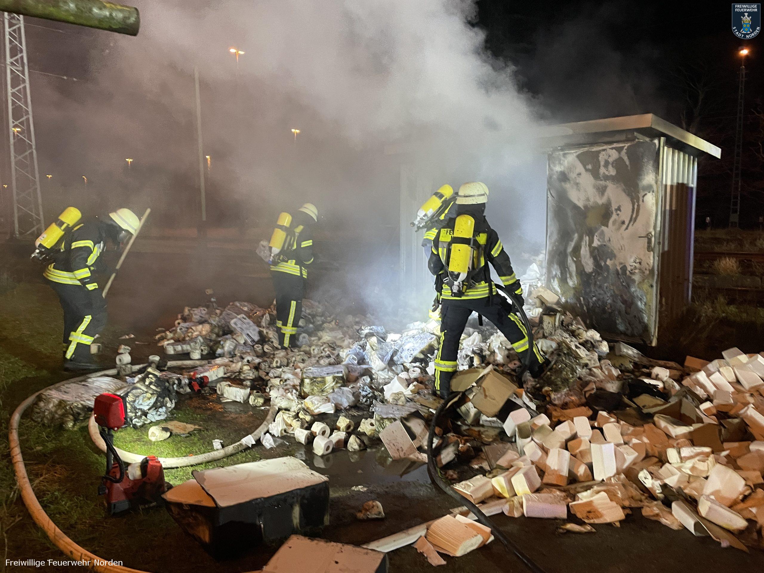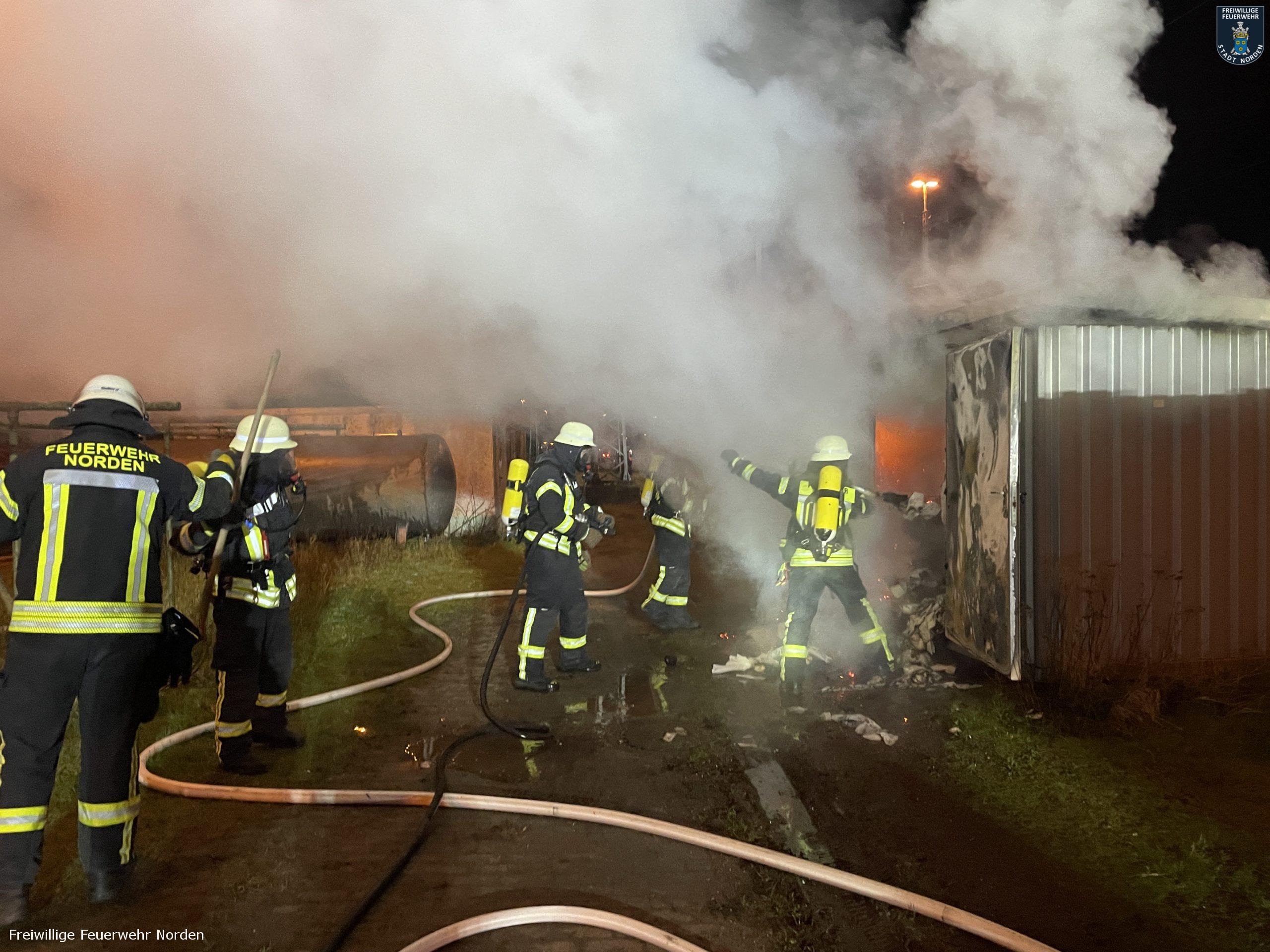 In der Nacht zu Dienstag haben Mitarbeiter der Deutschen Bahn gegen 4 Uhr ein Feuer auf dem Bahnhofsgelände in Norddeich entdeckt. Nach einem ersten Notruf, in dem sie unklaren Feuerschein meldeten, rückte die Freiwillige Feuerwehr Norden aus. Wenig später konkretisierten die Meldenden ihre Beobachtung in einem weiteren Notruf und berichteten, dass ein Sozialgebäude sowie ein Lagercontainer brennen würde. Daraufhin wurde für die Feuerwehr die Alarmstufe erhöht und weitere Kräfte nachalarmiert.