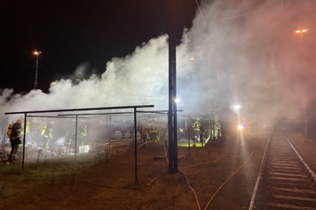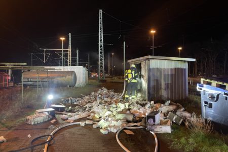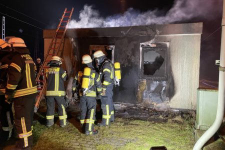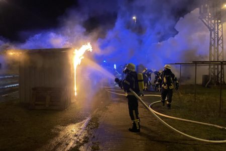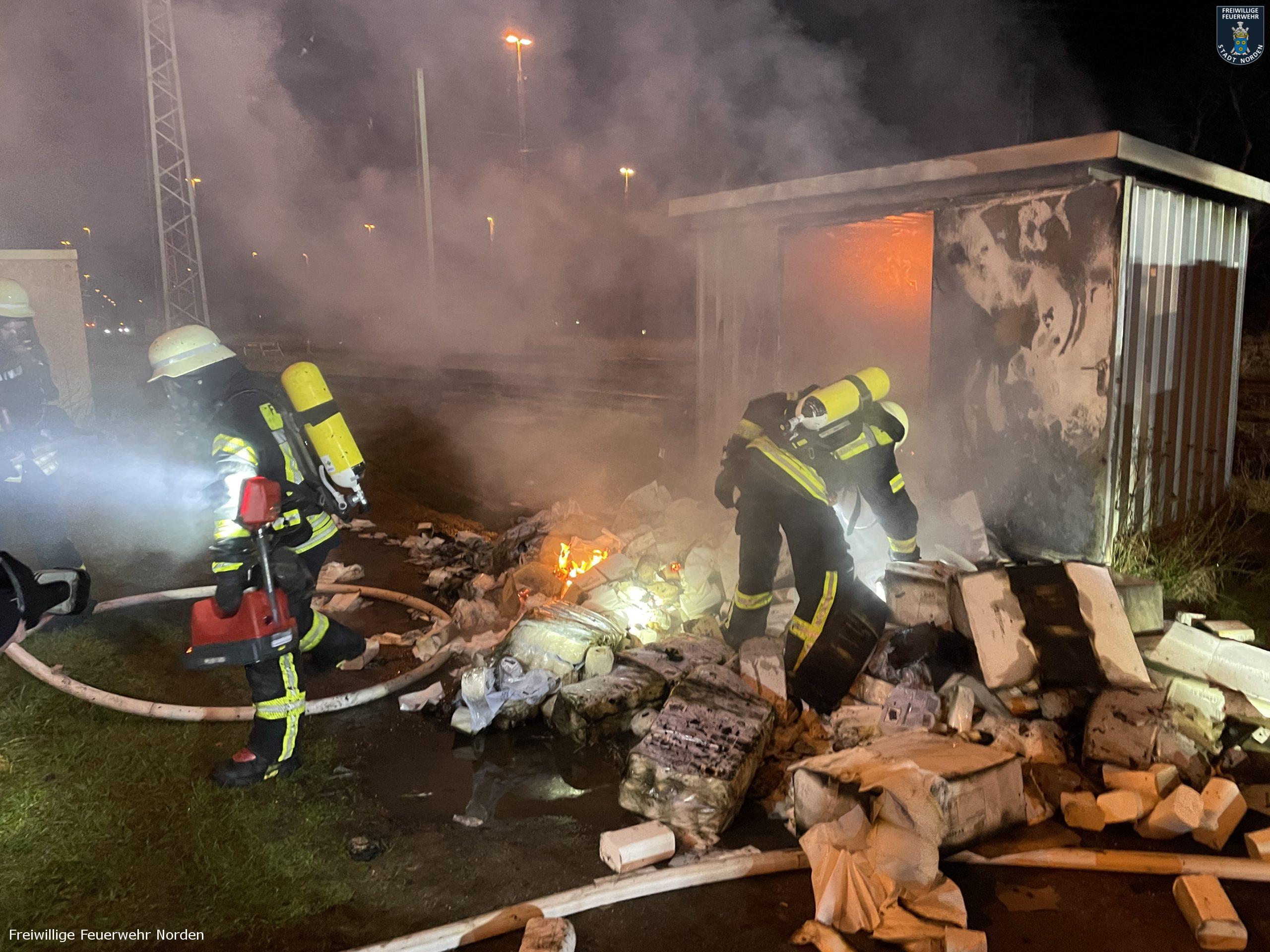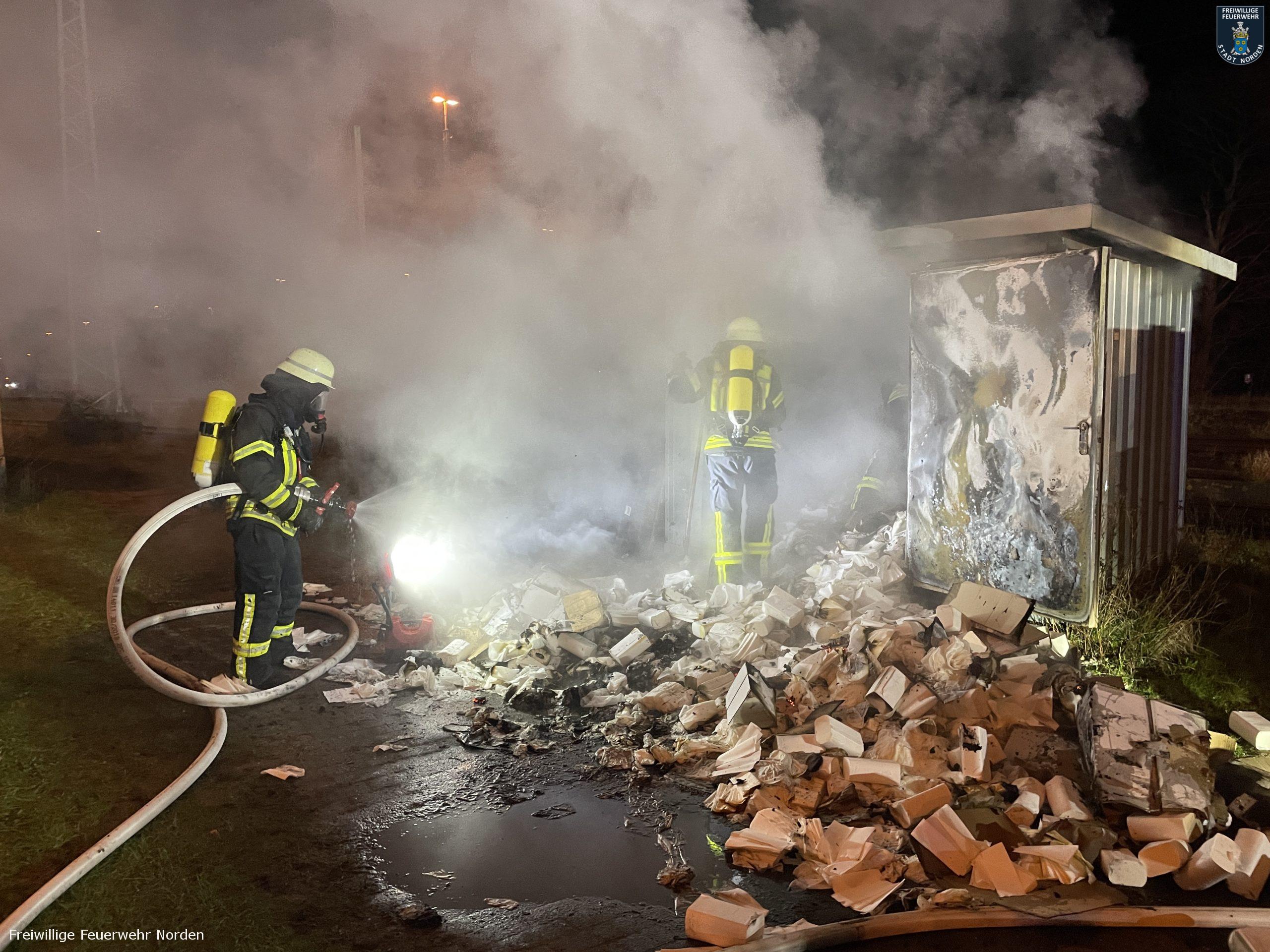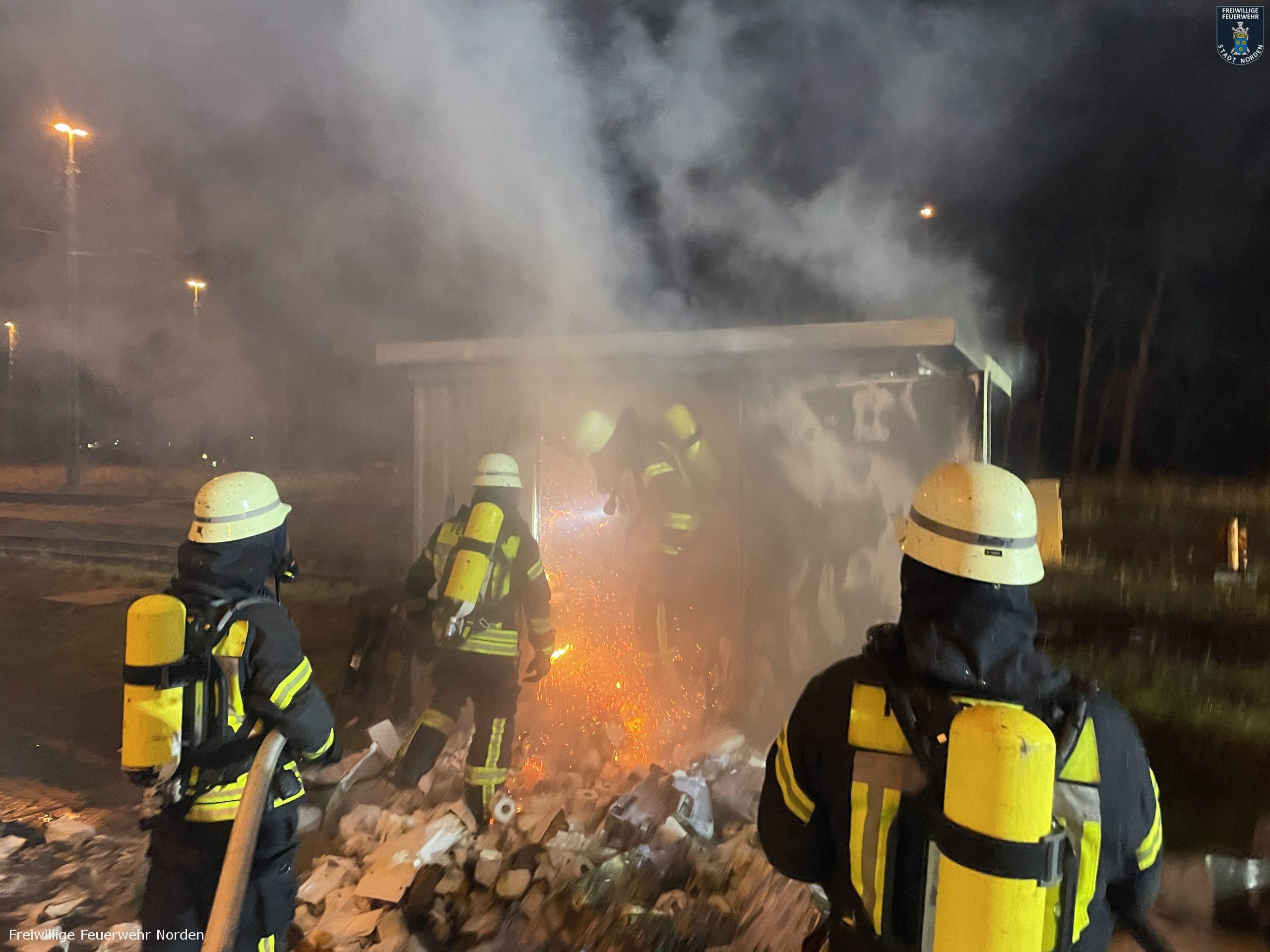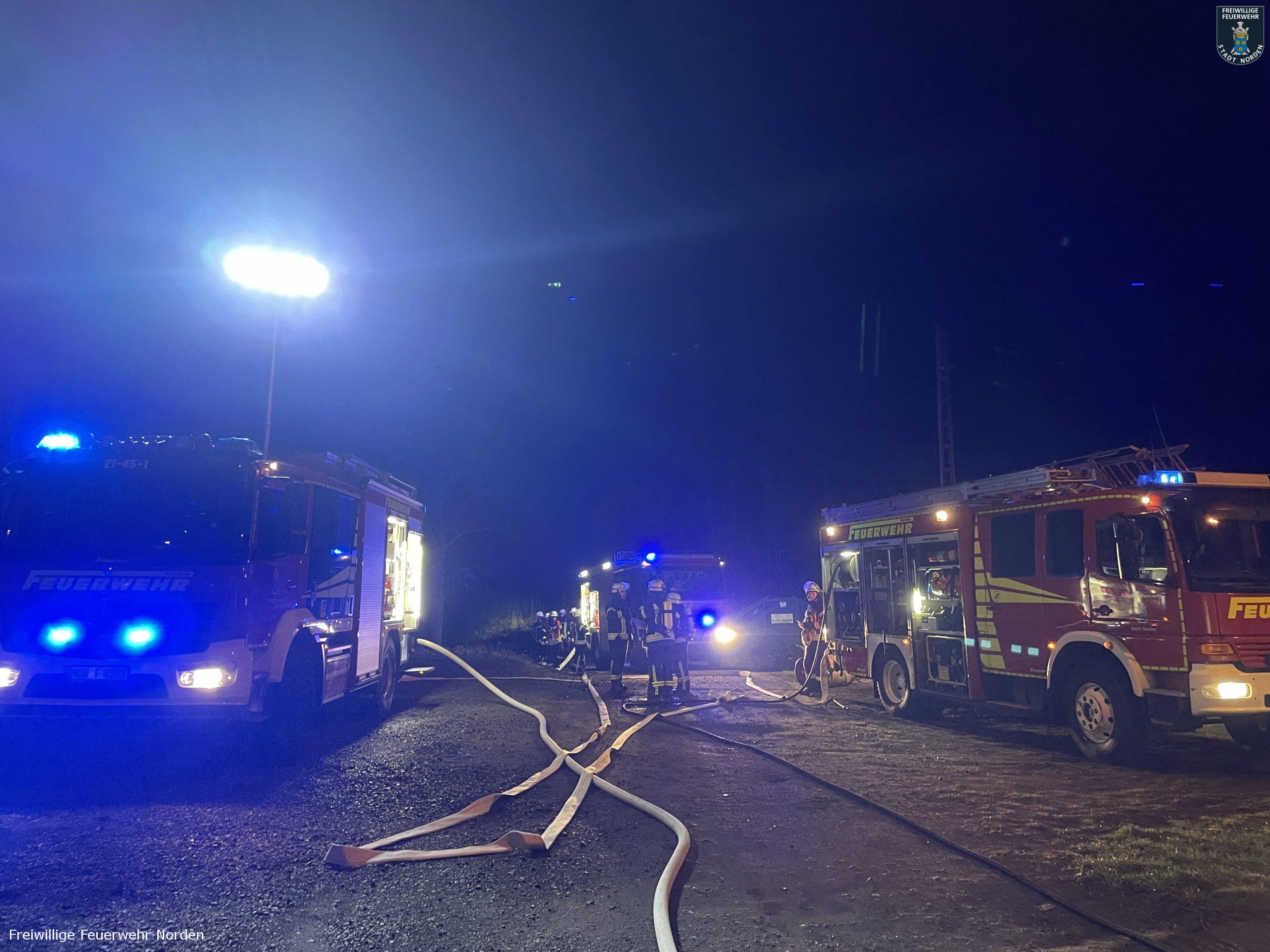 In der Nacht zu Dienstag haben Mitarbeiter der Deutschen Bahn gegen 4 Uhr ein Feuer auf dem Bahnhofsgelände in Norddeich entdeckt. Nach einem ersten Notruf, in dem sie unklaren Feuerschein meldeten, rückte die Freiwillige Feuerwehr Norden aus. Wenig später konkretisierten die Meldenden ihre Beobachtung in einem weiteren Notruf und berichteten, dass ein Sozialgebäude sowie ein Lagercontainer brennen würde. Daraufhin wurde für die Feuerwehr die Alarmstufe erhöht und weitere Kräfte nachalarmiert.