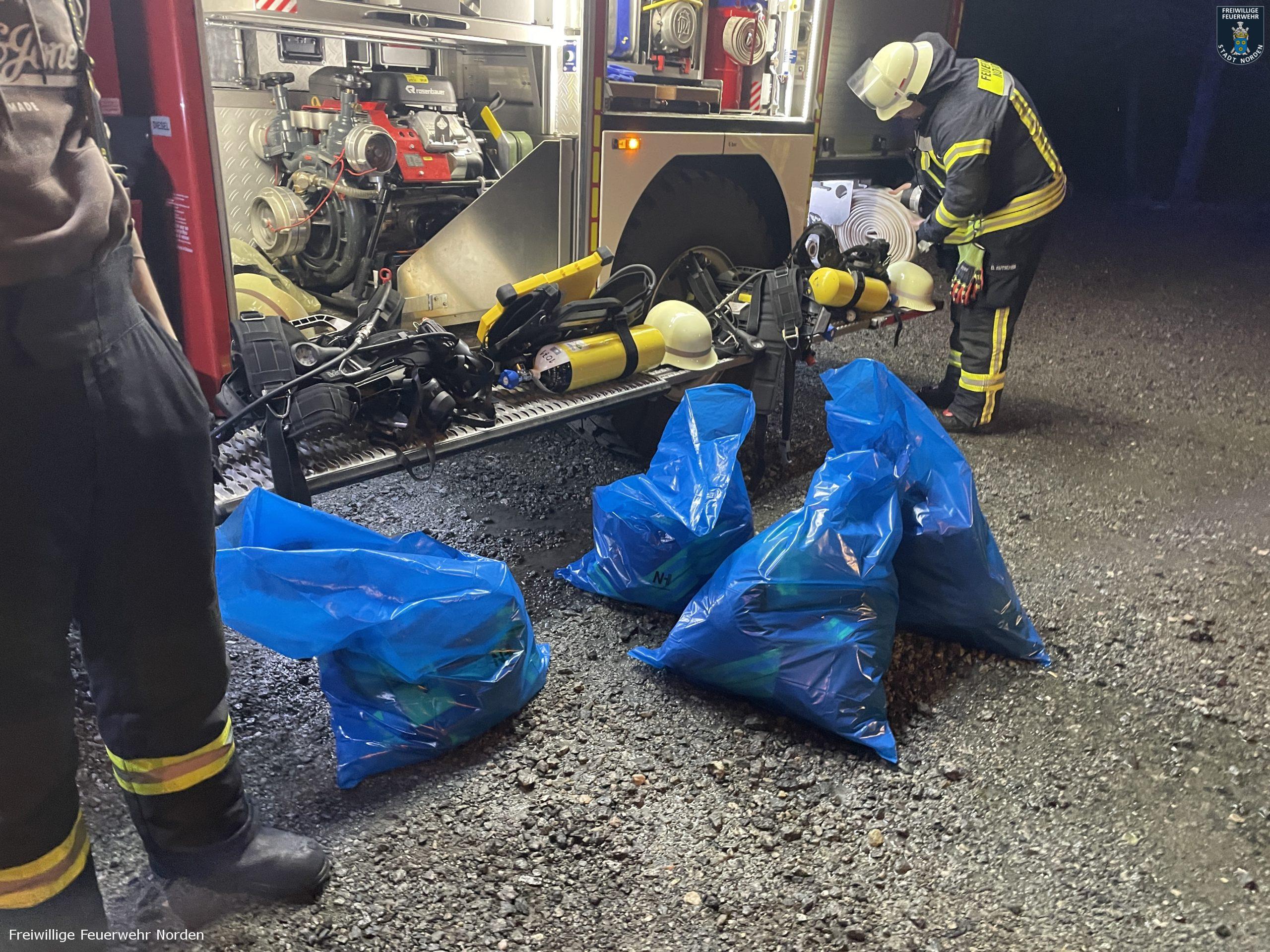 Der danebenstehende Metallcontainer bereitete den Feuerwehrleuten dagegen mehr Arbeit. Er war prall gefüllt mit Toilettenpapier und Papierhandtüchern. Den Container mussten die Einsatzkräfte mühsam mit Forken von Hand entleeren. Immer wieder flammte das Feuer dabei auf. Ehe die Feuerwehr die Einsatzstelle an einen Notfallmanager der Bahn sowie die Polizei übergeben konnte, vergingen zwei Stunden. Für die Dauer des Feuerwehreinsatzes musste der Bahnverkehr von und nach Norddeich eingestellt werden.