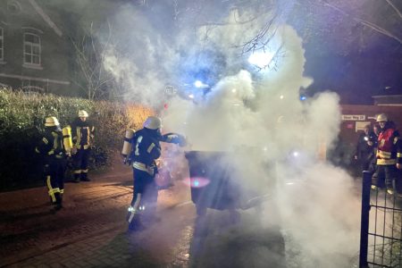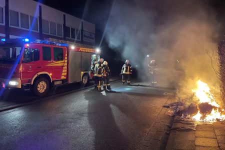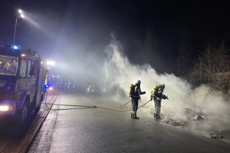 Kaum lagen die Feuerwehrleute wieder zuhause in ihren Betten, alarmierte die Leitstelle Ostfriesland sie um 3.48 Uhr erneut. Diesmal ging es in die Molkereilohne. Eine Polizeistreife hatte dort in Höhe der alten Molkerei mehrere brennende Mülltonnen auf einem Gehweg entdeckt. Die ebenfalls mit Altpapier gefüllten Behälter waren bereits weitestgehend niedergebrannt. Das Altpapier brannte jedoch weiterhin gut sichtbar. Eine angrenzende Hecke war ebenfalls in Brand geraten. Auch diesen Brand konnte die Feuerwehr zügig löschen. Eine Feuerwehrfrau war während des Einsatzes gestürzt und hatte sich dabei leicht verletzt. Der Rettungsdienst brachte sie in ein Krankenhaus, welches sie am Morgen bereits wieder verlassen konnte.