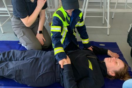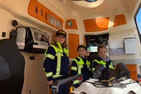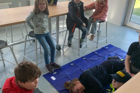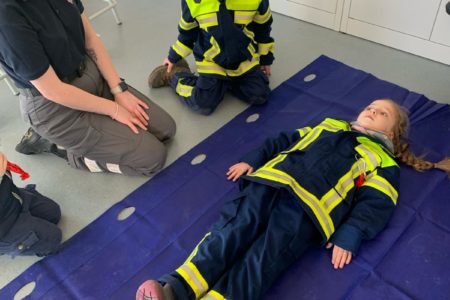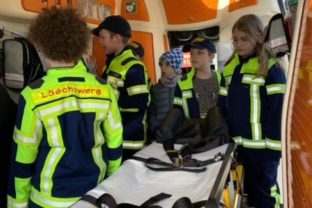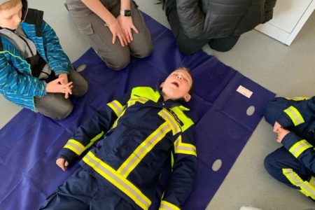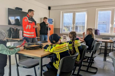 Damit jedes Kind auch an die Reihe kommt, wurden die Kinder zunächst in drei Gruppen eingeteilt. Die erste Gruppe beschäftigte sich mit Pflaster und Verbänden, die zweite Gruppe erlernte die stabile Seitenlage und die dritte Gruppe, konnte sich den mitgebrachten Krankenwagen und dessen Equipment genauer ansehen. Es war aber auch Zeit für die vielen Fragen der Kinder zu beantworten. Die einzelnen Gruppen zeigten sich sehr interessiert und machten alle Übungen mit Begeisterung mit. Nach knapp zwei Stunden war der interessante Dienst auch schon wieder vorbei. Man versprach sich, im nächsten Jahr wiederzusehen. Ein gemeinsames Gruppenbild rundete dann auch den Dienst ab.
