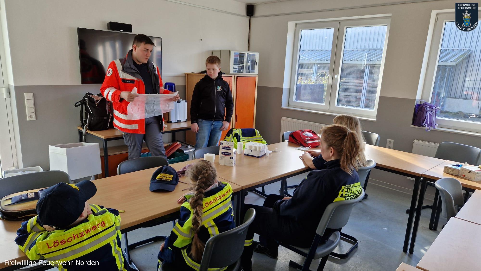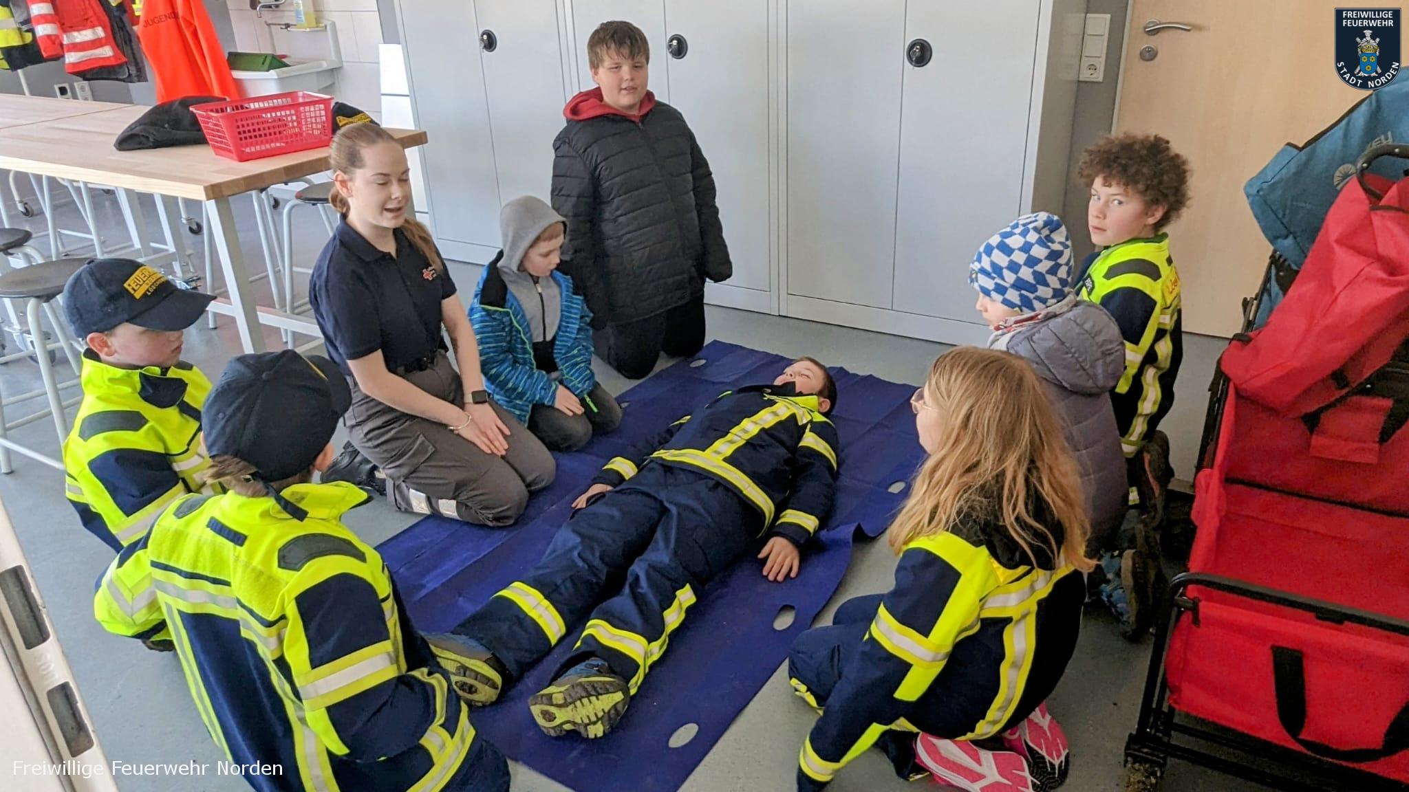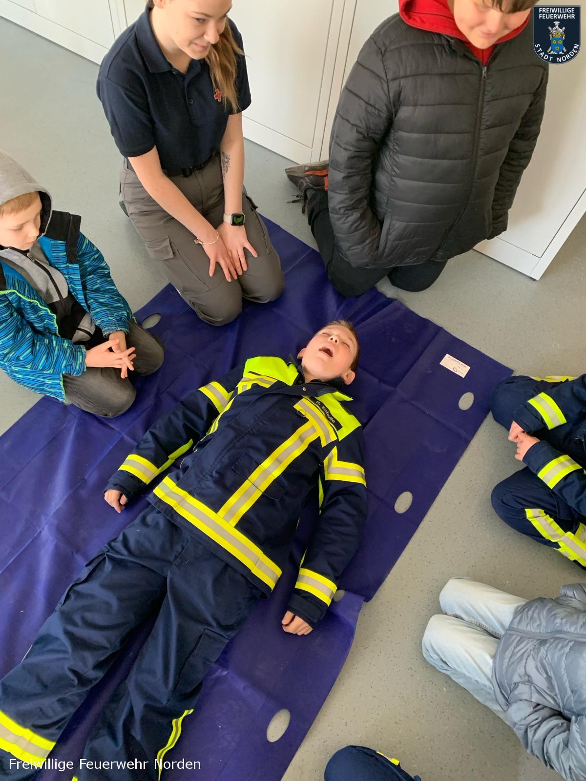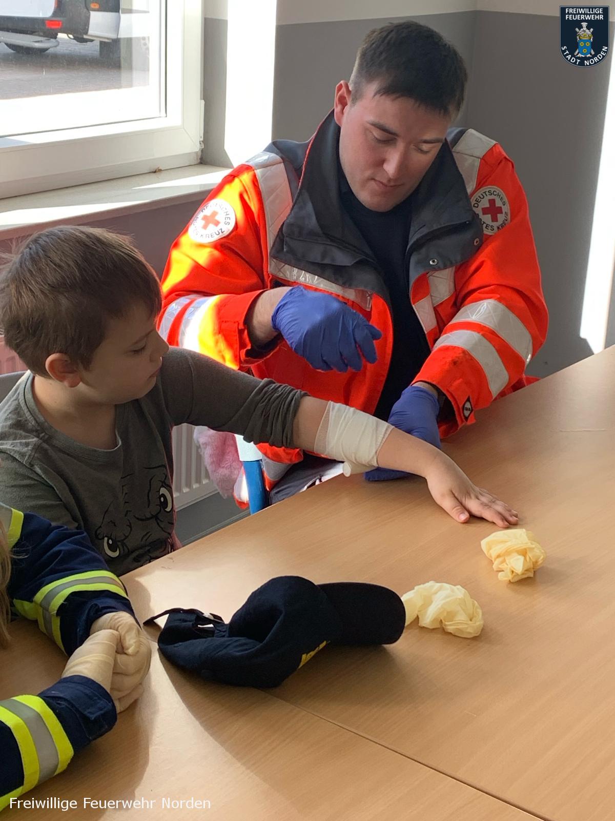 Am vergangenen Samstag hatten die Jüngsten in der Feuerwehr Norden Besuch vom Deutschen Roten Kreuz aus Hage. Zwei Bereitschaftsmitglieder, zwei Gruppenleiter für das Jugendrotkreuz und zwei Kinder vom Jugendrotkreuz waren nach Norden gekommen um den Löschzwergen ein paar wichtige Themen rund um die Erste Hilfe zu vermitteln. Erste Hilfe findet jedes Jahr bei der Kinderfeuerwehr statt. Jeden Tag können die Kinder in Situationen kommen, in der sie eventuell Erste Hilfe anwenden müssen. Sei es zu Hause, beim Dienst, unterwegs mit Freunden oder in der Schule. Erste Hilfe ist auch ein fester Bestandteil bei der Brandflohabnahme. Die Brandflohabnahme ist quasi die erste Auszeichnung für die Mitglieder in der Kinderfeuerwehr.