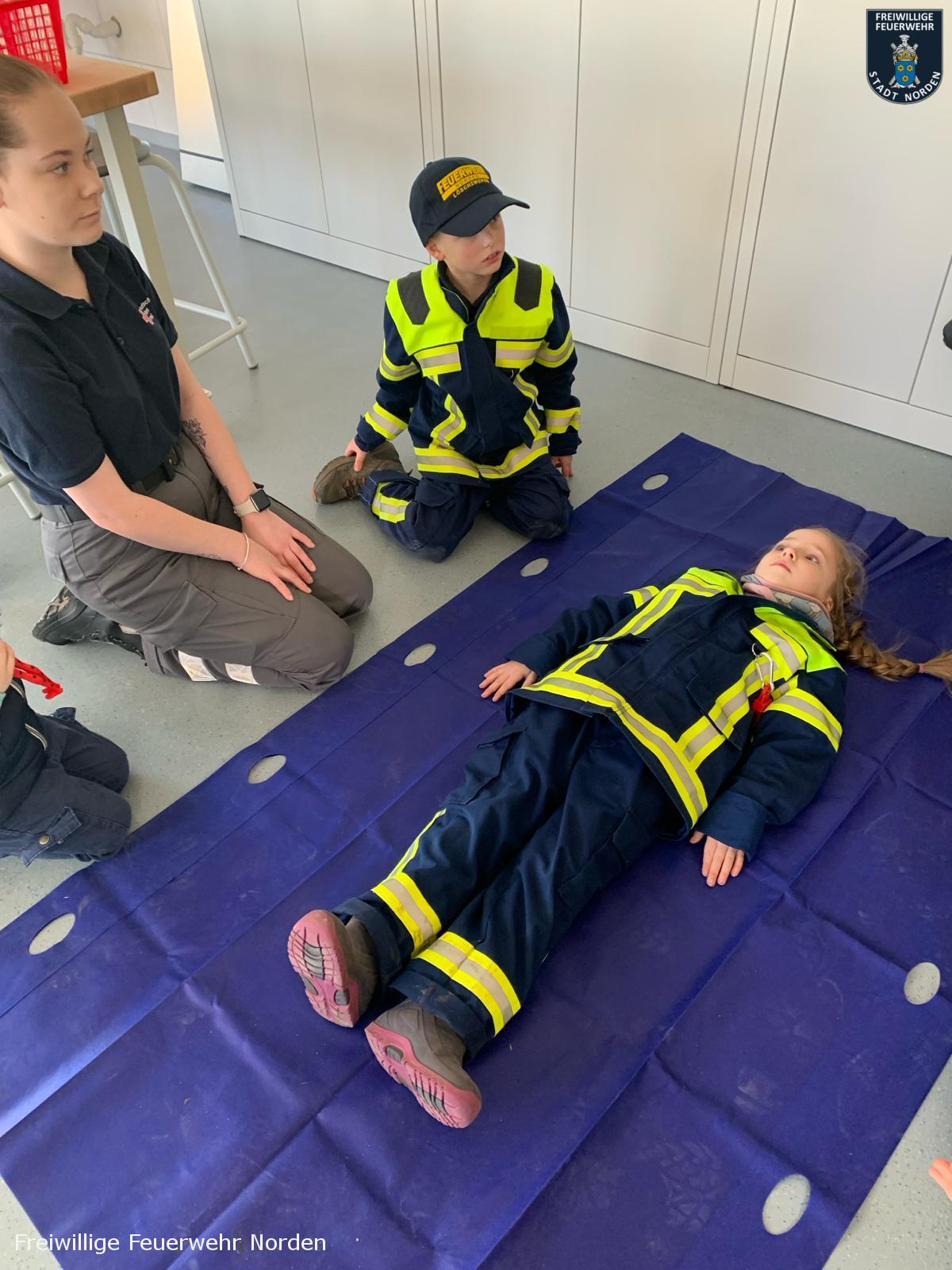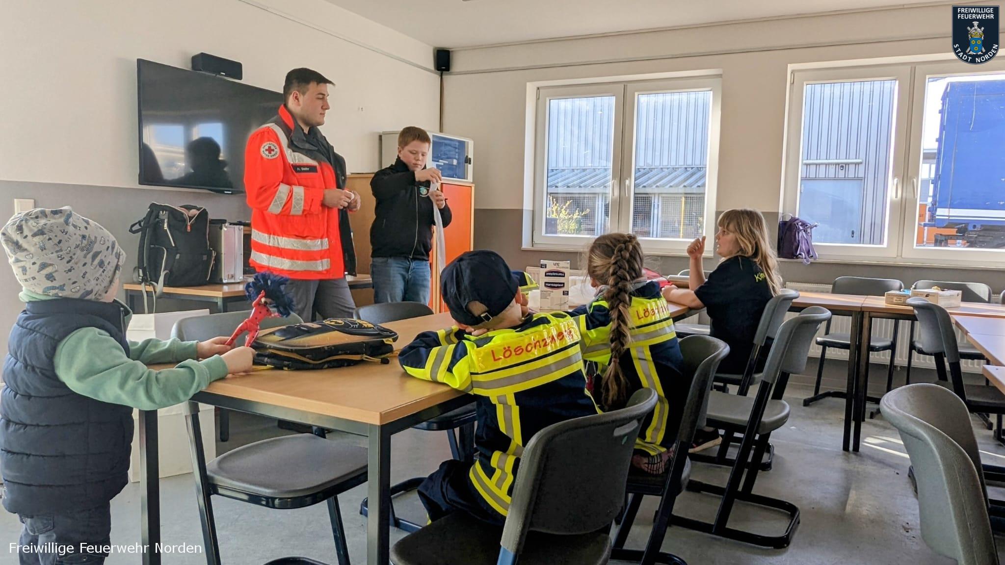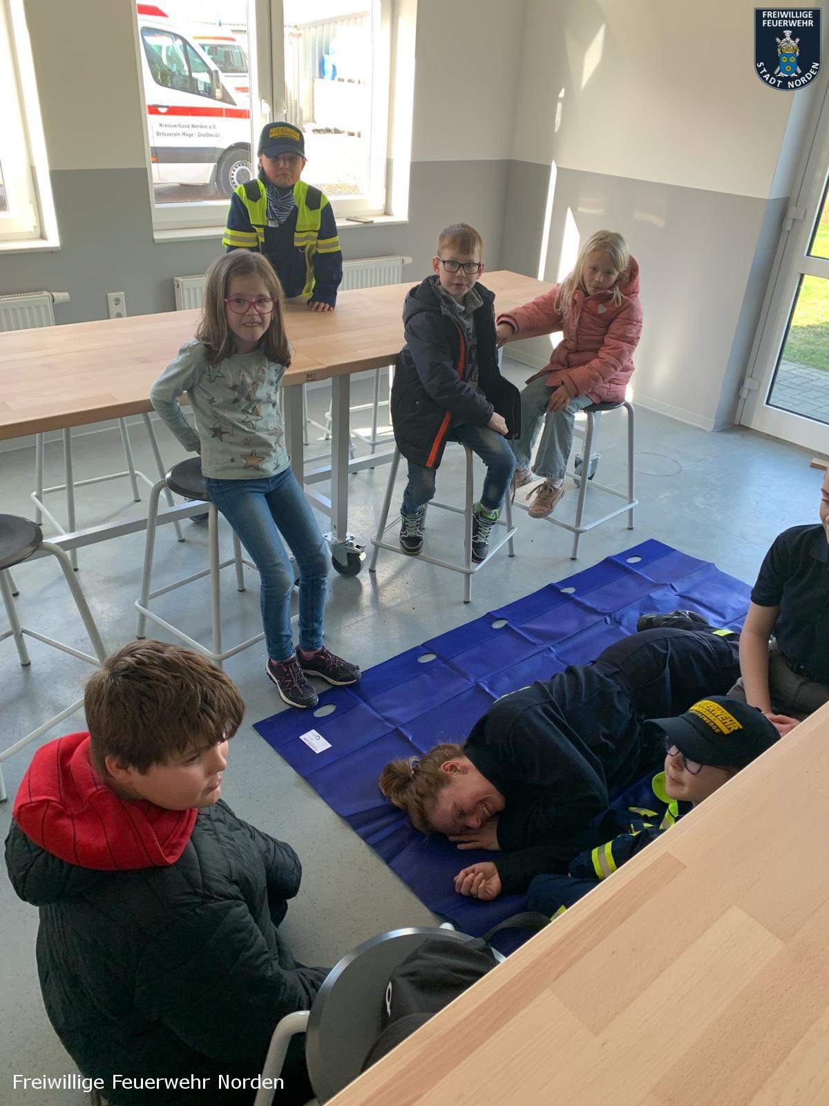 Am vergangenen Samstag hatten die Jüngsten in der Feuerwehr Norden Besuch vom Deutschen Roten Kreuz aus Hage. Zwei Bereitschaftsmitglieder, zwei Gruppenleiter für das Jugendrotkreuz und zwei Kinder vom Jugendrotkreuz waren nach Norden gekommen um den Löschzwergen ein paar wichtige Themen rund um die Erste Hilfe zu vermitteln. Erste Hilfe findet jedes Jahr bei der Kinderfeuerwehr statt. Jeden Tag können die Kinder in Situationen kommen, in der sie eventuell Erste Hilfe anwenden müssen. Sei es zu Hause, beim Dienst, unterwegs mit Freunden oder in der Schule. Erste Hilfe ist auch ein fester Bestandteil bei der Brandflohabnahme. Die Brandflohabnahme ist quasi die erste Auszeichnung für die Mitglieder in der Kinderfeuerwehr.