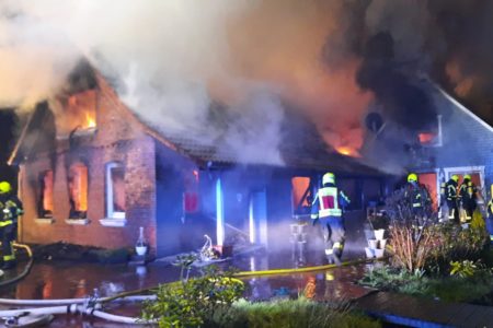 Am Mittwochabend wurde die Freiwillige Feuerwehr Norden zur Unterstützung der Freiwilligen Feuerwehr Brookmerland angefordert. Im Mühlenloog in der Gemeinde Upgant-Schott (Samtgemeinde Brookmerland) war es zum Vollbrand eines Wohngebäudes gekommen. Die Norder Wehr unterstützte mit der Drehleiter und einem Löschfahrzeug.
