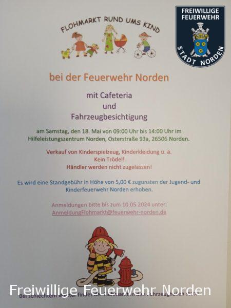 Bereits zum 5. Mal soll in diesem Jahr wieder der beliebte Flohmarkt „rund ums Kind“ bei der Jugend- und Kinderfeuerwehr Norden stattfinden. Der Flohmarkt soll wie in den letzten Jahren von Eltern für Eltern gedacht sein und am Samstag, den 18. Mai von 09:00 Uhr bis 14:00 Uhr im Hilfeleistungszentrum Norden, Osterstraße 93a stattfinden. Interessierte Eltern dürfen dort gebrauchte aber gut erhaltene Artikel rund ums Kind anbieten. Neuware, sowie professionelle Händler sind bei der Veranstaltung nicht erwünscht. Interessierte die einen stand auf dem Flohmarkt betreiben möchten können sich ab sofort und bis zum 10.05.2023 unter AnmeldungFlohmarkt@feuerwehr-norden.de anmelden. Die Besucher des Flohmarktes erwartet neben dem Flohmarkt eine kleine Fahrzeugschau. Für das leibliche Wohl ist ebenfalls gesorgt. Fragen im Vorfeld werden gerne unter daniel.blankenhagen@feuerwehr-norden.de beantwortet.
