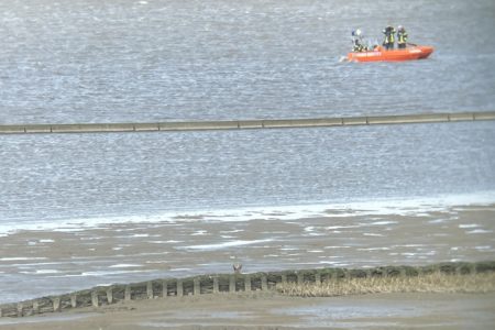 Seeseitig näherte sich dem Reh das Mehrzweckboot der Feuerwehr. Mit lauten Klopfgeräuschen trieben die Feuerwehrleute im Boot das Reh zusätzlich weiter in die richtige Richtung. Als das Reh im trockenen Watt angekommen war, ruhte es sich erst einmal in einem Buhnenfeld aus. Doch dort war es immer noch nicht sicher. Wattenjagdaufseher Enno Schmidt trieb es dann von einer Lahnung aus weiter Richtung Deich. Das Reh verstand seine Chance und rannte nun los über den Deich. Elegant überwand es mehrere Schafzäune und verschwand im hohen Gras der Westermarscher Felder.