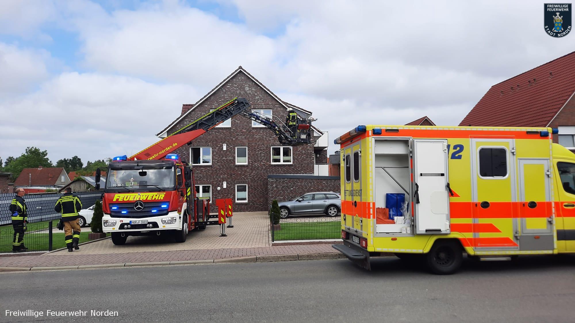 Die Drehleiter der Freiwilligen Feuerwehr Norden ist am Sonntagnachmittag in die Samtgemeinde Brookmerland ausgerückt. In der Burgstraße in Marienhafe waren der Rettungsdienst und die Ortsfeuerwehr Marienhafe bereits im Einsatz. Eine Patientin musste dort aus einem Wohngebäude transportiert werden. Mit der Drehleiter gelang ein schonender Transport.