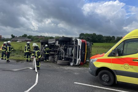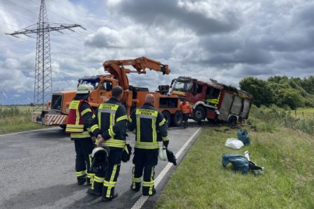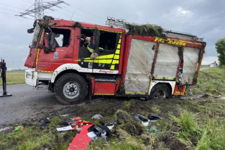 In einer langgezogenen Kurve zwischen dem Looger Weg und dem Ekeler Weg kam dem Feuerwehrfahrzeug gegen 8.35 Uhr ein weißer Lastwagen auf ihrer Fahrspur entgegen. Der Fahrer des Löschfahrzeugs war gezwungen nach rechts auszuweichen und geriet in den Grünstreifen. Beim Versuch wieder auf die Fahrbahn zurückzulenken, geriet das Löschfahrzeug außer Kontrolle, fuhr auf der gegenüberliegenden Fahrbahnseite in den Seitenstreifen und stürzte dort auf die Fahrerseite.