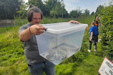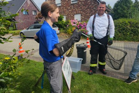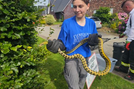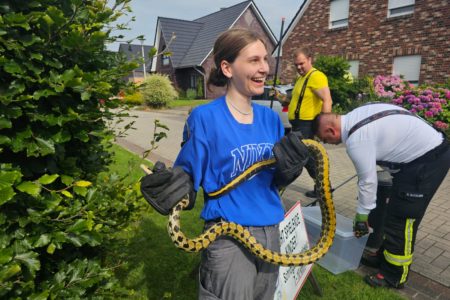 Tierrettungen sind regelmäßig Anlass für Feuerwehreinsätze. Manchmal gehört auch das Einfangen entflohener Tiere dazu. In der Regel handelt es sich dabei um unterschiedliche Wildtiere oder aber Haustiere wie Hunde, Katzen und Vögel. Ebenso beschäftigen immer wieder Nutztiere wie Pferde und Kühe die Einsatzkräfte. Mit exotischen Reptilien haben es die Feuerwehrleute dagegen eher selten zu tun. Am Montagnachmittag stand nun die Freiwillige Feuerwehr Norden vor der besonderen Aufgabe eine mehr als zwei Meter lange Schlange einzufangen. Anwohner der Siedlung Vor dem Wischer hatten das Tier in ihrem Garten entdeckt.