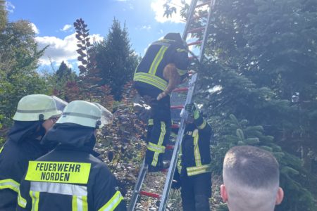 Einen Kater hat die Freiwillige Feuerwehr Norden am Donnerstagnachmittag aus einem Baum in der Straße Im Stuvert gerettet. Das Haustier war am Morgen im Garten seiner Besitzer vor einem fremden Hund geflüchtet und auf eine Kiefer geklettert. In rund sechs Metern Höhe harte Kater „Tiger“ stundenlang, ohne sich viel zu bewegen aus. Selbst auf Zurufe seiner Besitzer reagierte er nicht. Ob der Hund ihn verletzt hatte, war vom Boden aus nicht zu erkennen.