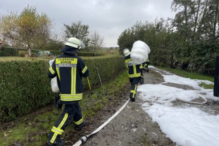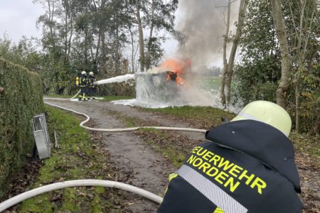 Eine Trafostation hat am Dienstagmittag im Norder Ortsteil Westermarsch gebrannt. Gegen 13.15 Uhr hatten Anwohner des Ülkebülter Wegs Knallgeräusche und Rauch aus der Station wahrgenommen und einen Notruf abgesetzt. Als die Freiwillige Feuerwehr Norden an der abgelegenen Einsatzstelle eintraf, stand die 20.000 Volt führende Station der Stadtwerke Norden in Vollbrand. Die Anfahrt gestaltete sich für die Feuerwehr als herausfordern, da die Zufahrt über sehr schmale Straßen führt. Zudem ist eine Brücke auf dem Ülkebülter Weg nicht mit Lkw befahrbar. Die Feuerwehr musste daher einen Umweg über Norddeich fahren. Mit den Einsatzkräften traf auch der Bereitschaftsdienst der Stadtwerke ein. Aus der Ferne wurde die Station vom Stromnetz getrennt. Damit war auch die Sicherheit der Einsatzkräfte gewährleistet und ein gefahrloses Arbeiten möglich. Dies führte in der Umgebung und Teilen von Norddeich zu einem Stromausfall.