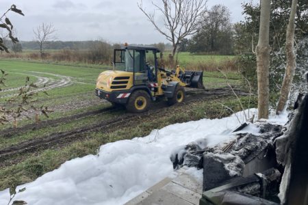 Die Feuerwehrleute gingen unter Atemschutz zur Brandbekämpfung vor und setzen hierzu Schaum ein. Der verbaute Trafo ist mit Öl gefüllt. Um eine Ausbreitung von kontaminierten Löschwasser in einem unmittelbar angrenzenden Graben zu verhindern, wurde eine Baufirma mit einem Radlader an die Einsatzstelle beordert. Diese verschloss das Gewässer vor und hinter der Brandstelle mit Erde. Zusätzlich wurde eine saugfähige Ölsperre ausgebracht. Da es in dem Gebiet keine Löschwasserversorgung gibt, musste der mitgeführte Wasservorrat der Löschfahrzeuge im Pendelverkehr von einem Hydranten aufgefüllt werden. Nach rund zwei Stunden übergab die Feuerwehr die Einsatzstelle an Vertreter der Stadtwerke. Eine Fachfirma wurde bereits im laufenden Einsatz mit der Reinigung des Grabens beauftragt. Neben der Feuerwehr waren auch die Polizei und ein Vertreter der Unteren Wasserbehörde des Landkreises Aurich vor Ort. An der Trafostation entstand Totalschaden.
