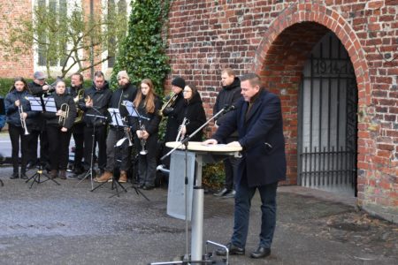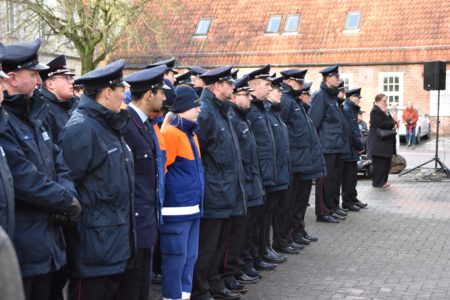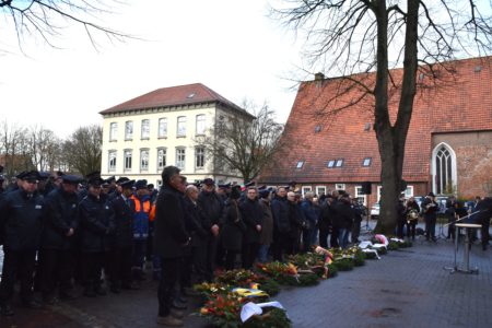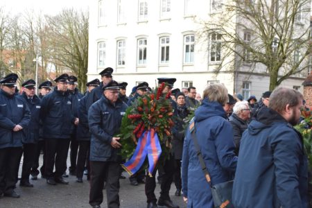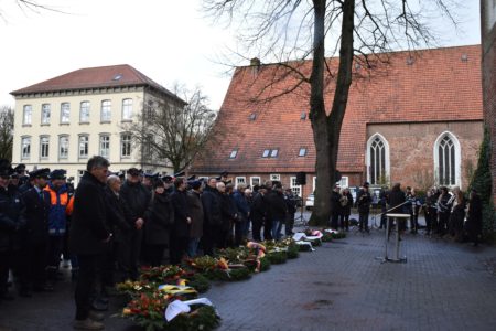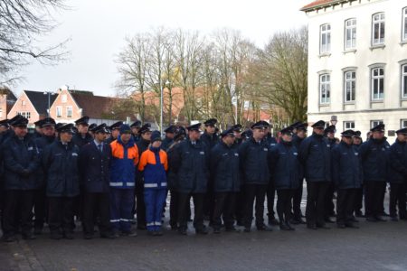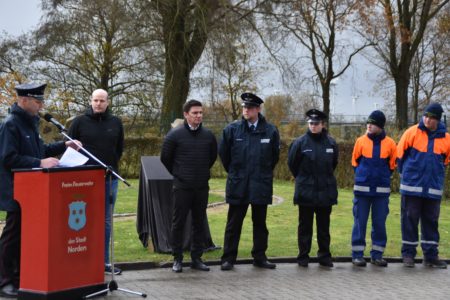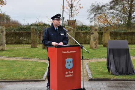 Nordens stellvertretender Stadtbrandmeister Thomas Weege konnte neben den vielen Feuerwehrleuten auch zahlreiche Angehörige der Verstorbenen in seiner Ansprache begrüßen. Er betonte, wie wichtig es der Norder Feuerwehr sei, den Kontakt zu den Angehörigen nicht zu verlieren und das Andenken an die Verstorbenen ewig zu bewahren.
