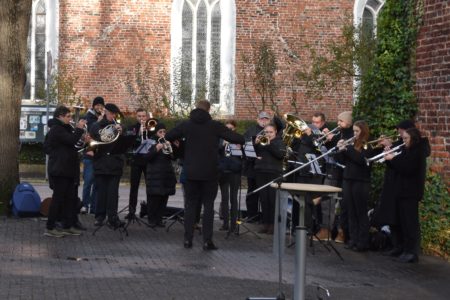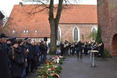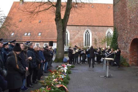 Unter den Klängen des Stadtorchesters der Feuerwehr Norden gedachten die Anwesenden allen verstorbenen Kameraden. In den letzten zwölf Monaten bestiegen drei weitere Kameraden die symbolische Himmelsleiter und gingen allen anderen voraus. Eine Statue der Gedenkstätte stellt genau diese Symbolik nach. Ihre Gedenkplaketten brachten Angehörige mit Führungskräften der Feuerwehr an den Sandstelen an. Thomas Weege erinnerte mit seinen persönlichen Erinnerungen an die Verstorbenen den Kameraden Armin Korok, Tjark Kruse und Heinrich Odenga.