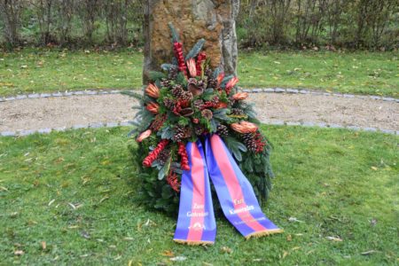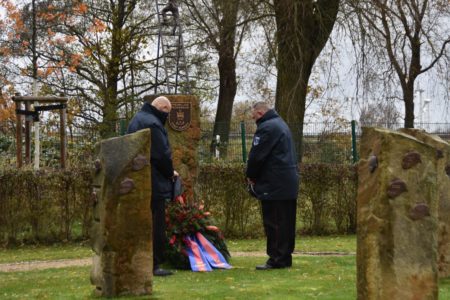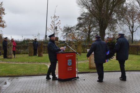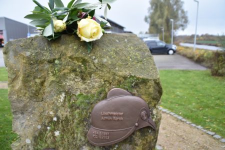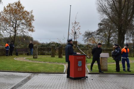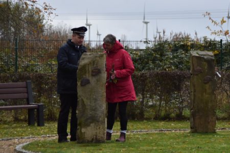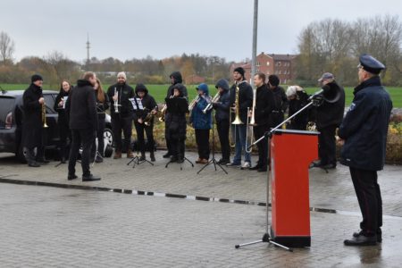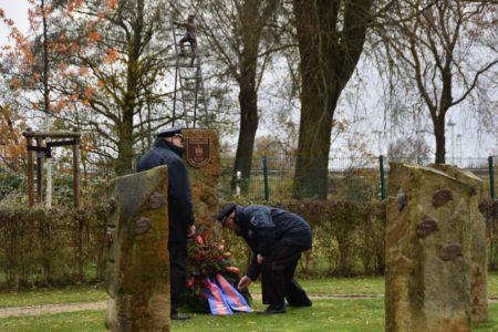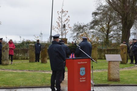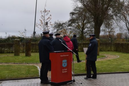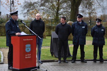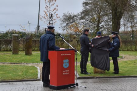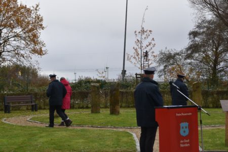 Nach der Teilnahme an der Gedenkveranstaltung der Stadt Norden am Glockenturm der Ludgerikirche, wechselten die rund 60 Feuerwehrleute zum Hilfeleistungszentrum. Dort traten sie an der Gedenkstätte für verstorbene Kameraden ihrer Feuerwehr an. Die Gedenkstätte wurde im Jahr 2019 in Eigenleistung der Feuerwehr errichtet und wächst seitdem Stück für Stück weiter.