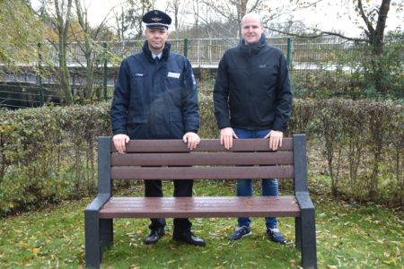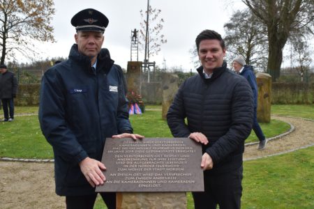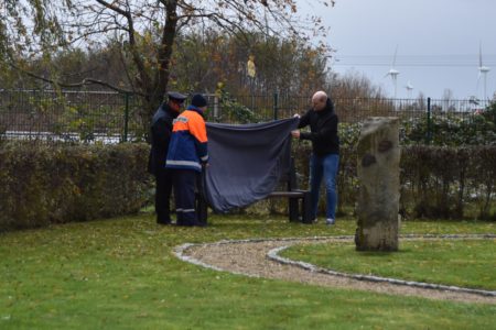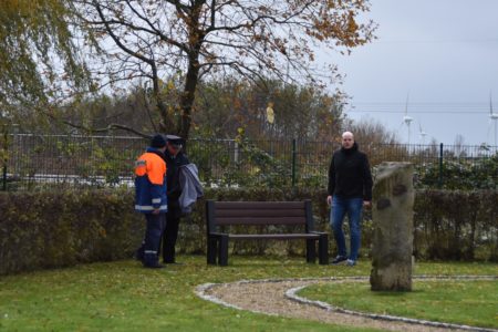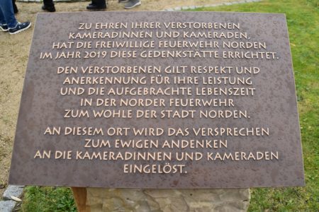 Ehe die Gedenkplaketten von drei verstorbenen Kameraden angebracht wurden, konnte die Gedenkstätte um zwei bedeutsame Objekte erweitert werden. Durch großzügige Spenden konnten eine Parkbank und eine bronzene Schrifttafel im Beisein ihrer Sponsoren enthüllt werden. Das Bauunternehmen Mammen aus Lütetsburg hat die Parkbank gestiftet. Einer ihrer verstorbenen Familienmitglieder war Mitglied der Feuerwehr Norden. Die Sitzgelegenheit war ein Wunsch der Feuerwehr, den die Familie gerne erfüllen wollte. Die Schrifttafel steht am Zugang zu der Gedenkstätte. Sie gibt einen Teil ihrer Geschichte wieder und betont, dass das Bewahren eines ewigen Andenkens an die Verstorbenen, nicht nur eine Floskel ist, sondern ein Versprechen, was an diesem besonderen Ort eingelöst wird. Die Wirtschaftsförderung des Landkreises Aurich unterstützte den Förderverein der Feuerwehr Norden bei der Finanzierung mit einem Zuschuss von fast 5000 Euro. Geschäftsführer Jelto Müller und Kristian Mammen enthüllten die beiden Objekte gemeinsam mit Betreuern und Mitgliedern der Jugendfeuerwehr.