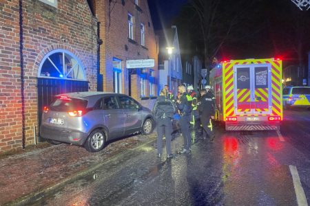 Nach einem ersten Notruf musste davon ausgegangen werden, dass der Verunfallte in seinem Opel eingeschlossen ist und die Feuerwehr zur Befreiung erforderlich ist. Daher rückten um 20.40 Uhr neben Rettungsdienst, Notarzt und Polizei auch die Freiwillige Feuerwehr Norden aus. Dem Rettungsdienst gelang es jedoch den Fahrer allein über die Beifahrerseite zu befreien, sodass die Feuerwehr sich lediglich um die Absicherung der Einsatzstelle kümmern musste. Am Gebäude entstand nur leichter Schaden.