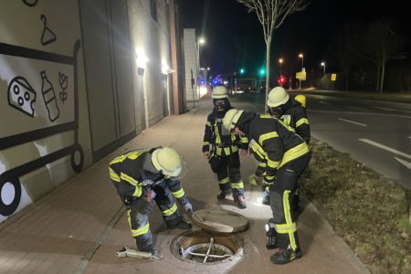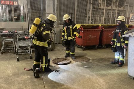 Währenddessen liefen die Erkundungsmaßnahmen im und um das Gebäude weiter. Anhand von verschiedenen Plänen konnte eine Leckage an einer Erdgasleitung ausgeschlossen werden. Nach Messungen in der Kanalisation schied auch ein Eintrag von außen ins Gebäudeinnere aus. Einige Räume wurden von der Feuerwehr belüftet. Als eine weitere Ursache für den Geruch sowie die Messewerte kam das Kältemittel der Kühlanlagen des Supermarktes in Betracht. Recherchen der Feuerwehr ergaben eine Querempfindlichkeit der Gasmessgeräte auf das Kältemittel. Eine konkrete Leckage konnten die Einsatzkräfte jedoch nicht feststellen.