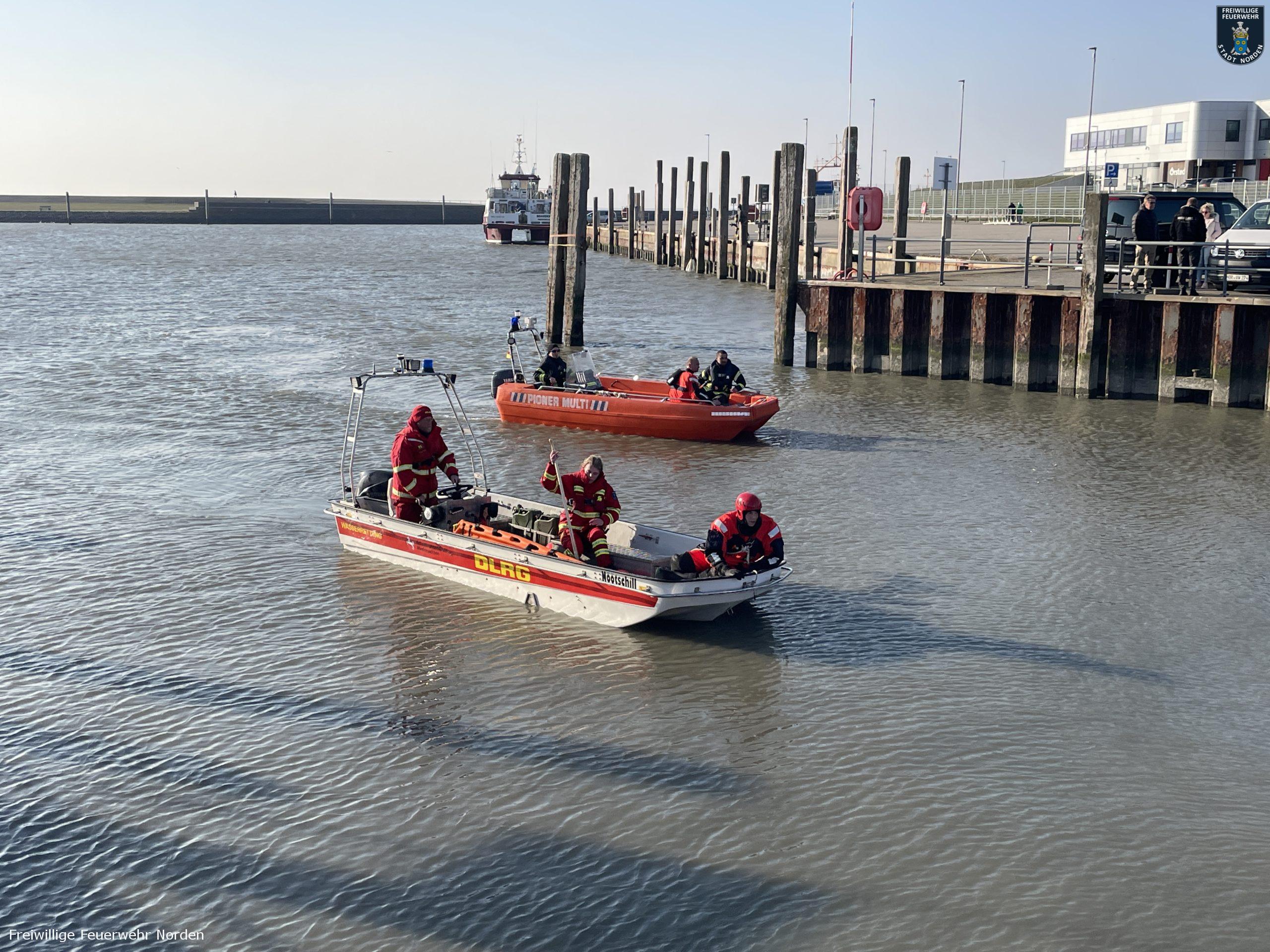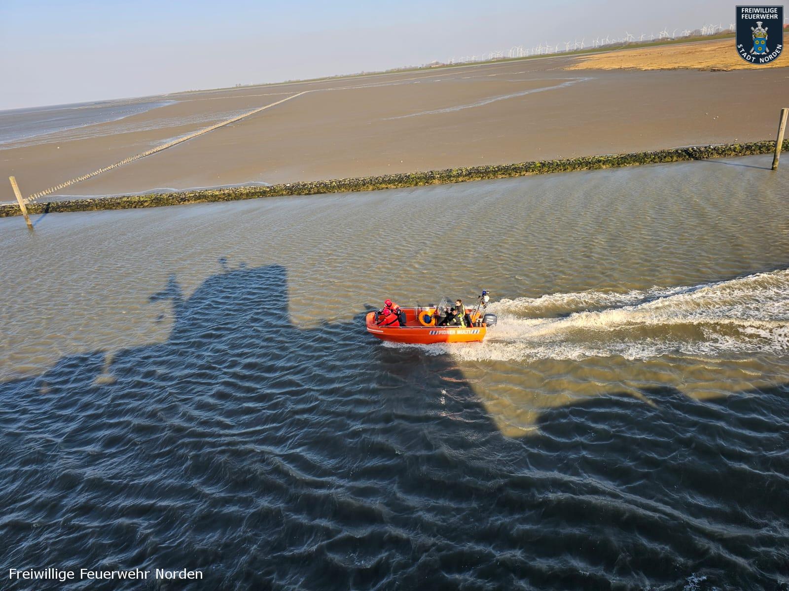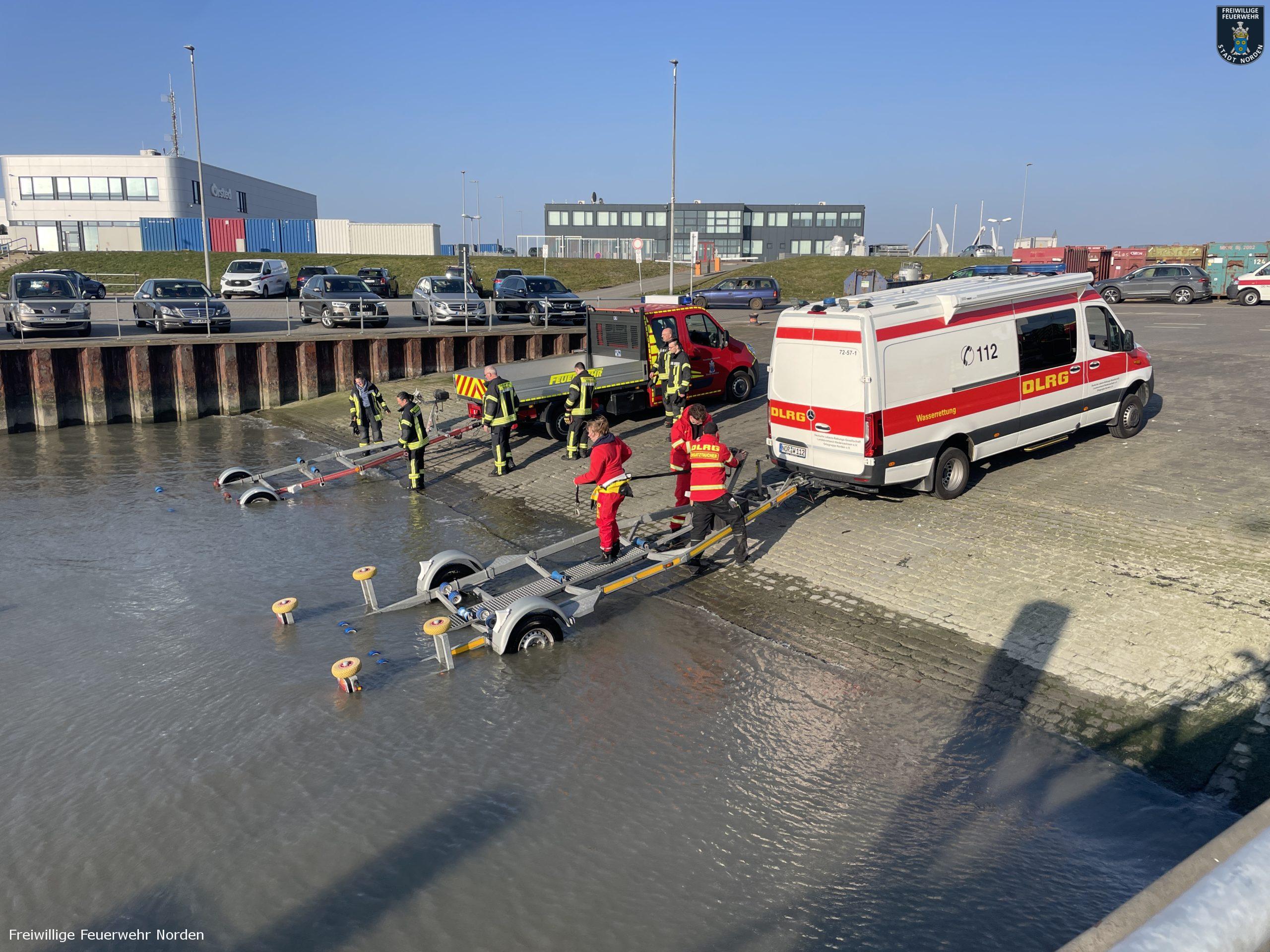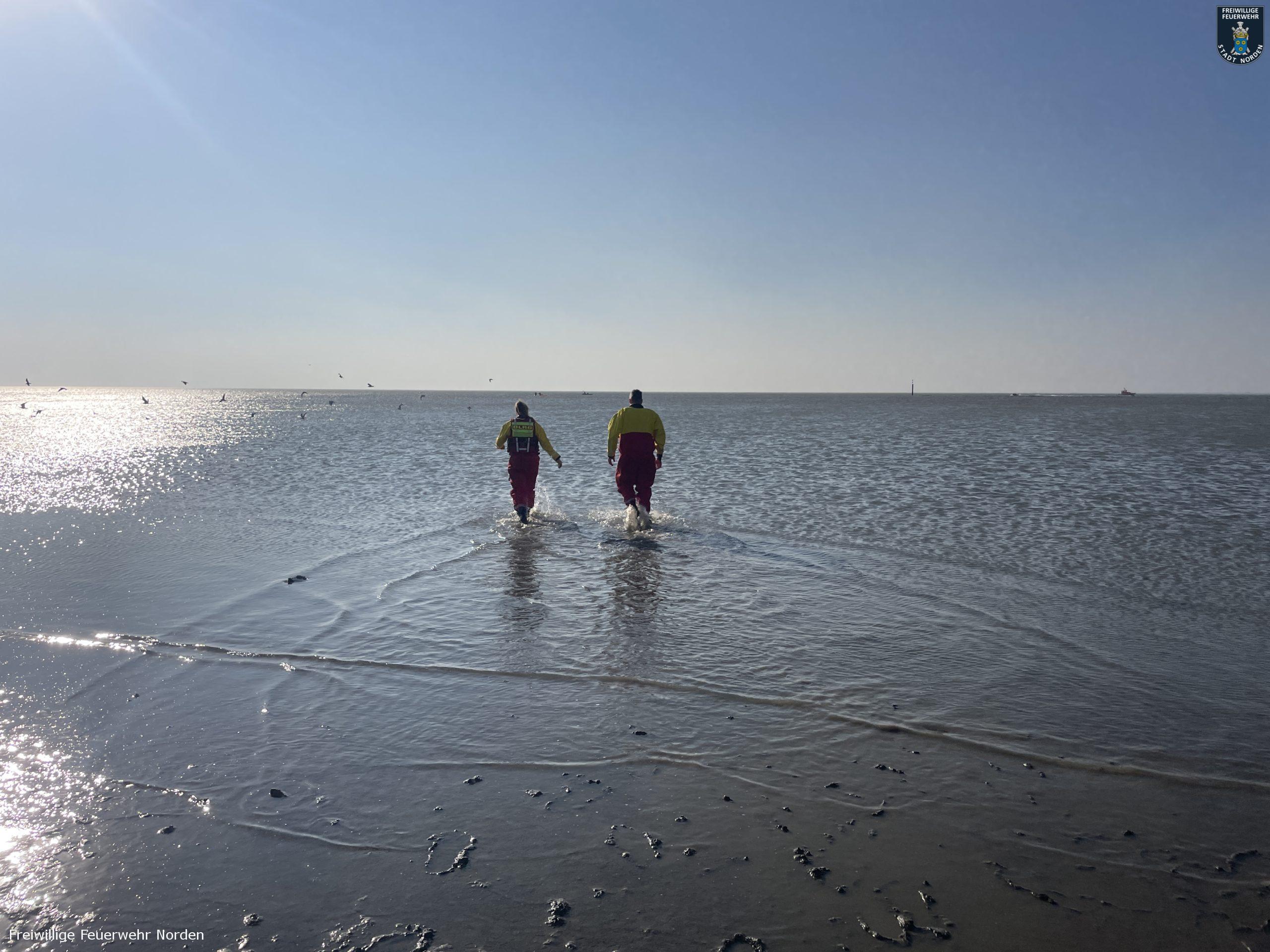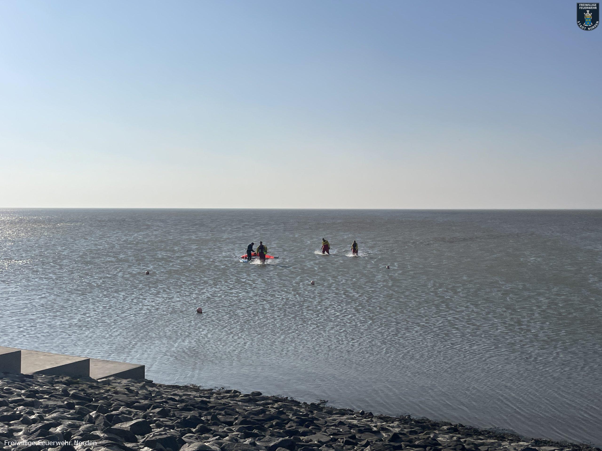 Das Rettungsboot der DGzRS-Station Norddeich „Otto Diersch“ war seeseitig als erstes Vor Ort. Aufgrund der geringen Wassertiefe, konnten sie den Mann jedoch nicht erreichen. Dieser lief nun durch das Wasser in Richtung Deich. Die Rettungsboote von DLRG und Feuerwehr trafen wenig später ein. Ein Rettungsschwimmer der DLRG stieg ins Wasser und begleitete den Surfer. Zwei weitere Rettungsschwimmer liefen den Beiden vom Strand aus entgegen. Gegen 16 Uhr erreichten alle sicher und unverletzt die Strandpromenade, auf der inzwischen zahlreiche Menschen die vermeintliche Rettungsaktion verfolgten.
