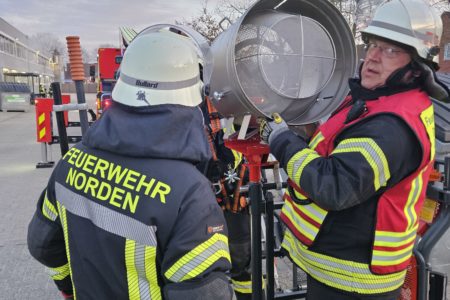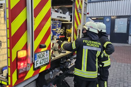 105 Einsatzkräfte der Freiwilligen Feuerwehr Norden sowie des Deutschen Roten Kreuzes (DRK) übten am Dienstagabend beim Telematikzentrum in Norden. Die automatische Brandmeldeanlage schlug gegen 19:30 Uhr Alarm und rief so die Einsatzkräfte auf den Plan. Bei der Ankunft der ersten Einsatzkräfte am Objekt war bereits eine Rauchentwicklung zu sehen. Ein Blick auf die Anzeige der Brandmeldeanlage zeigte, dass mehrere Rauchmelder an verschiedenen Orten Alarm schlugen.