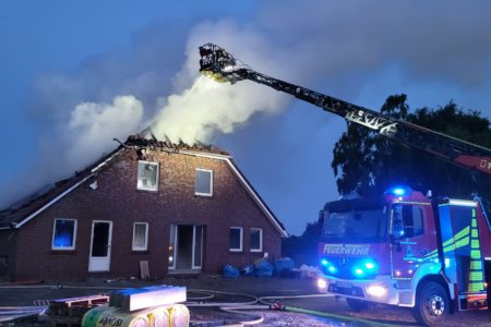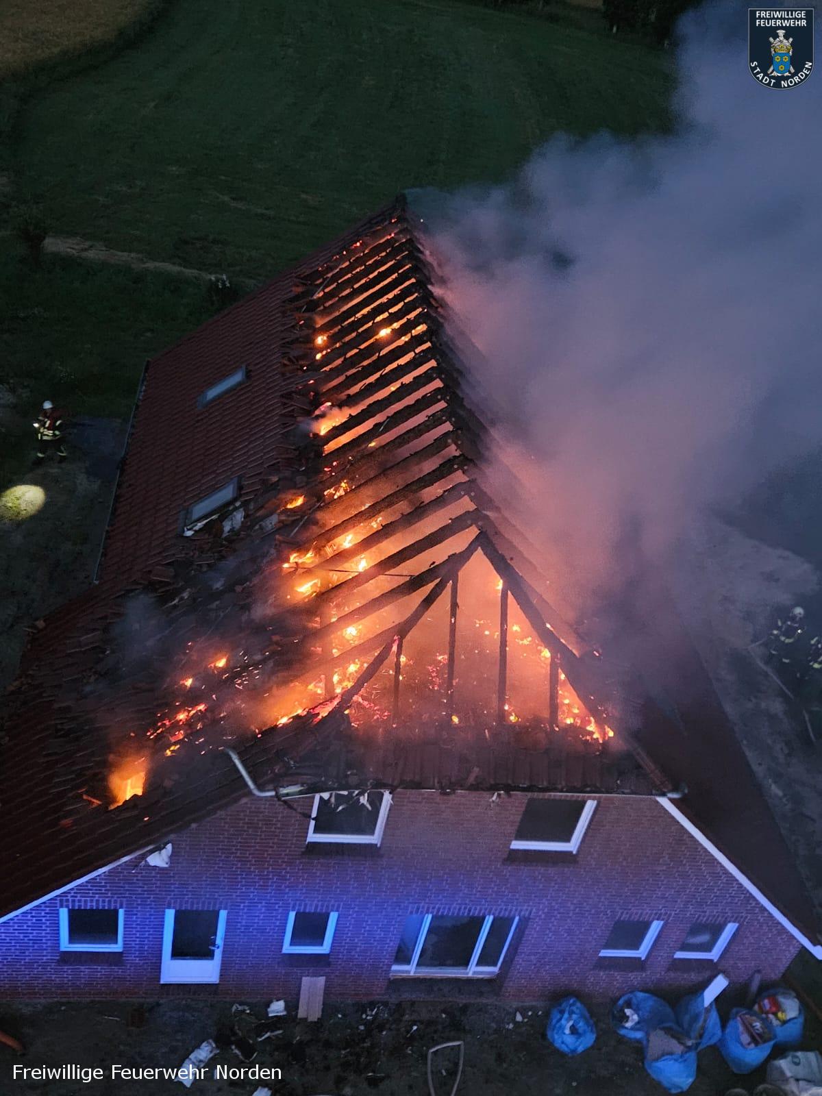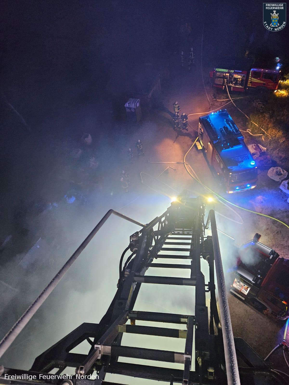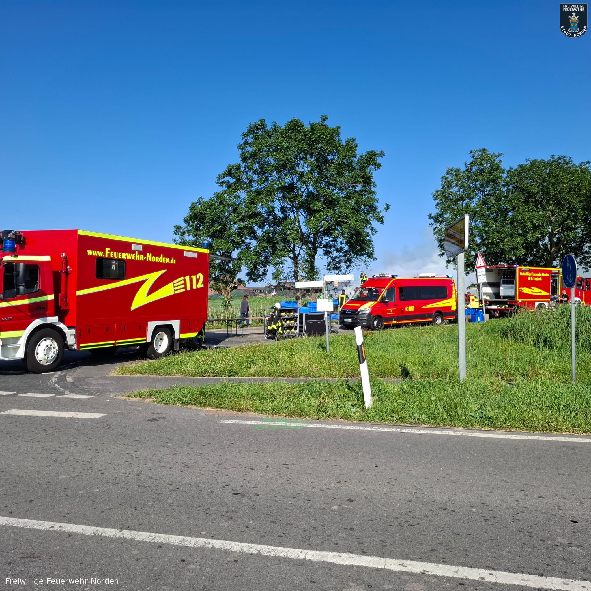 Am Samstagmorgen wurde die Freiwillige Feuerwehr Norden mit mehreren Fahrzeugen zur nachbarlichen Löschhilfe in die Samtgemeinde Hage angefordert. Um 3.41 Uhr wurde die Drehleiter und ein Löschfahrtzeug alarmiert. Im weiteren Verlauf wurden um 4.02 Uhr der Schlauchwagen 2000, um 4.11 Uhr der Einsatzleitwagen 2, um 5.10 Uhr das Löschfahrzeug-Logistik mit dem Schaum-/Wasserwerfer, um 5.23 Uhr der Gerätewagen-Atemschutz und um 5.26 Uhr weitere Atemschutzgeräteträger nachgefordert.