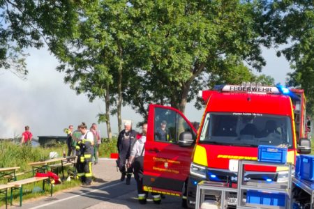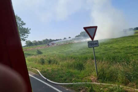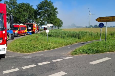 Im Kleiweg in der Gemeinde Hagermarsch war es zu zwei Großbränden gleichzeitig gekommen. Bei Ankunft der ersten Einsatzkräfte brannte ein im Bau befindliches Wohnhaus in voller Ausdehnung. Auf der anderen Straßenseite brannten Heuballen ebenfalls in voller Ausdehnung.
