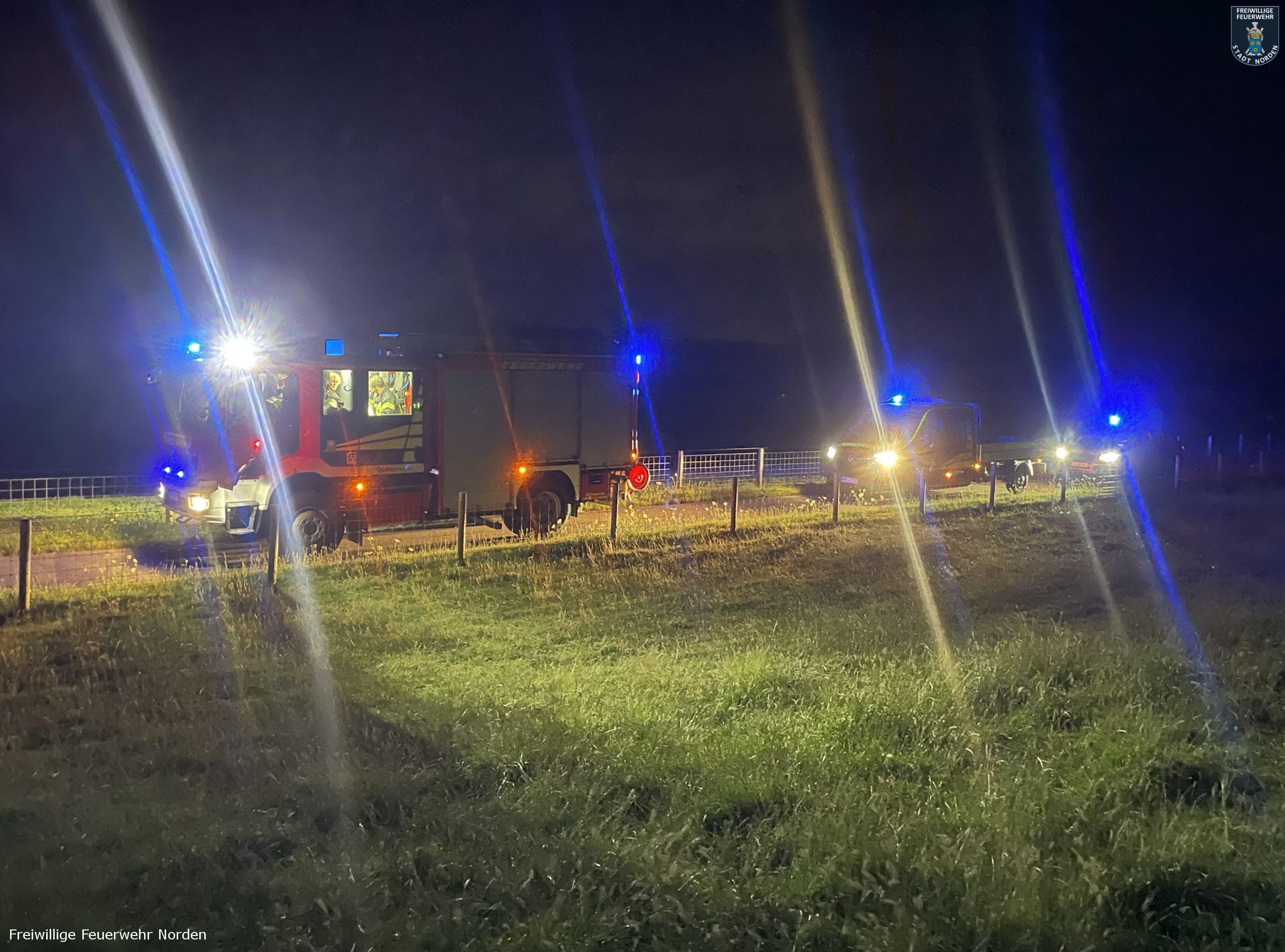 In der Nacht zu Mittwoch meldete ein Anrufer einen Feuerschein in Norden. Seiner Beobachtung nach, sollte sich das Feuer im Bereich der Greetsieler Straße im Ortsteil Leybuchtpolder befinden. Die Leitstelle Ostfriesland entsandte daraufhin die Freiwillige Feuerwehr Norden mit je einem Löschfahrzeug von den Standorten Hilfeleistungszentrum und Leybuchtpolder.