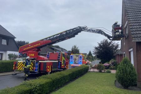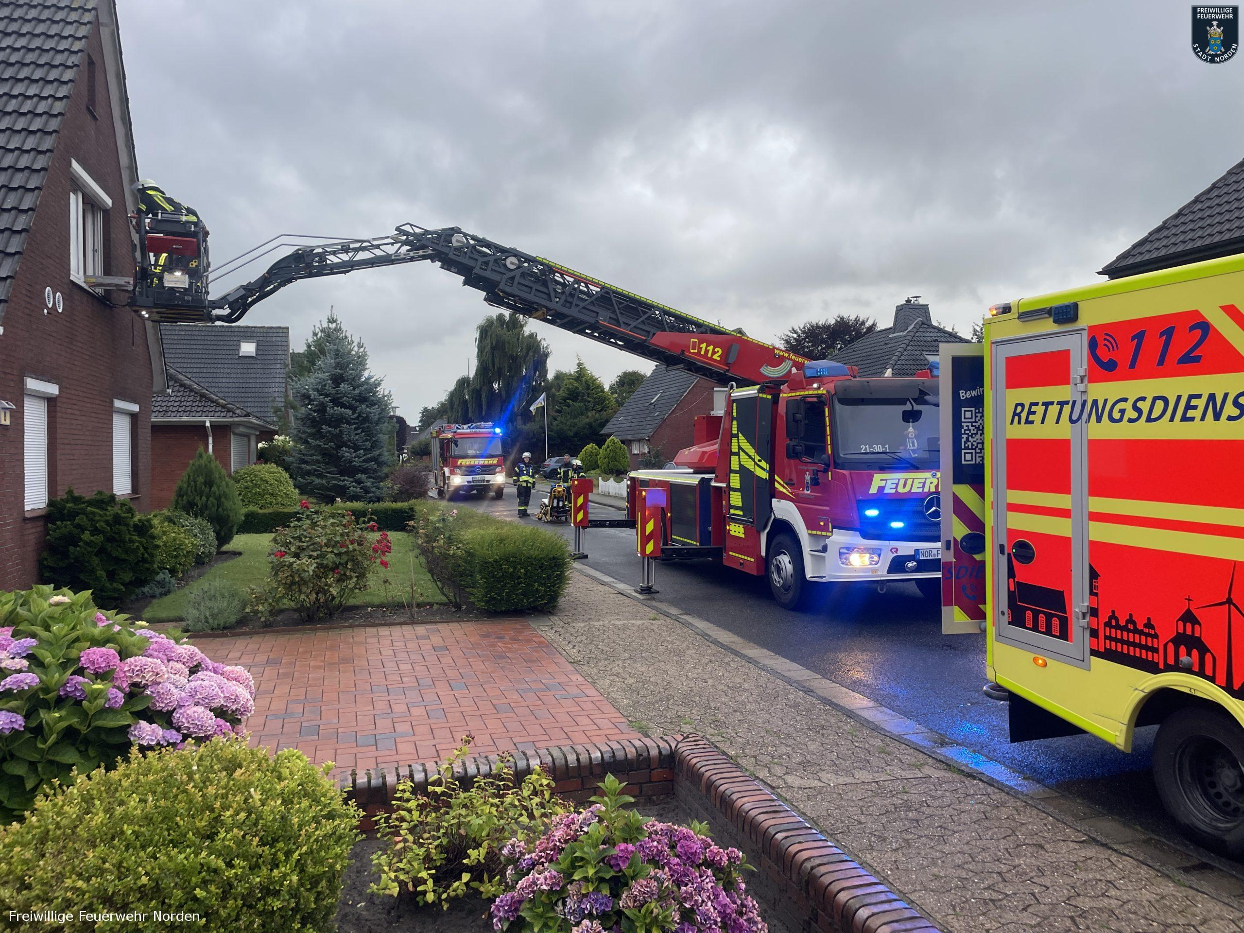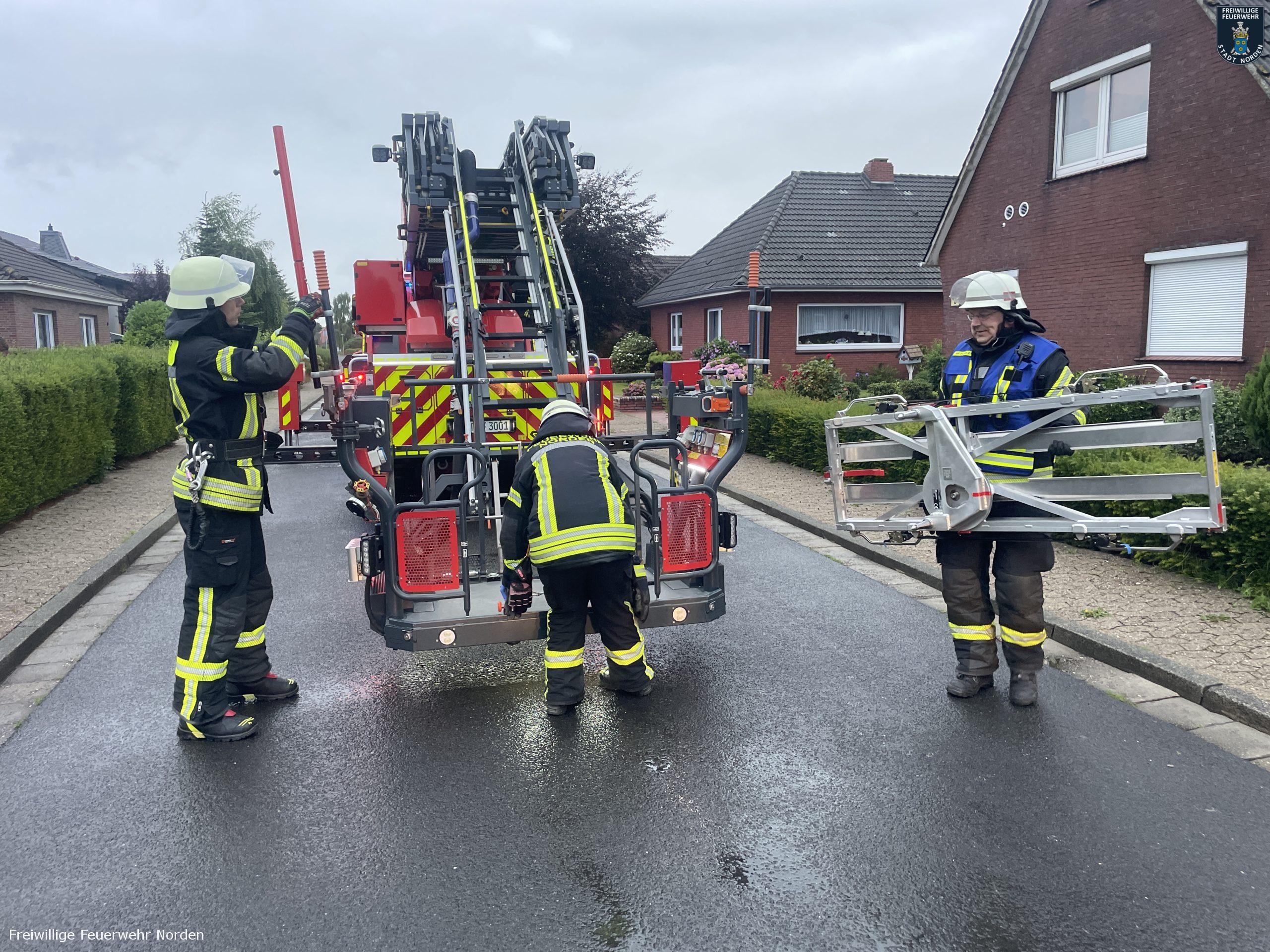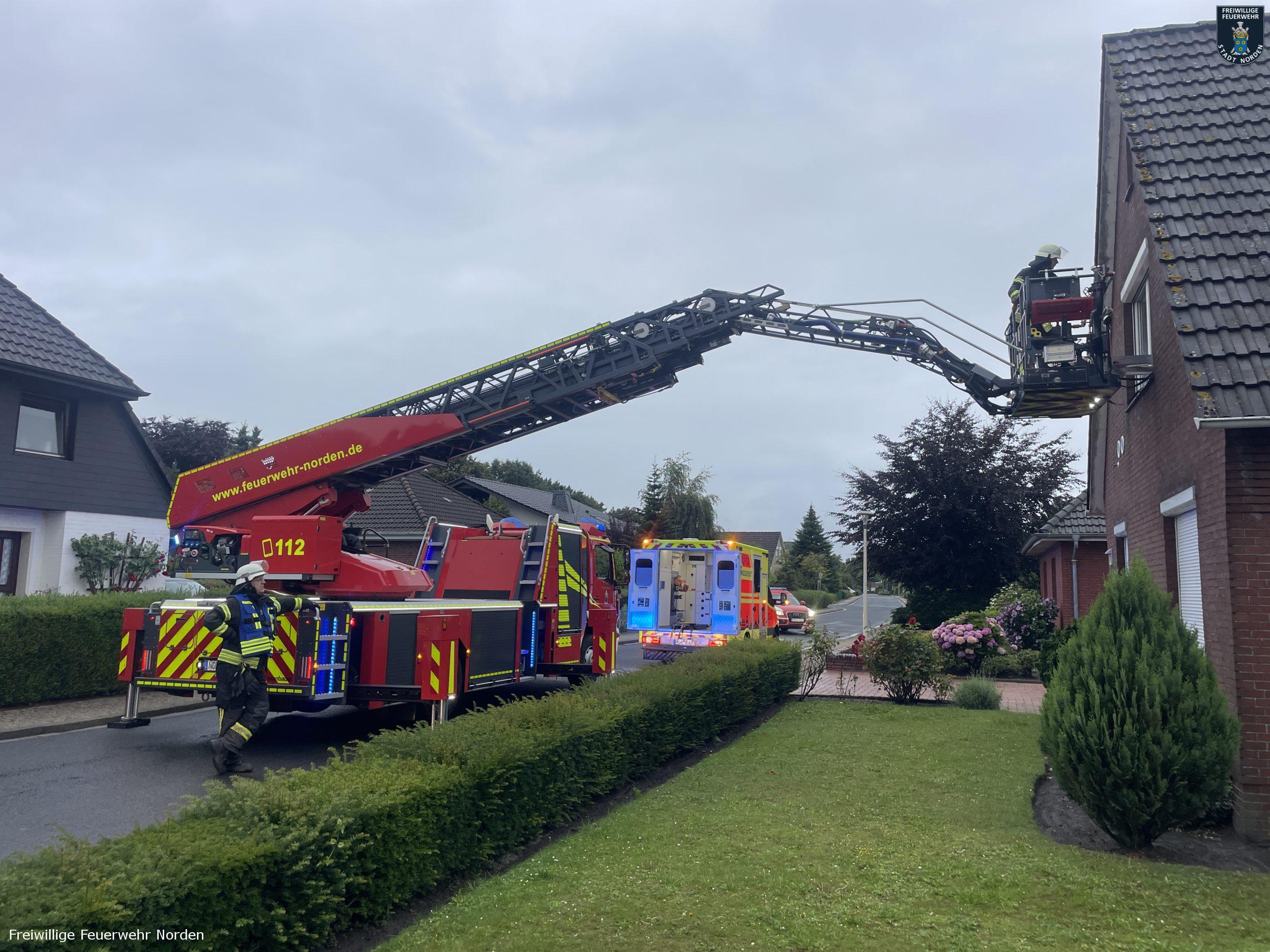 Zur Unterstützung beim Transport einer Notfallpatientin, hat der Rettungsdienst am Sonntagmorgen die Freiwillige Feuerwehr Norden angefordert. Eine Rettungswagenbesatzung behandelte eine Seniorin im Dachgeschoss ihres Einfamilienhauses im Eschenweg in Norden. Die Patientin sollte möglichst wenig bewegt werden. Das Treppenhaus war baulich jedoch nicht für solch einen Transport geeignet. Daher war die Drehleiter der Norder Feuerwehr das Mittel der Wahl. Gegen 7 Uhr rückten die Feuerwehrleute an und unterstützten den Transport durch ein Fenster auf den Korb der Leiter. Nach wenigen Minuten lag die Frau im Rettungswagen.
