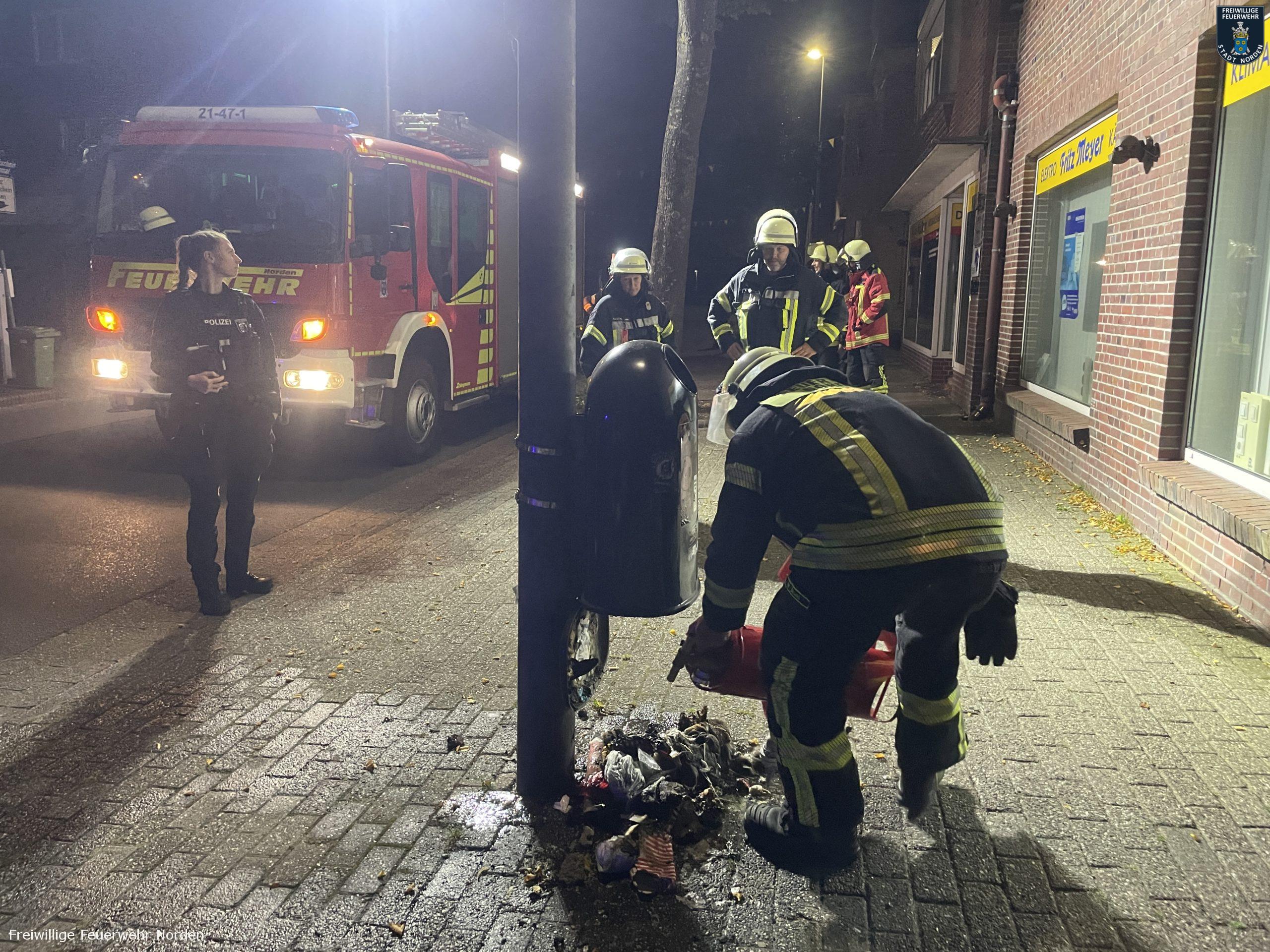 Ein Mülleimer hat am späten Montagabend in Norden in der Westerstraße vor einem Geschäft gebrannt. Der Brand wurde gegen 22.30 Uhr von einer Passantin entdeckt und per Notruf von ihr gemeldet. Ein Anwohner bemerkte den Brand ebenfalls und löschte das Feuer mit einem Eimer Wasser. Die alarmierte Freiwillige Feuerwehr Norden löschte den verkohlten Müll mit einer Kübelspritze noch einmal nach. Die Polizei hat den Vorfall aufgenommen.