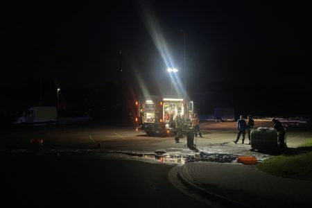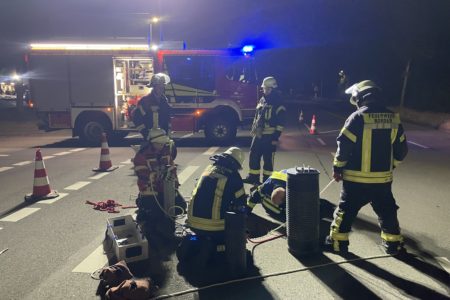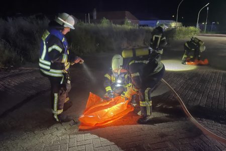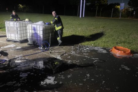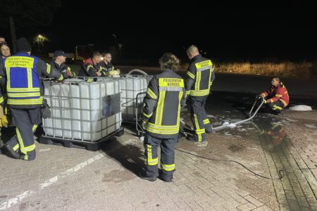 Parallel zu den Löscharbeiten liefen weitere Umweltschutzmaßnahmen. So wurde in der Kanalisation ein Rohrdichtkissen gesetzt und kontaminiertes Löschwasser dort aufgestaut. Eine Fachfirma wird das Gemisch im Laufe des Vormittags absaugen und die Kanalisation reinigen. Auch die Parkflächen sollen von der Firma gereinigt werden. Da das Unternehmen in der Nacht nicht zeitnah zum Einsatzort kommen konnte, musste die Feuerwehr sich um das aufgestaute Löschwasser auf dem Parkplatz kümmern. Mit einer Pumpe saugten sie diese ab und füllten sie in zwei große Behälter. Im Norder Tief wurde vorsichtshalber eine Ölsperre installiert.