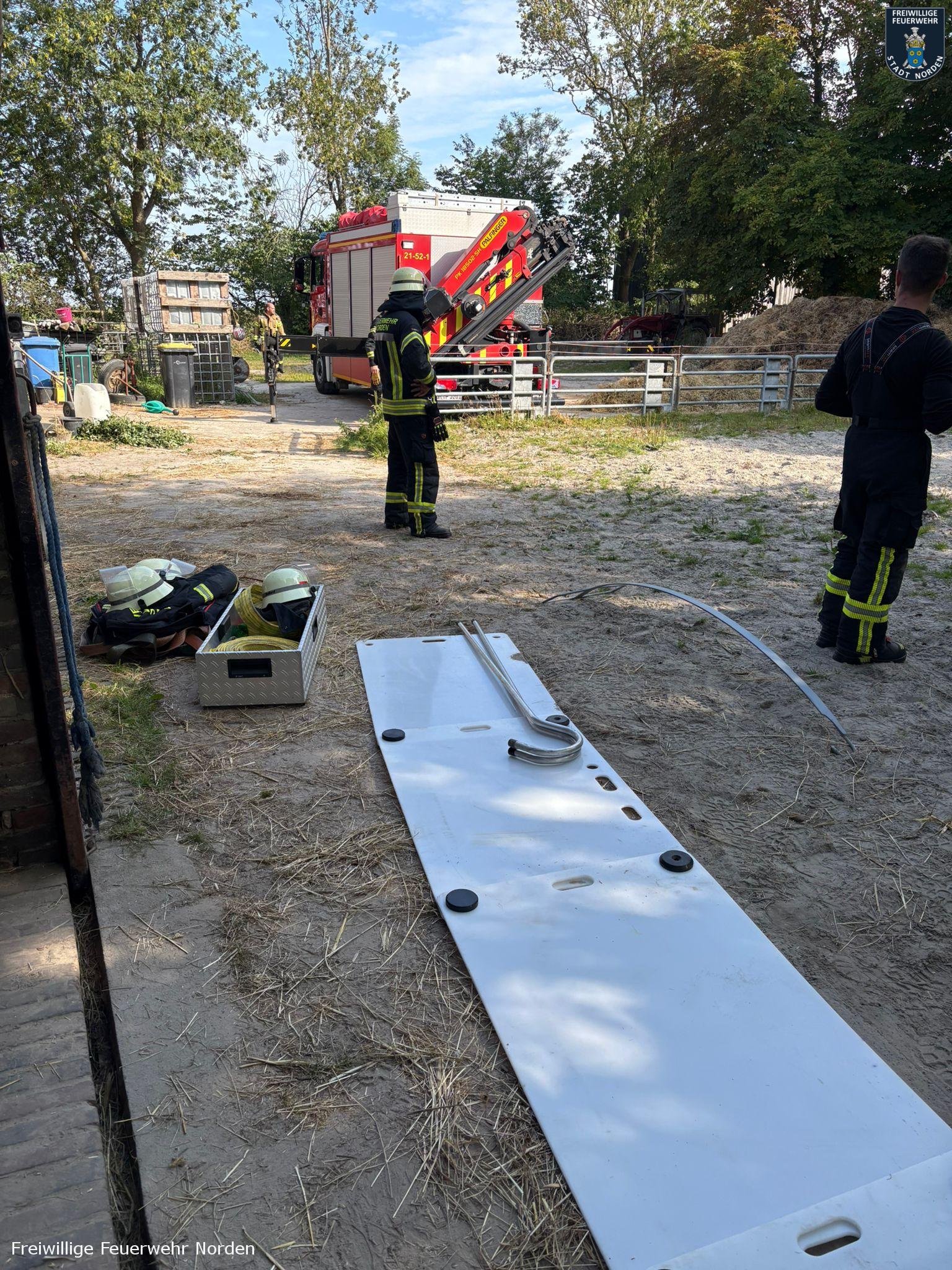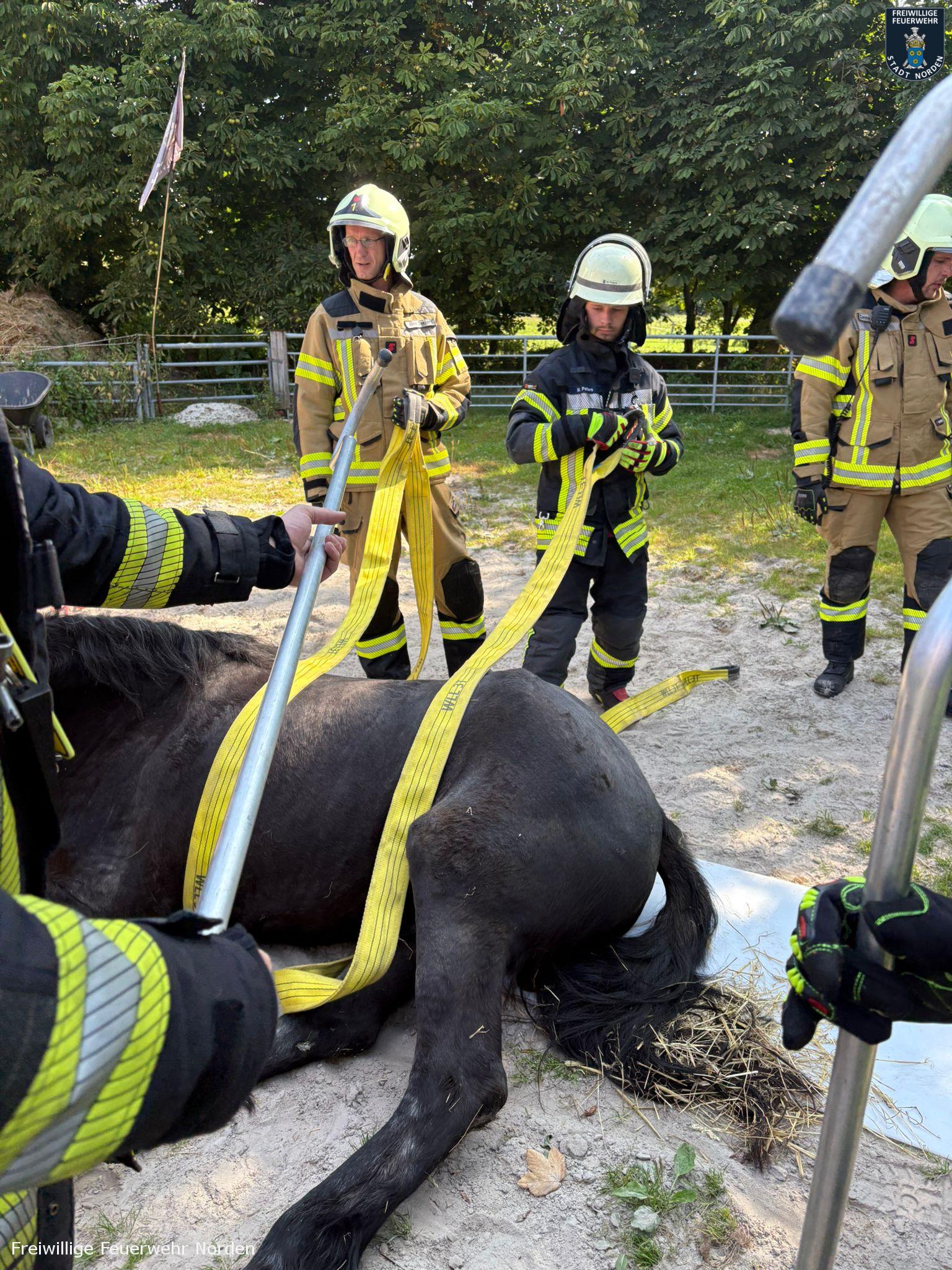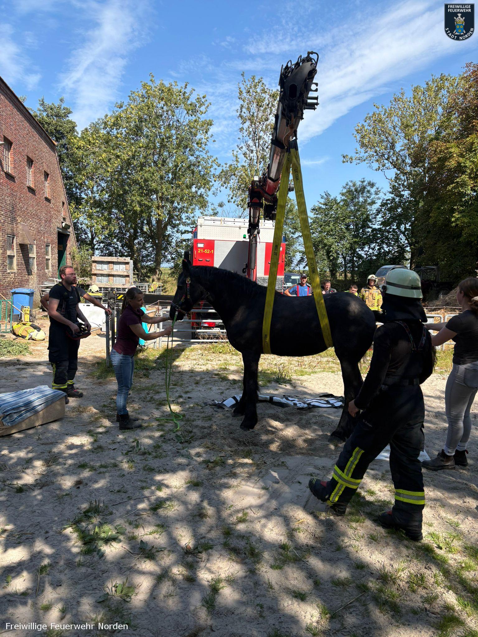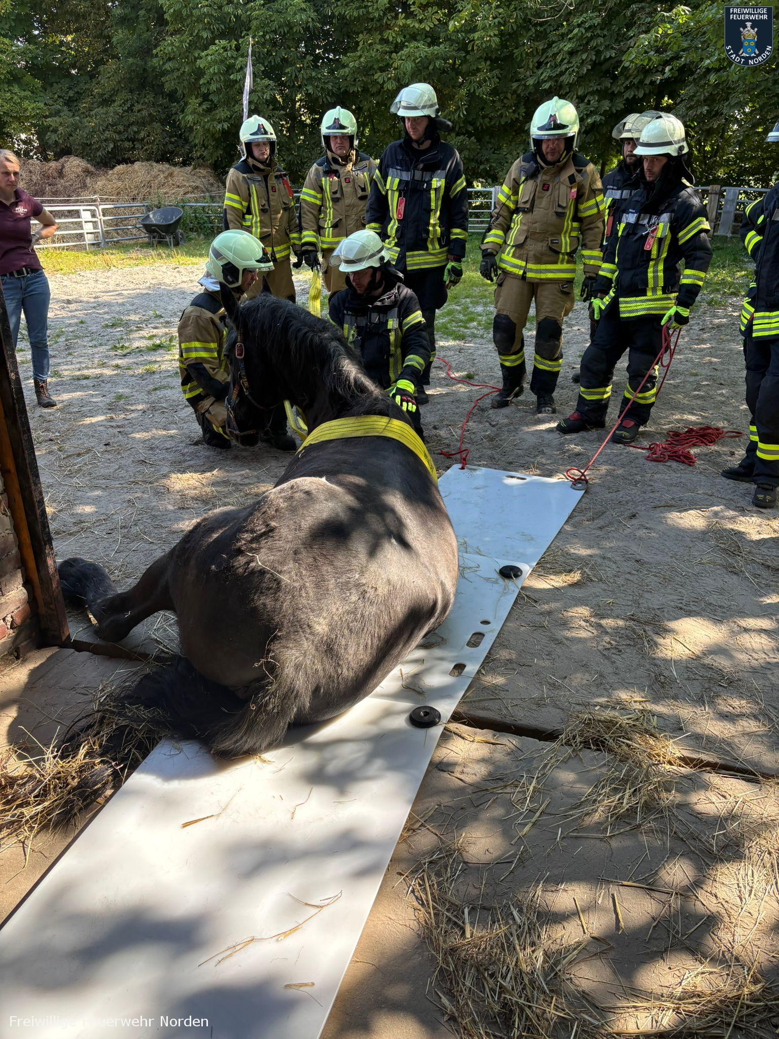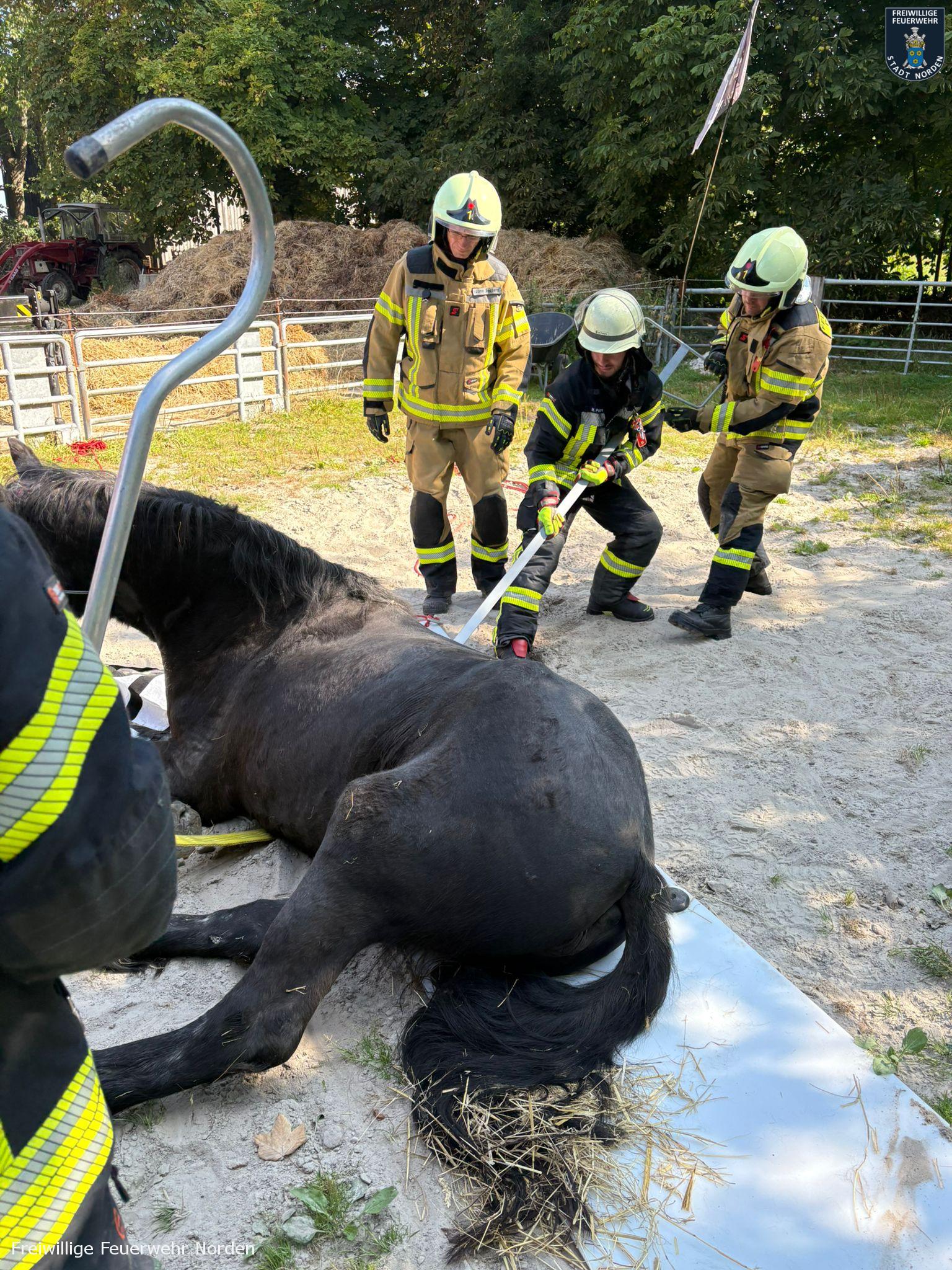 Zur Unterstützung der Freiwilligen Feuerwehren der Gemeinde Dornum wurde am Dienstagvormittag der bei der Freiwilligen Feuerwehr Norden stationierte Rüstwagen-Kran (RW-K) des Landkreises Aurich alarmiert. Auf einem landwirtschaftlichen Betrieb in der Straße Frienhorn im Dornumer Ortsteil Dornumergrode lag ein Pferd in einer Pferdebox und konnte aus eigener Kraft nicht mehr aufstehen. Da der Einsatz des Kranes vom Rüstwagen aufgrund der beengten Verhältnisse im Stall nicht möglich war, wurde das Pferd von einem Tierarzt sediert und von den Einsatzkräften der Feuerwehren mit Muskelkraft auf sog. Rutschplatten aus dem Stall gezogen. Auf dem Longierplatz wurde dann das Pferd mit speziellen Gerätschaften für die Großtierrettung und dem Kran vom Rüstwagen wieder auf die Beine gestellt. Das Tier blieb augenscheinlich unverletzt. Die Freiwillige Feuerwehr Norden hat regelmäßig das Thema Großtierrettung auf ihrem Dienstplan.