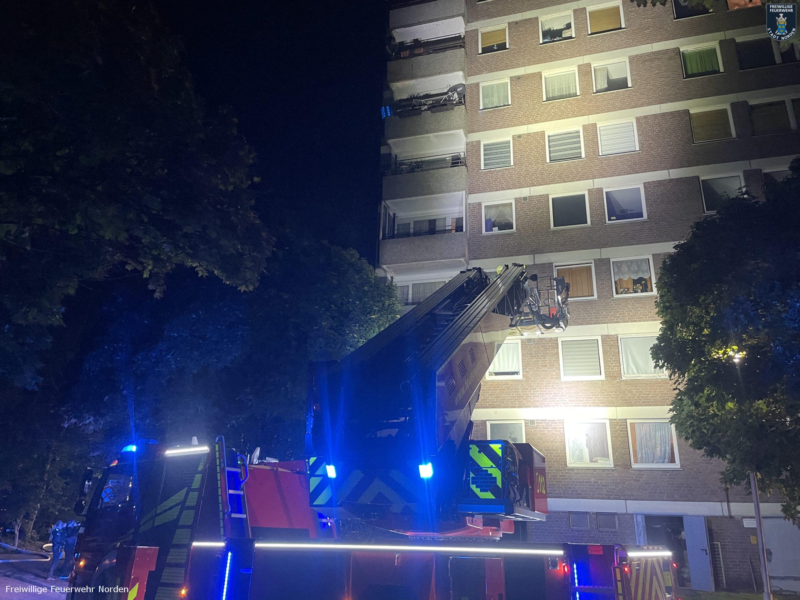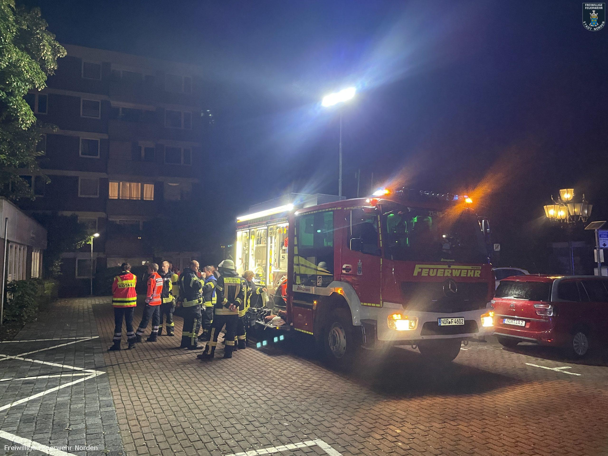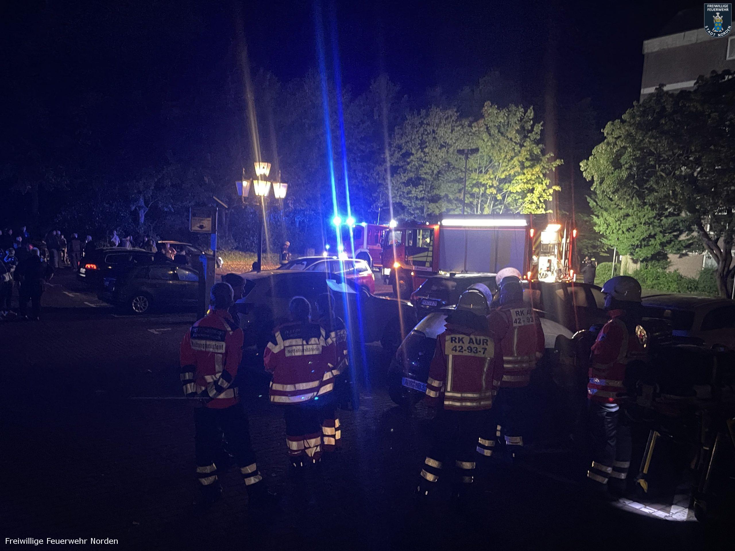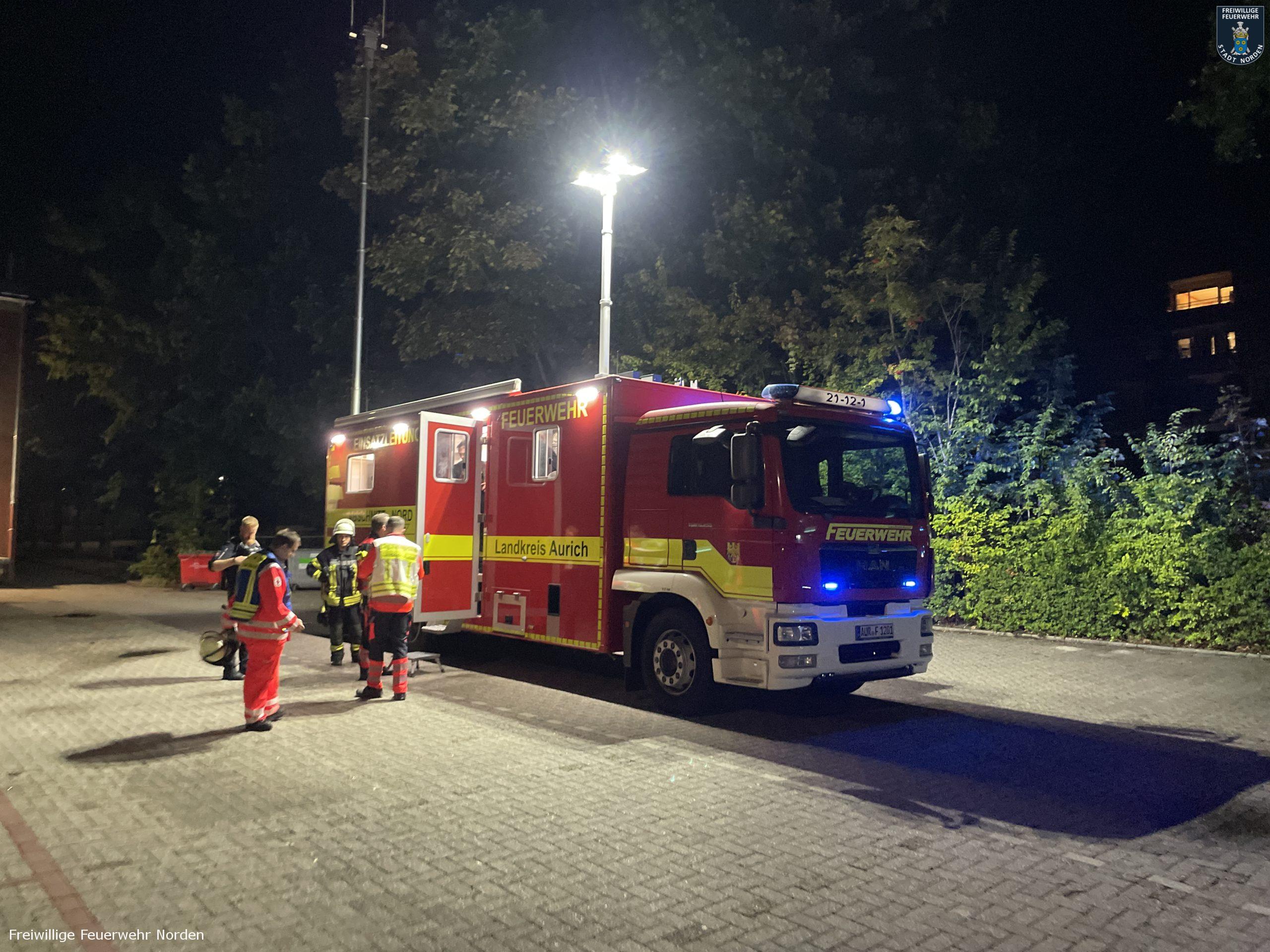 Großeinsatz auf dem Jan-ten-Doornkaat-Koolman-Platz in Norden in der Nacht zu Dienstag. Gegen 2.05 Uhr hatten dort Bewohner eines achtstöckigen Wohnblocks Rauch im Gebäude entdeckt und den Notruf gewählt. Die alarmierte Freiwillige Feuerwehr Norden stellte bei ihrer Erkundung ein Feuer im Keller fest. Nachdem durch den Brand in einem Kellerraum vermutlich eine Spraydose explodierte, schlugen die Flammen sogar aus einem Kellerfenster ins Freie und setzen dort einen Busch in Brand. Dicker Rauch umhüllte insgesamt zwei Wohnblöcke. Beide sind baulich miteinander verbunden. Da in der Nacht nur wenig Wind wehte und die Luft sehr feucht war, zog der Rauch kaum ab. Durch geöffnete Fenster und Türen verteilte sich der Qualm dann in beide Gebäude, sodass die Einsatzkräfte von Feuerwehr und Polizei insgesamt rund 80 Bewohner evakuieren mussten. Alle blieben unverletzt. Unter den Evakuierten befand sich auch eine Mitarbeiterin eines Kindergartens, welcher sich ebenfalls auf dem Koolman-Platz befindet. Sie öffnete das Gebäude, sodass das Deutsche Rote Kreuz diverser Ortsvereine und der Rettungsdienst des Landkreises Aurich die Bewohner dort betreuen konnten. Während sich nahezu alle Hausbewohner ruhig und sachlich verhielten, geriet ein Bewohner in Rage. Mehrfach ging er Feuerwehrleute verbal an, weil seine Wohnungstür durch die Einsatzkräfte gewaltsam geöffnet wurde. Erst die Polizei konnte den Mann zur Besinnung bringen und beruhigen.