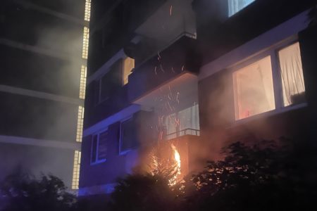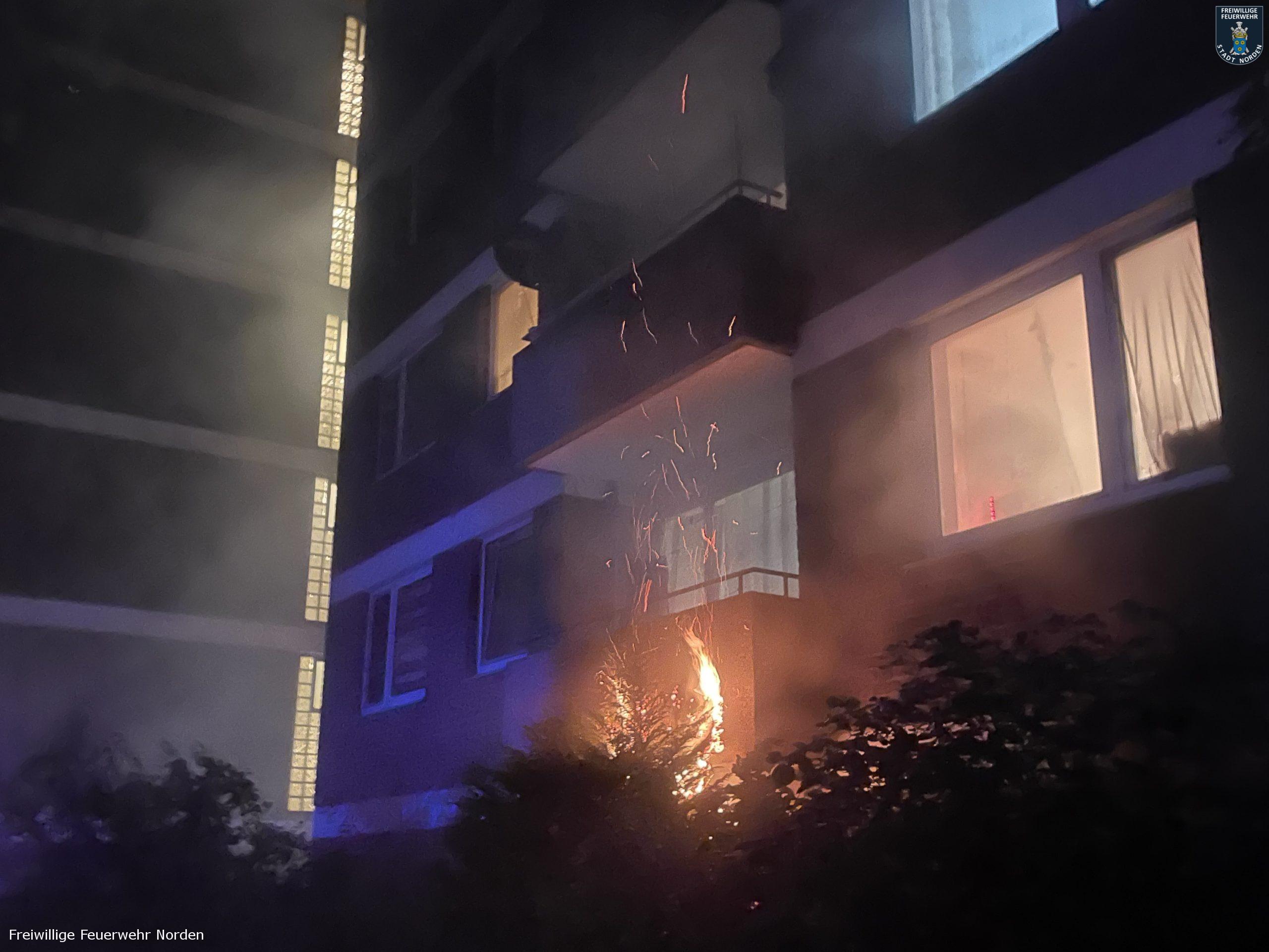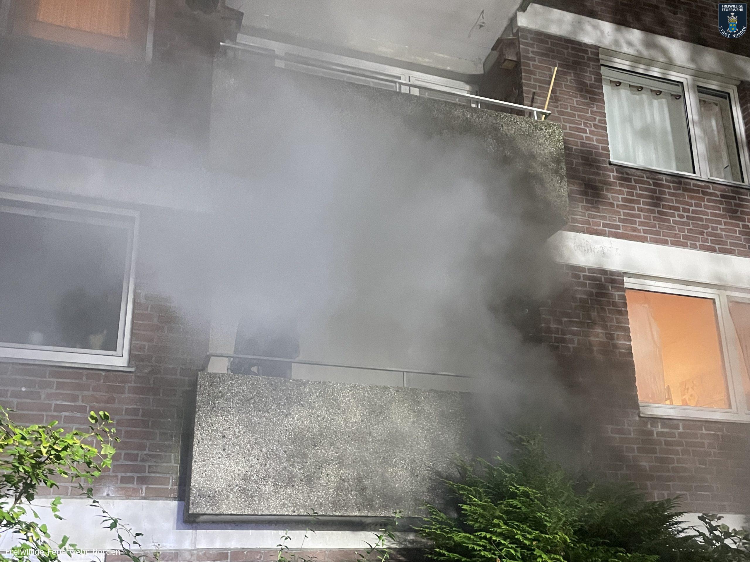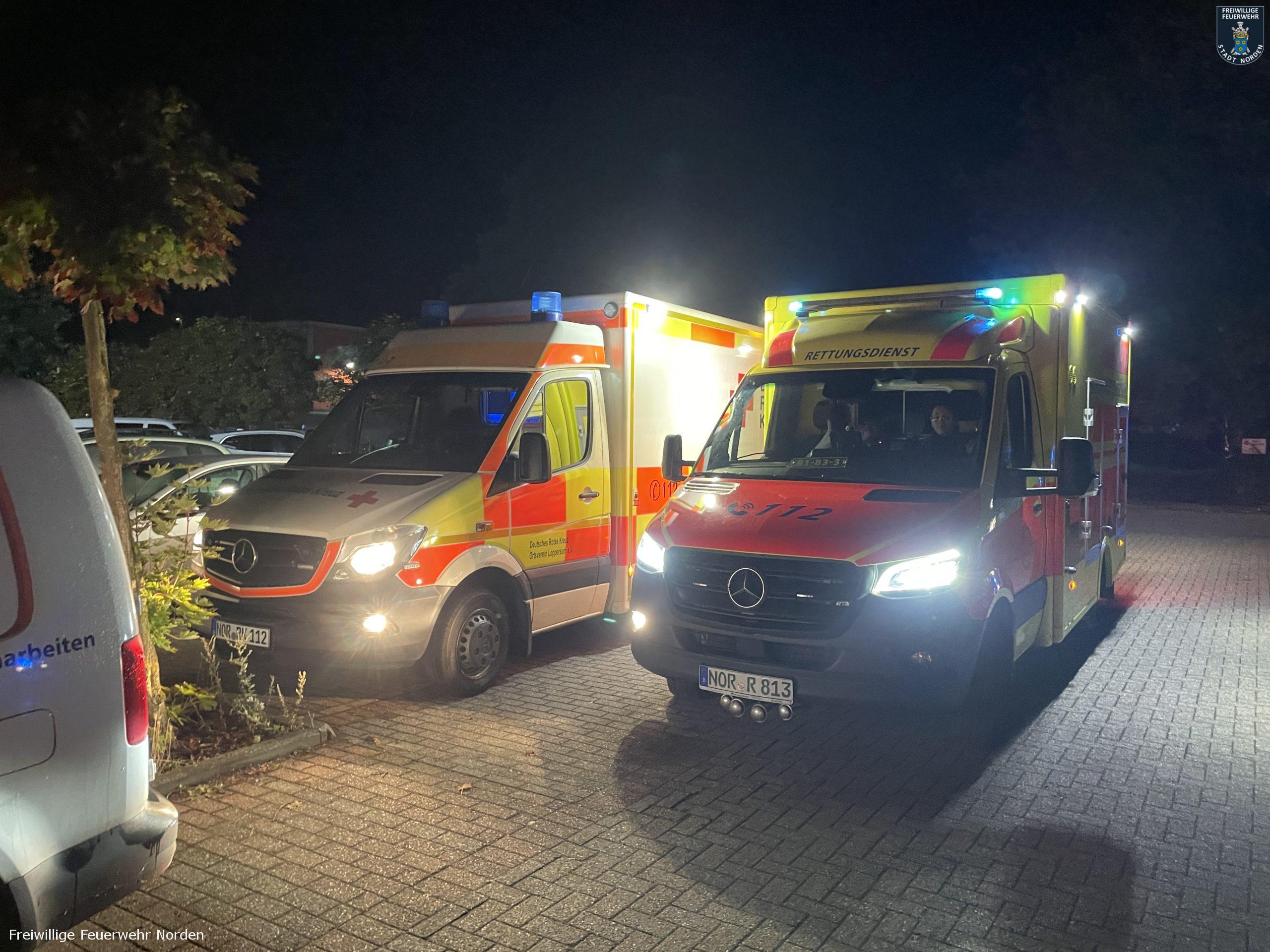 Großeinsatz auf dem Jan-ten-Doornkaat-Koolman-Platz in Norden in der Nacht zu Dienstag. Gegen 2.05 Uhr hatten dort Bewohner eines achtstöckigen Wohnblocks Rauch im Gebäude entdeckt und den Notruf gewählt. Die alarmierte Freiwillige Feuerwehr Norden stellte bei ihrer Erkundung ein Feuer im Keller fest. Nachdem durch den Brand in einem Kellerraum vermutlich eine Spraydose explodierte, schlugen die Flammen sogar aus einem Kellerfenster ins Freie und setzen dort einen Busch in Brand. Dicker Rauch umhüllte insgesamt zwei Wohnblöcke. Beide sind baulich miteinander verbunden. Da in der Nacht nur wenig Wind wehte und die Luft sehr feucht war, zog der Rauch kaum ab. Durch geöffnete Fenster und Türen verteilte sich der Qualm dann in beide Gebäude, sodass die Einsatzkräfte von Feuerwehr und Polizei insgesamt rund 80 Bewohner evakuieren mussten. Alle blieben unverletzt. Unter den Evakuierten befand sich auch eine Mitarbeiterin eines Kindergartens, welcher sich ebenfalls auf dem Koolman-Platz befindet. Sie öffnete das Gebäude, sodass das Deutsche Rote Kreuz diverser Ortsvereine und der Rettungsdienst des Landkreises Aurich die Bewohner dort betreuen konnten. Während sich nahezu alle Hausbewohner ruhig und sachlich verhielten, geriet ein Bewohner in Rage. Mehrfach ging er Feuerwehrleute verbal an, weil seine Wohnungstür durch die Einsatzkräfte gewaltsam geöffnet wurde. Erst die Polizei konnte den Mann zur Besinnung bringen und beruhigen.