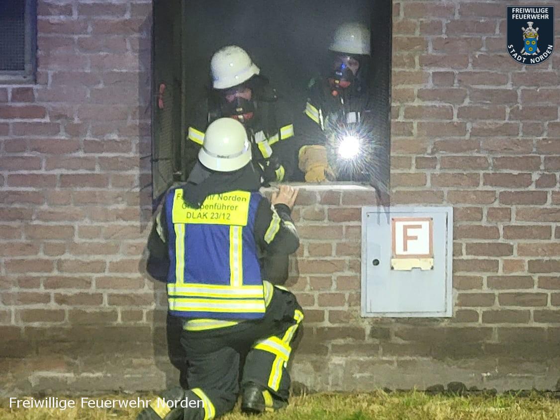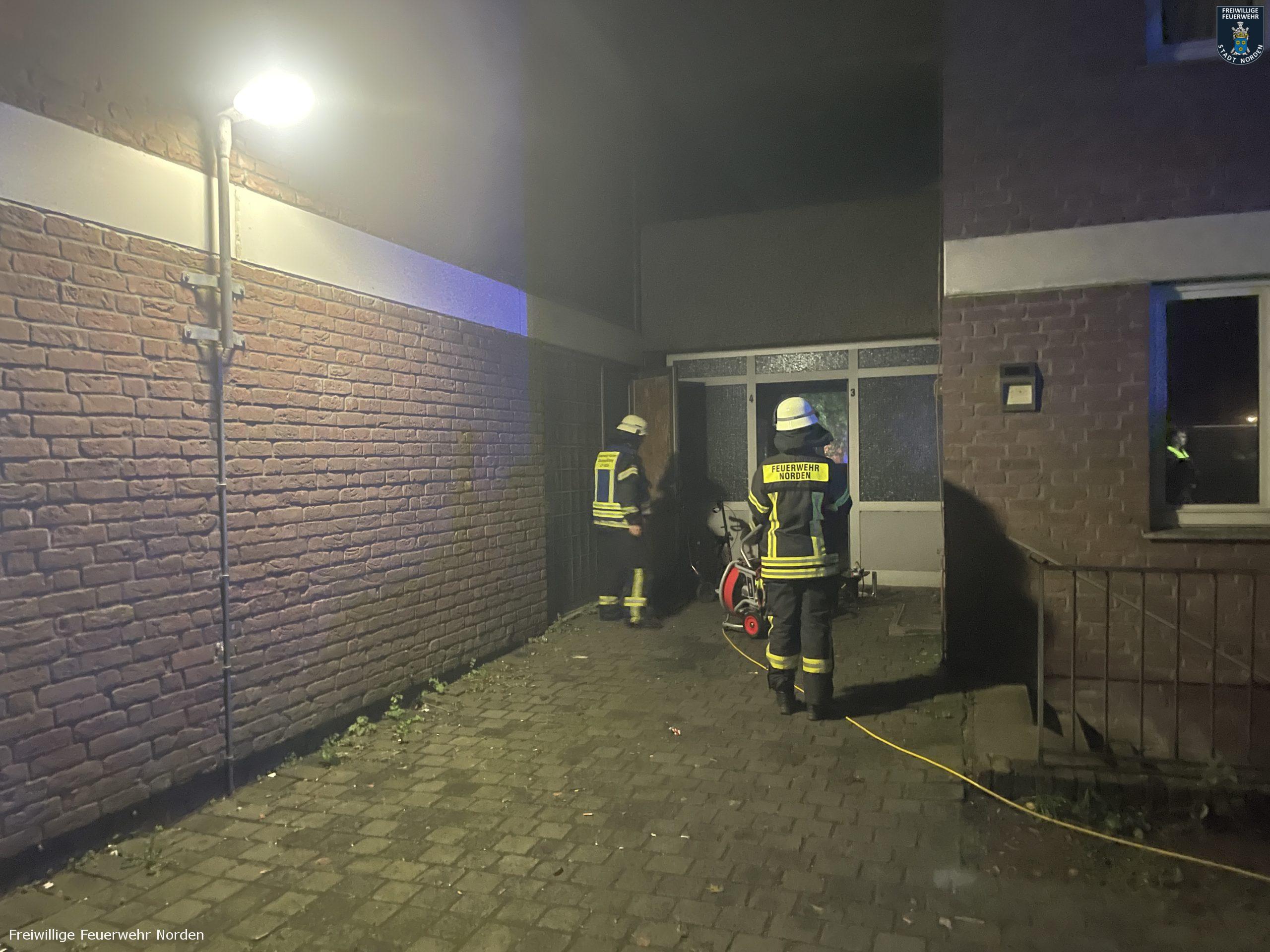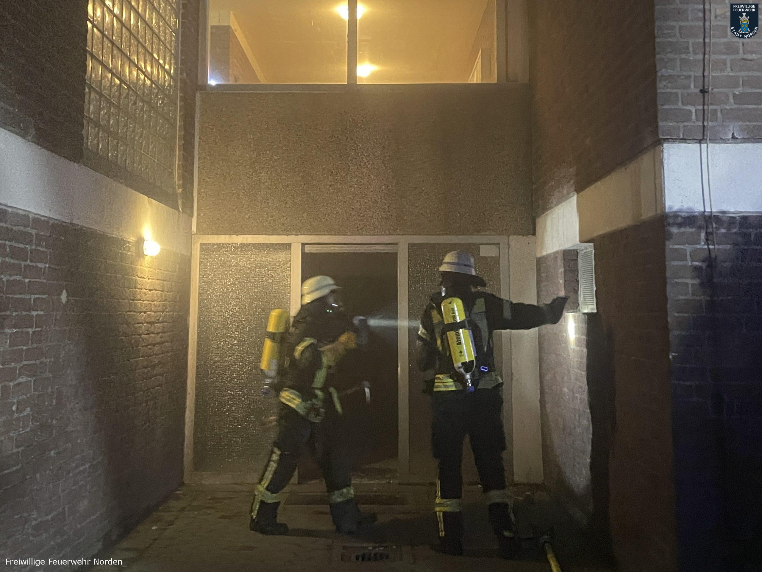 Die Feuerwehr konnte einige Teile der Gebäude nur mit Atemschutzgeräten betreten, um die Bewohner aus den verrauchten Treppenhäusern zu führen und im Keller die Brandbekämpfung durchzuführen. Das Feuer konnten sie schnell lokalisieren und löschen. Durch den Brand wurde die Elektroinstallation im Keller derart beschädigt, dass die Stadtwerke Norden den Strom in einer der beiden Blöcke abschalten musste. Durch intensive Belüftungsmaßnahmen und umsichtiges Handeln der Feuerwehr konnten die Rauchschäden in den Wohnbereichen allerdings auf ein Minimum begrenzt werden. Sodass die Gebäude für die Bewohner wieder freigegeben werden konnten. Die Hausverwaltung beauftragte noch in der Nacht die ersten Handwerker, damit die ersten wichtigen Instandsetzungsarbeiten eingeleitet werden konnten. Gegen 5.15 Uhr konnten die letzten Einsatzkräfte den Einsatzort verlassen. Insgesamt waren mehr als 120 Einsatzkräfte unterschiedlicher Organisationen aus dem gesamten Landkreis im Einsatz.