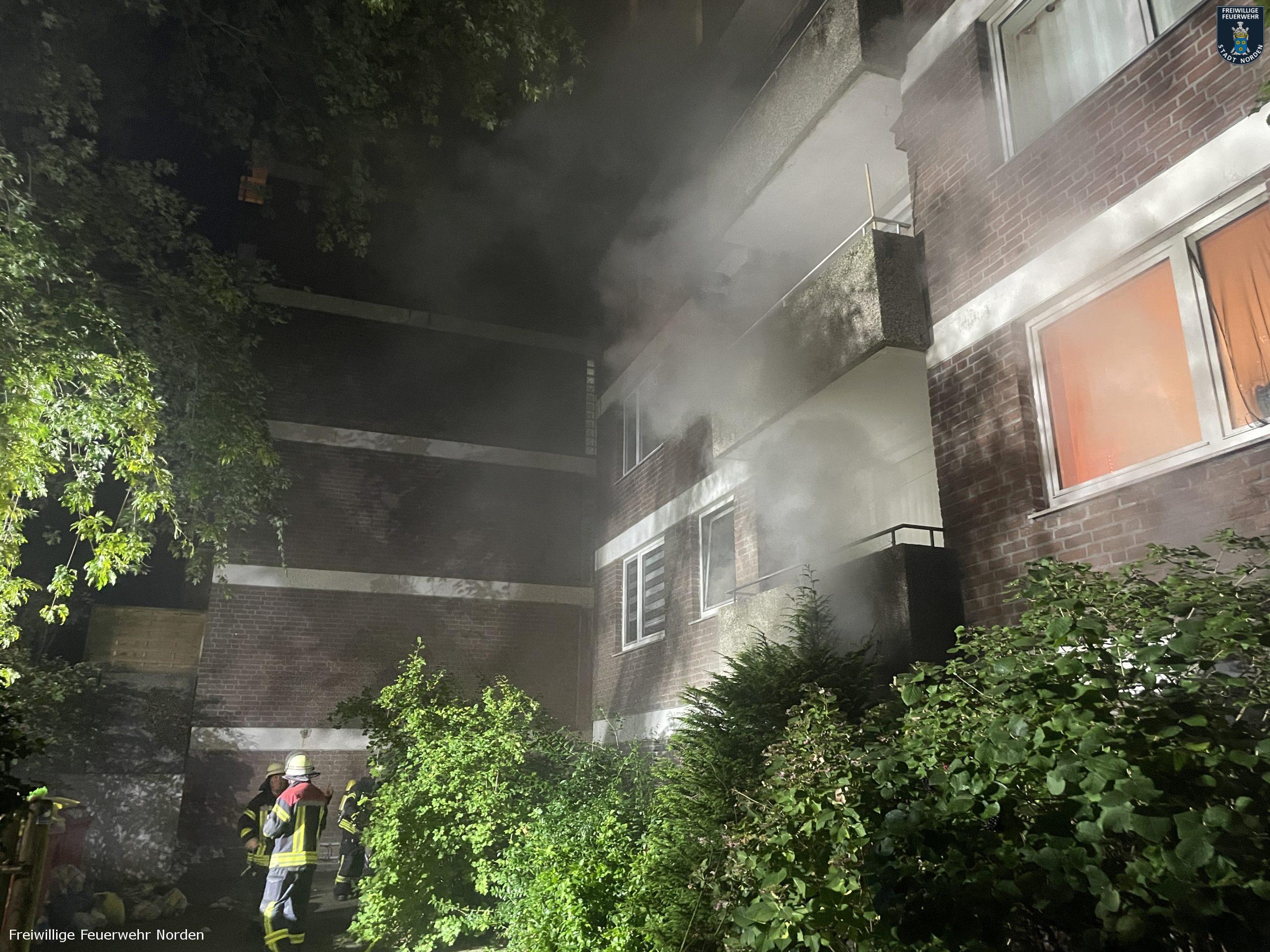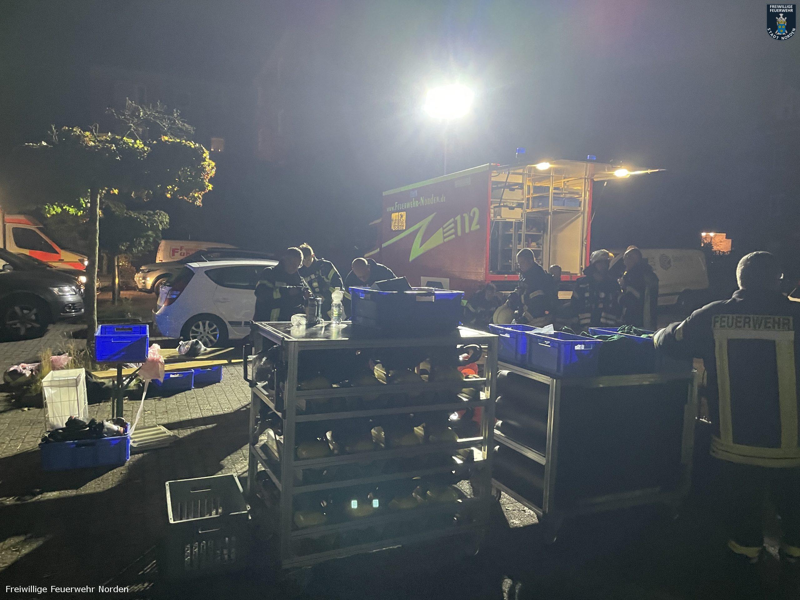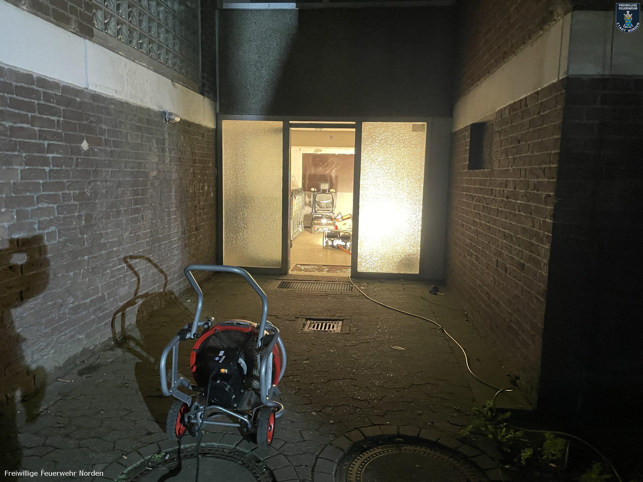 Die Feuerwehr konnte einige Teile der Gebäude nur mit Atemschutzgeräten betreten, um die Bewohner aus den verrauchten Treppenhäusern zu führen und im Keller die Brandbekämpfung durchzuführen. Das Feuer konnten sie schnell lokalisieren und löschen. Durch den Brand wurde die Elektroinstallation im Keller derart beschädigt, dass die Stadtwerke Norden den Strom in einer der beiden Blöcke abschalten musste. Durch intensive Belüftungsmaßnahmen und umsichtiges Handeln der Feuerwehr konnten die Rauchschäden in den Wohnbereichen allerdings auf ein Minimum begrenzt werden. Sodass die Gebäude für die Bewohner wieder freigegeben werden konnten. Die Hausverwaltung beauftragte noch in der Nacht die ersten Handwerker, damit die ersten wichtigen Instandsetzungsarbeiten eingeleitet werden konnten. Gegen 5.15 Uhr konnten die letzten Einsatzkräfte den Einsatzort verlassen. Insgesamt waren mehr als 120 Einsatzkräfte unterschiedlicher Organisationen aus dem gesamten Landkreis im Einsatz.