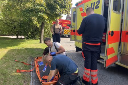 Ein Notfallpatient des Rettungsdienstes musste am Sonnabend in Norden mit Hilfe der Drehleiter der Feuerwehr aus einem Einfamilienhaus transportiert werden. Die Besatzung eines Rettungswagens sowie ein Notarzt behandelten in der Mittagszeit einen Mann im Dachgeschoss seines Hauses im Grasweg. Sowohl der Gesundheitszustand des Mannes als auch die bauliche Situation im Gebäudeinneren ließen einen Transport mittels Trage oder Tragetuch nicht zu. Der schonendste Weg zum Rettungswagen führte durch ein Fenster auf den Korb der Drehleiter. Hand in Hand arbeiteten Rettungsdienst und die Freiwillige Feuerwehr Norden zusammen und bewältigten die Transportaufgabe gemeinsam.