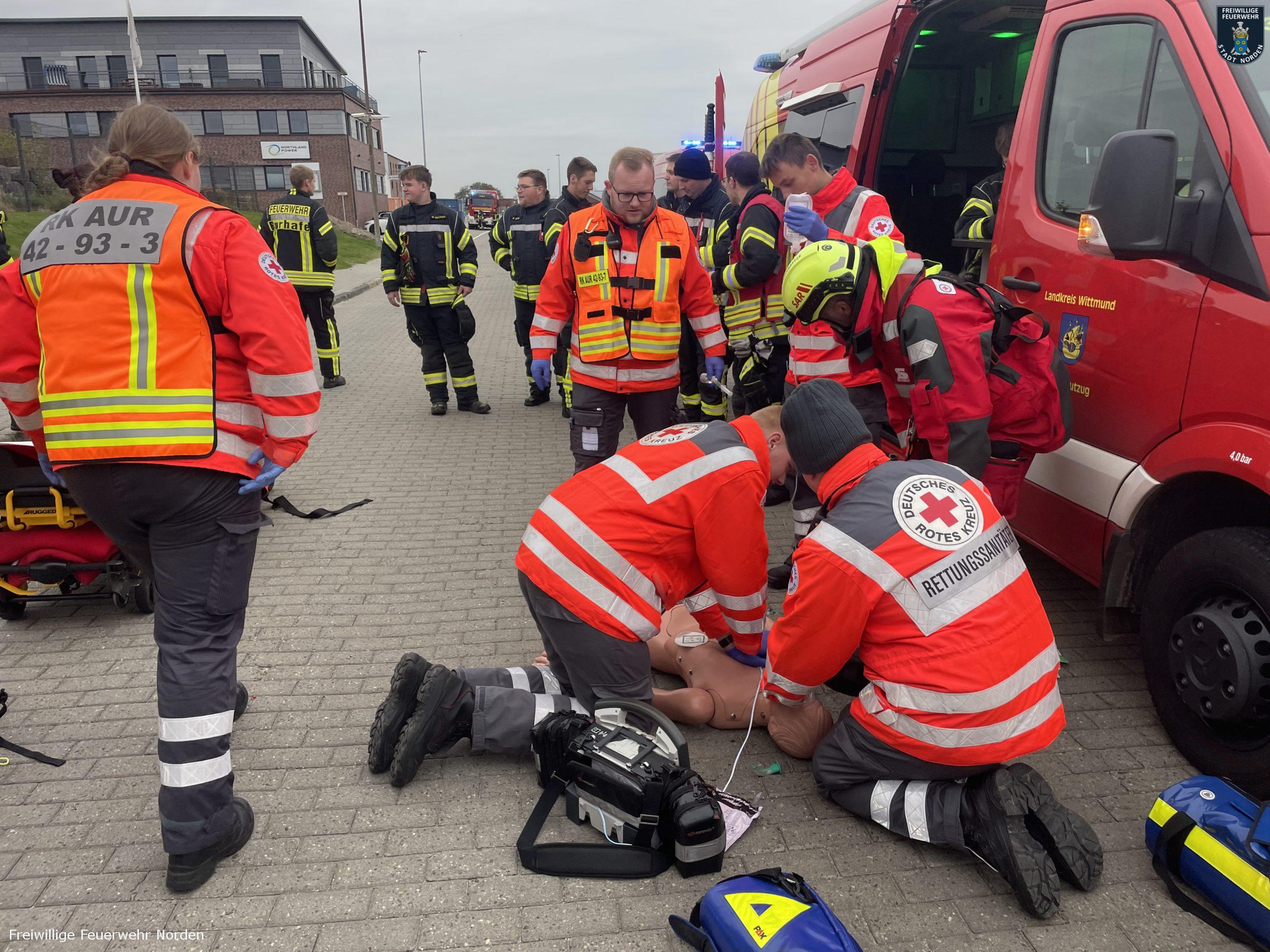 Rund 200 Einsatzkräfte aus ganz Ostfriesland haben am Sonnabend im Norddeicher Osthafen und im Seegebiet zwischen Festland und den Inseln eine Großübung durchgeführt. Diverse Einheiten der Feuerwehren, des Deutschen Roten Kreuzes, der Seenotretter, die Leitstelle Ostfriesland, der Hafenbetreiber NPorts, das Hubschrauberunternehmen Northern Helicopter (NHC),die Entsorgungsreederei sowie die AG Reederei Norden-Frisia übten mehrere Stunden einen Gefahrstoffeinsatz auf einem Frachtschiff.