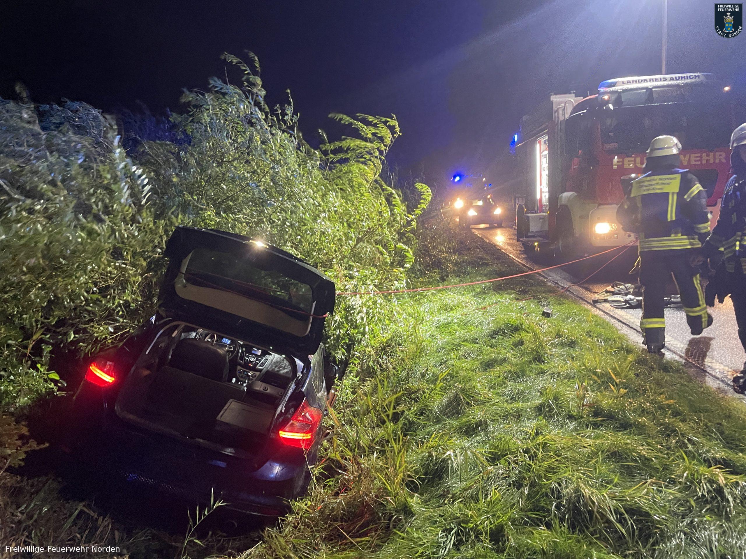 Eine Autofahrerin ist am Sonntag gegen 22.30 Uhr in Norden mit ihrem Pkw von der Ostermarscher Straße abgekommen. Der Ford landete neben der Landstraße in einem Graben und kam in einem großen Busch zum Stehen. Die Frau konnte den Wagen jedoch nicht verlassen, da sich die Fahrzeugtüren nicht öffnen ließen. Andere Verkehrsteilnehmer betreuten die Verunfallte gemeinsam mit dem Rettungsdienst. Mitgliedern der Freiwilligen Feuerwehr Norden gelang es schließlich die Frau ohne technische Hilfsmittel durch den Kofferraum zu befreien. Der Rettungsdienst brachte die augenscheinlich unverletzte Fahrerin zur Kontrolle in ein Krankenhaus. Die Polizei nahm den Unfall auf und hat die Ermittlungen zur Unfallursache eingeleitet.