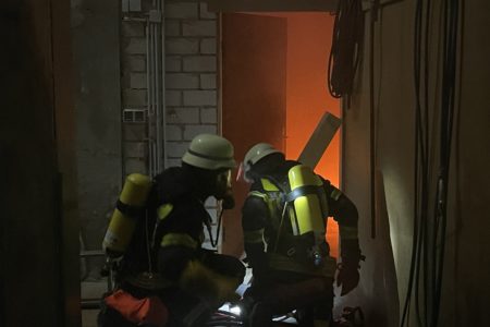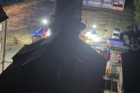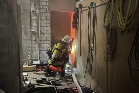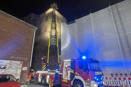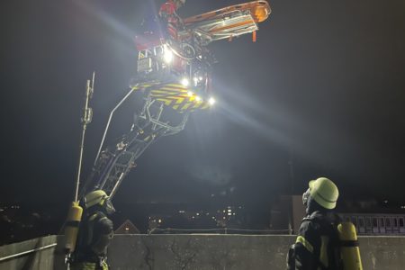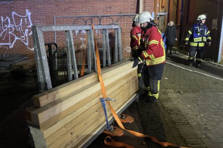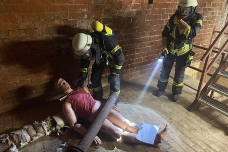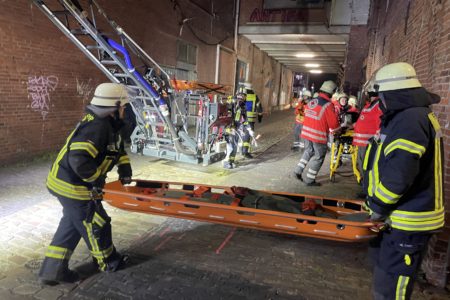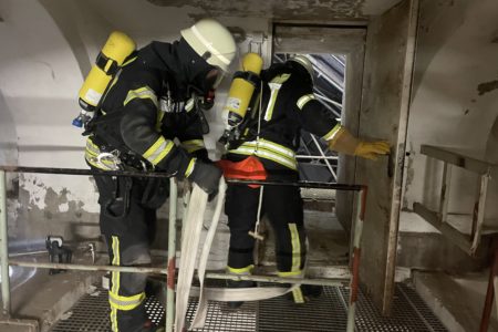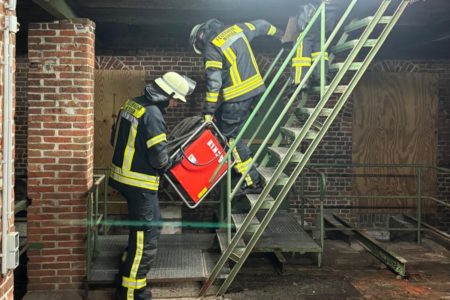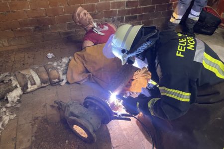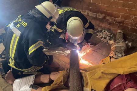 Im „alten Wasserhaus“ hatten weitere Feuerwehrleute ebenfalls eine eingeklemmte Person gefunden. Diese lag im vierten Obergeschoss. Der Weg dorthin führt nur über schmale und steile Treppen. Ein schweres Stahlrohr lag auf den Beinen der Person. Die Befreiung sollte nach Übungsvorgabe nur mit einem Plasmaschneider gelangen. Das elektrische Gerät kann dicken Stahl zum Schmelzen bringen und mit Druckluft einen feinen Schnitt schaffen. Doch der Transport und Aufbau des Rettungsgerätes hätte durch das Treppenhaus viel Personal und wichtige Zeit in Anspruch genommen. Die Einsatzkräfte entschieden daher, die erforderliche Ausrüstung mit der Drehleiter auf das Dach der 5. Etage zu heben und von dort nur eine Ebene tiefer zu tragen. Die Befreiung mit dem Schneidgerät ging dann ganz schnell.