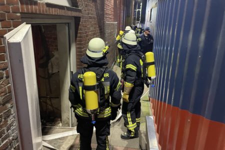 Zunächst stellten die Handwerker bei ihren Arbeiten Gasgeruch fest. Daraufhin riefen sie die Feuerwehr und stellten die Gasversorgung für das Gebäude ab. Als die ersten Einsatzkräfte ausrückten, kam es dann zu einer leichten Explosion im „alten Wasserhaus“, so die Gebäudebezeichnung aus früheren Doornkaatzeiten. Stadtbrandmeister Thomas Kettler wird bei seiner Ankunft von Stadtwerkemitarbeiter Heiko Rohdemann am Heizkraftwerk empfangen. So wie er die Lage schildert, sind durch die Explosion mehrere kleinere Folgebrände in dem fünfstöckigen Gebäude ausgebrochen. Mehrere Personen müssen sich aber noch in dem Gebäude befinden. Heiko Rohdemann hatte die Übung gemeinsam mit Nordens stellvertretendem Stadtbrandmeister Thomas Weege und dem Zugführer des vierten Zuges Ralf Scharfenort ausgearbeitet und vorbereitet.